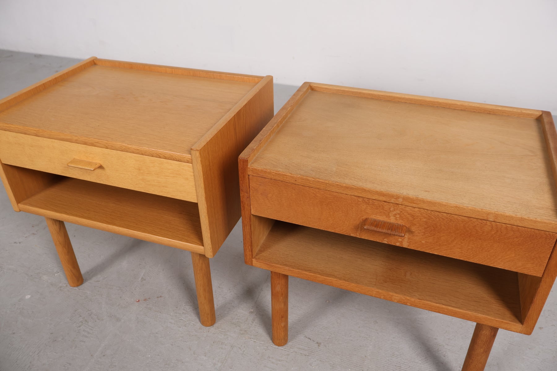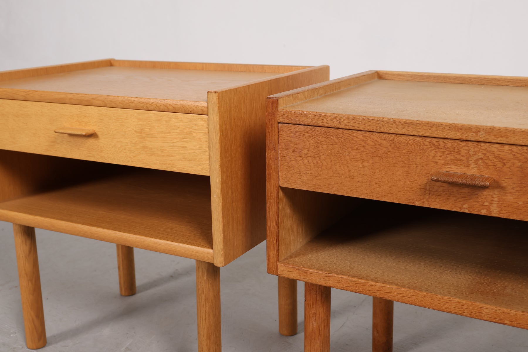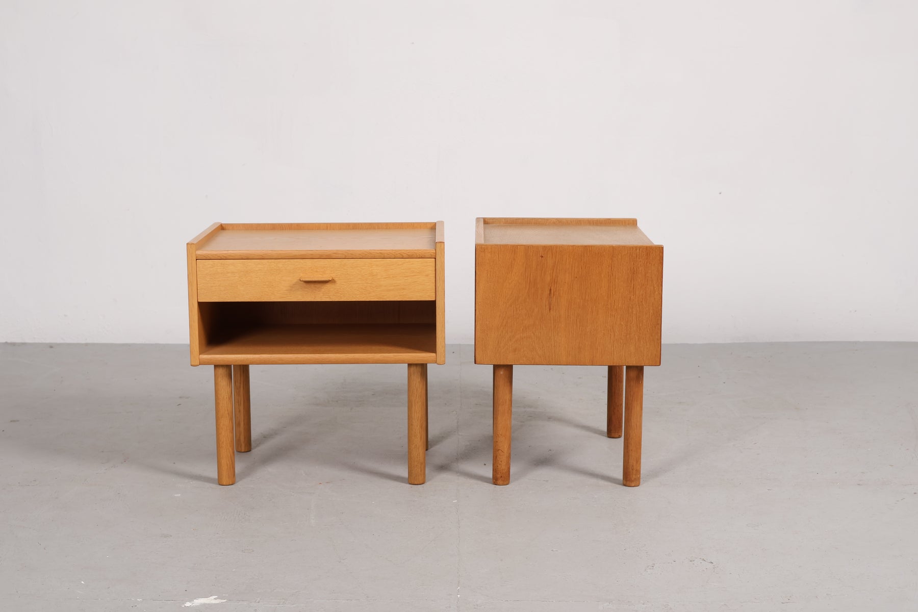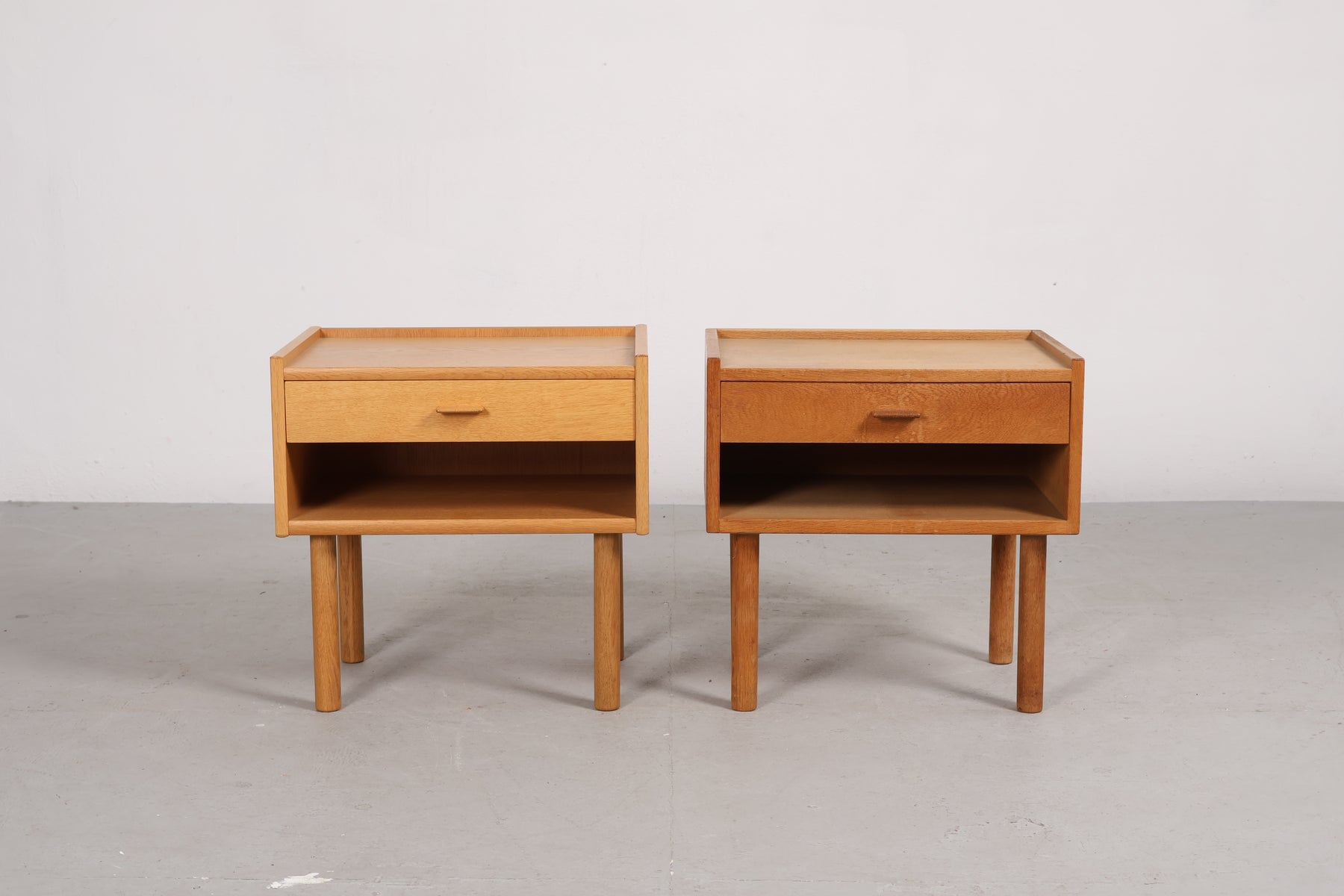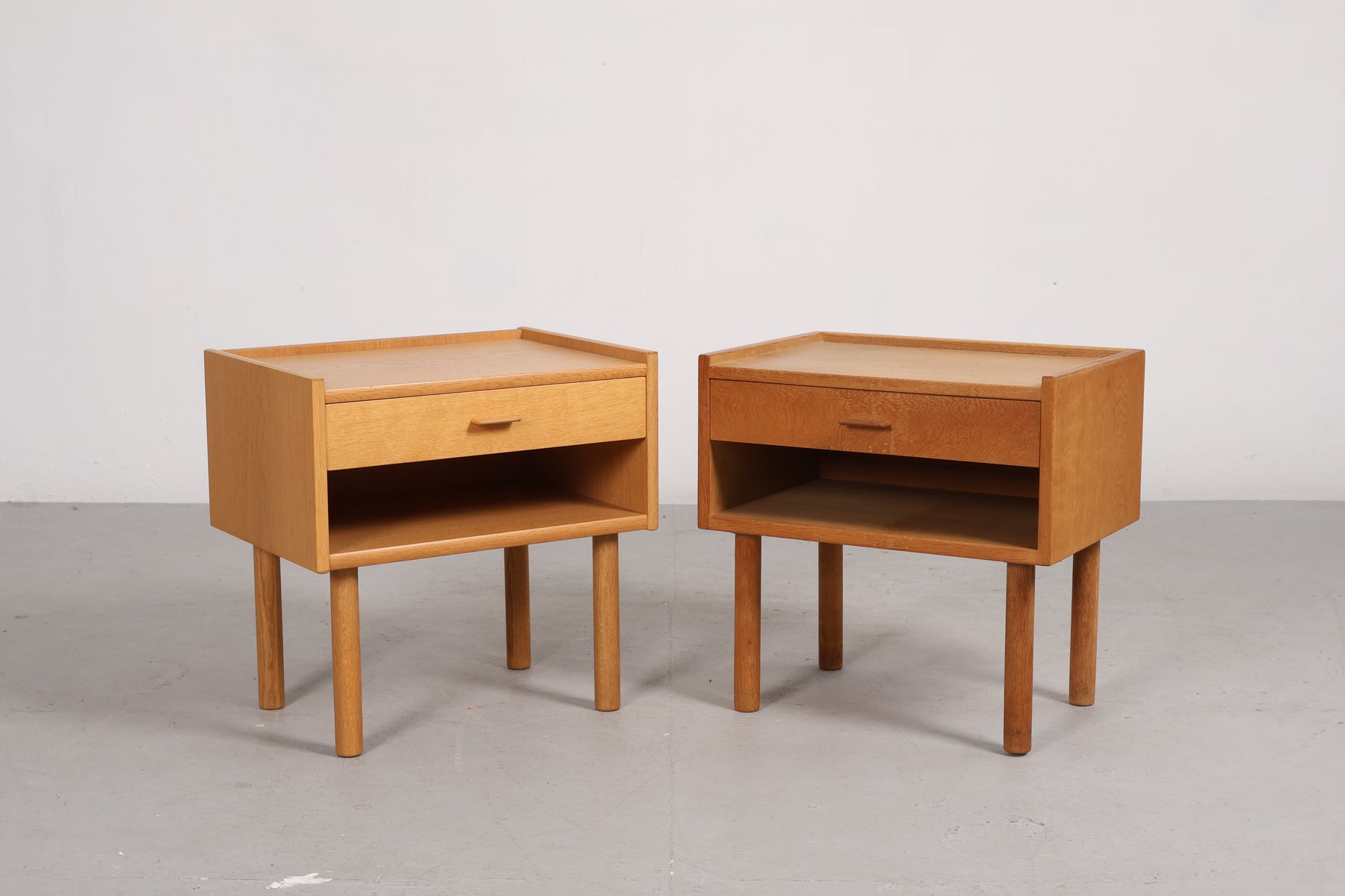 Nachttische aus den 60er-Jahren von Hans Wegner. Hergestellt in Dänemark. Gefertigt aus Eiche. Höhe 48 cm, Breite 48 cm, Tiefe 35 cm.