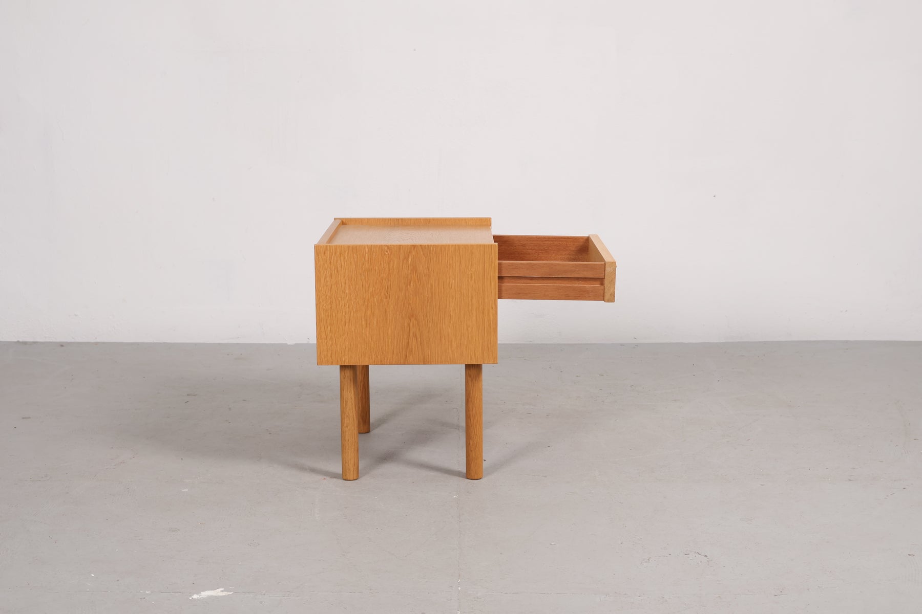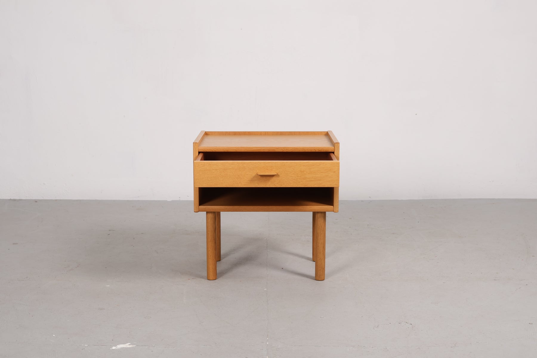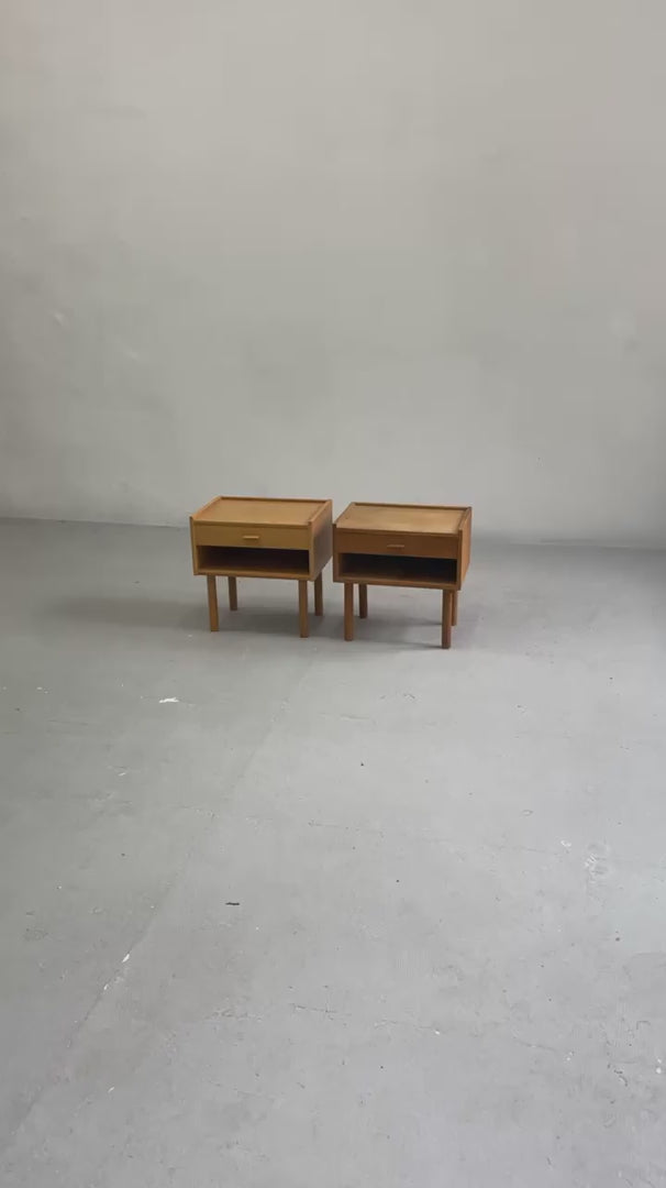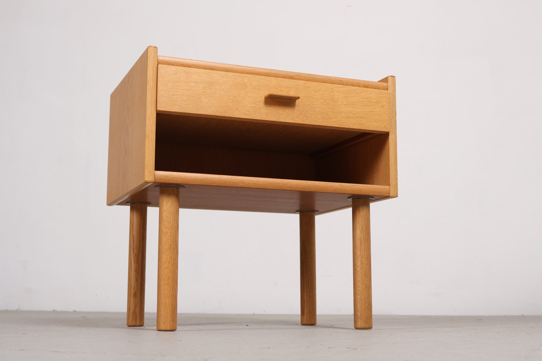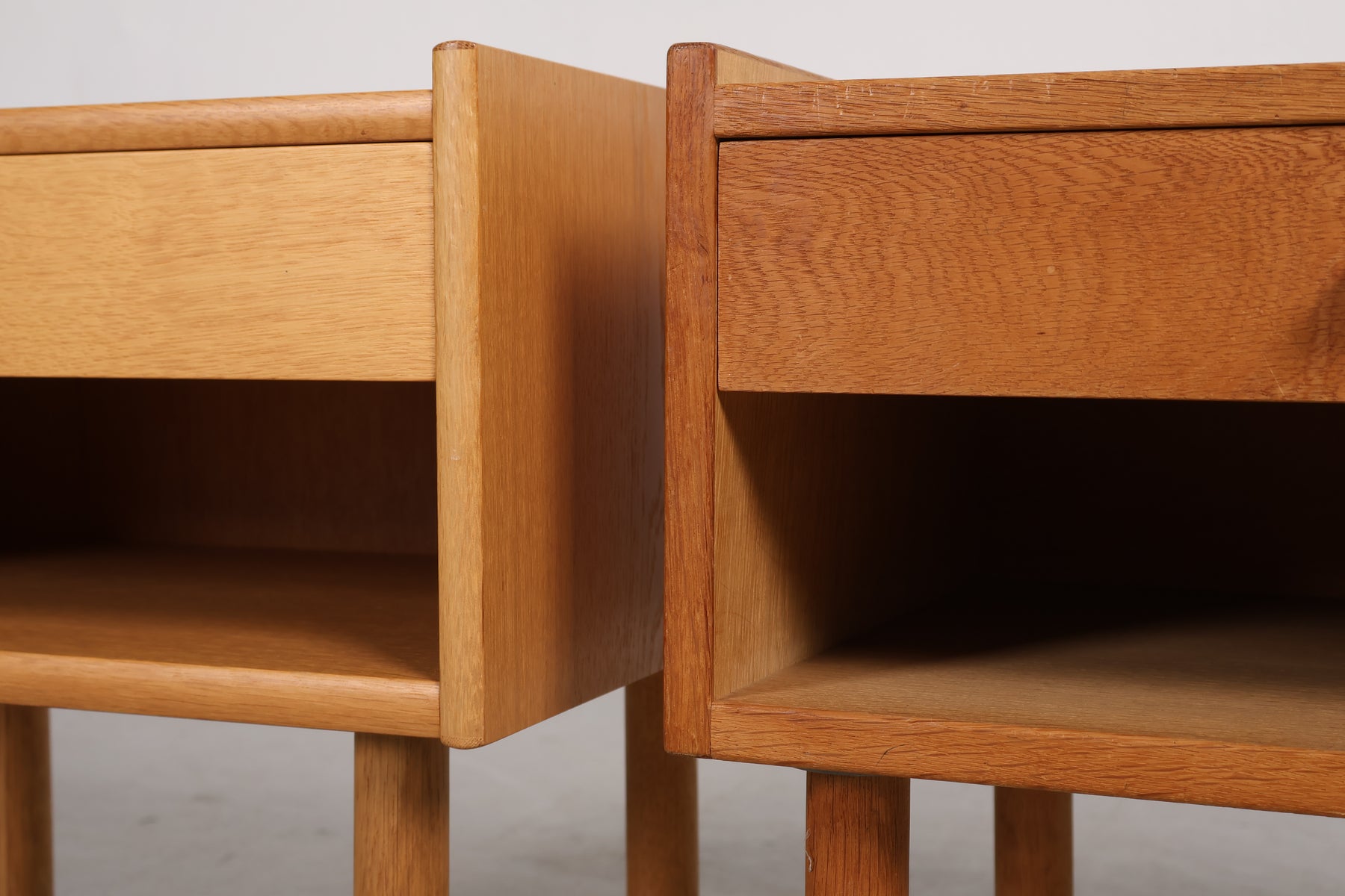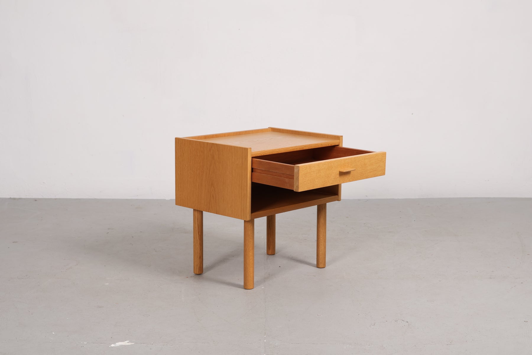 Nachttische aus den 60er-Jahren von Hans Wegner. Hergestellt in Dänemark. Gefertigt aus Eiche. Höhe 48 cm, Breite 48 cm, Tiefe 35 cm.
