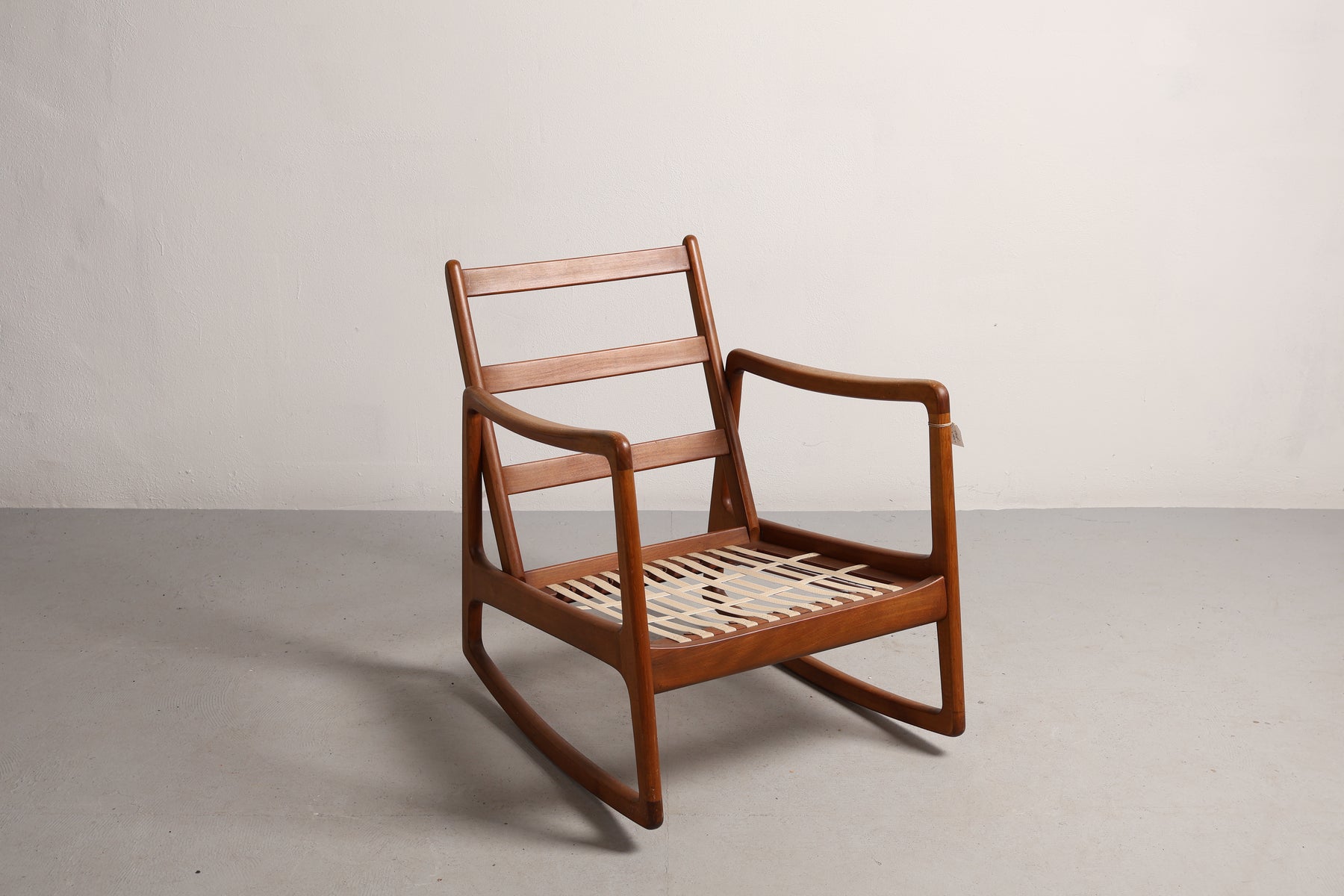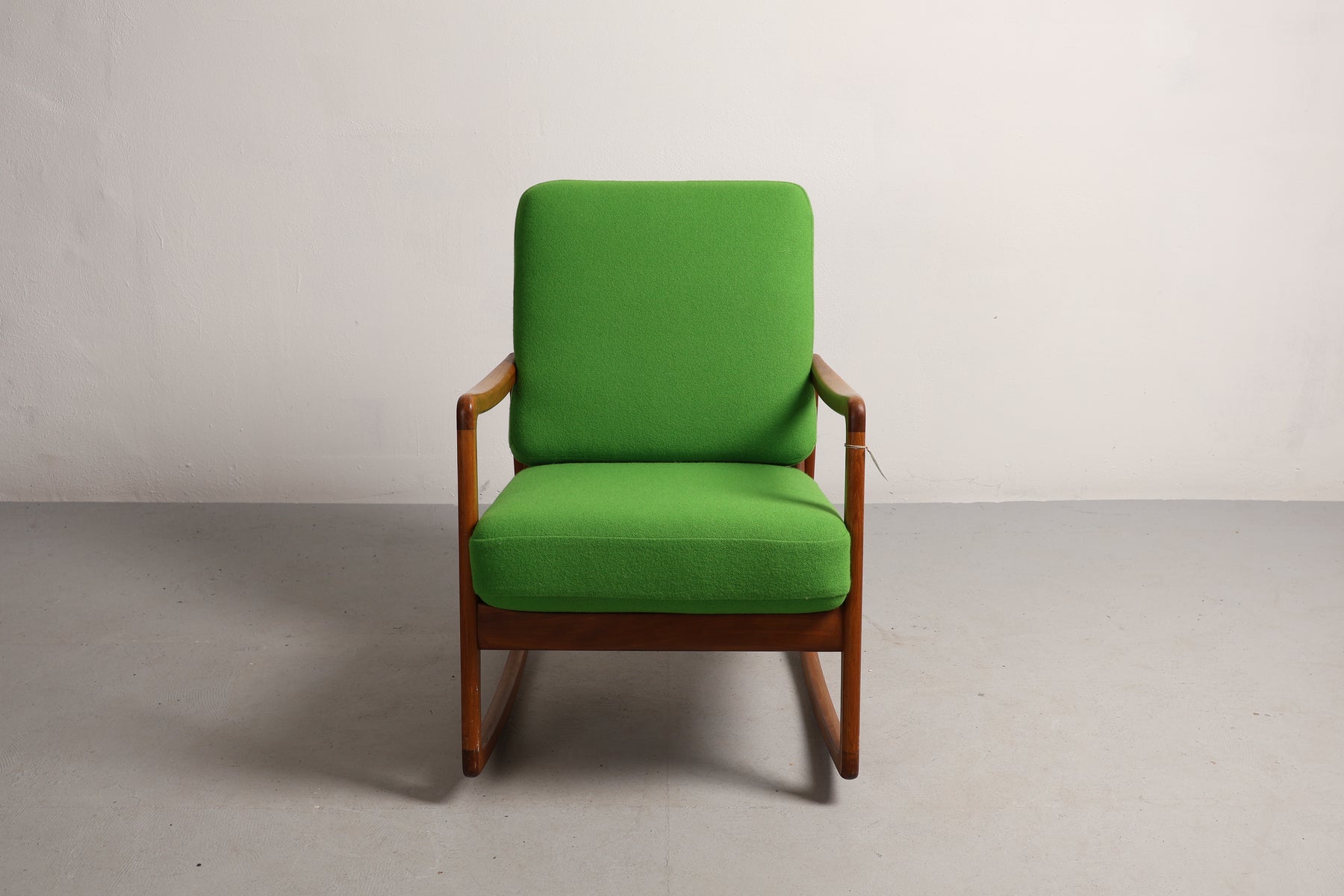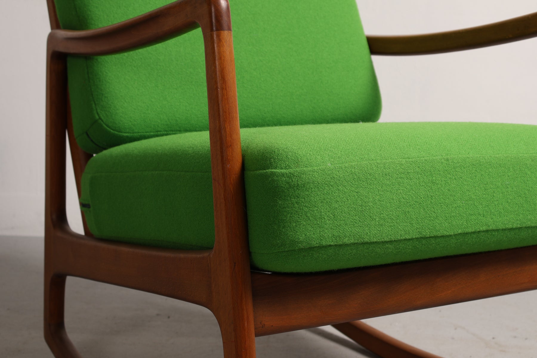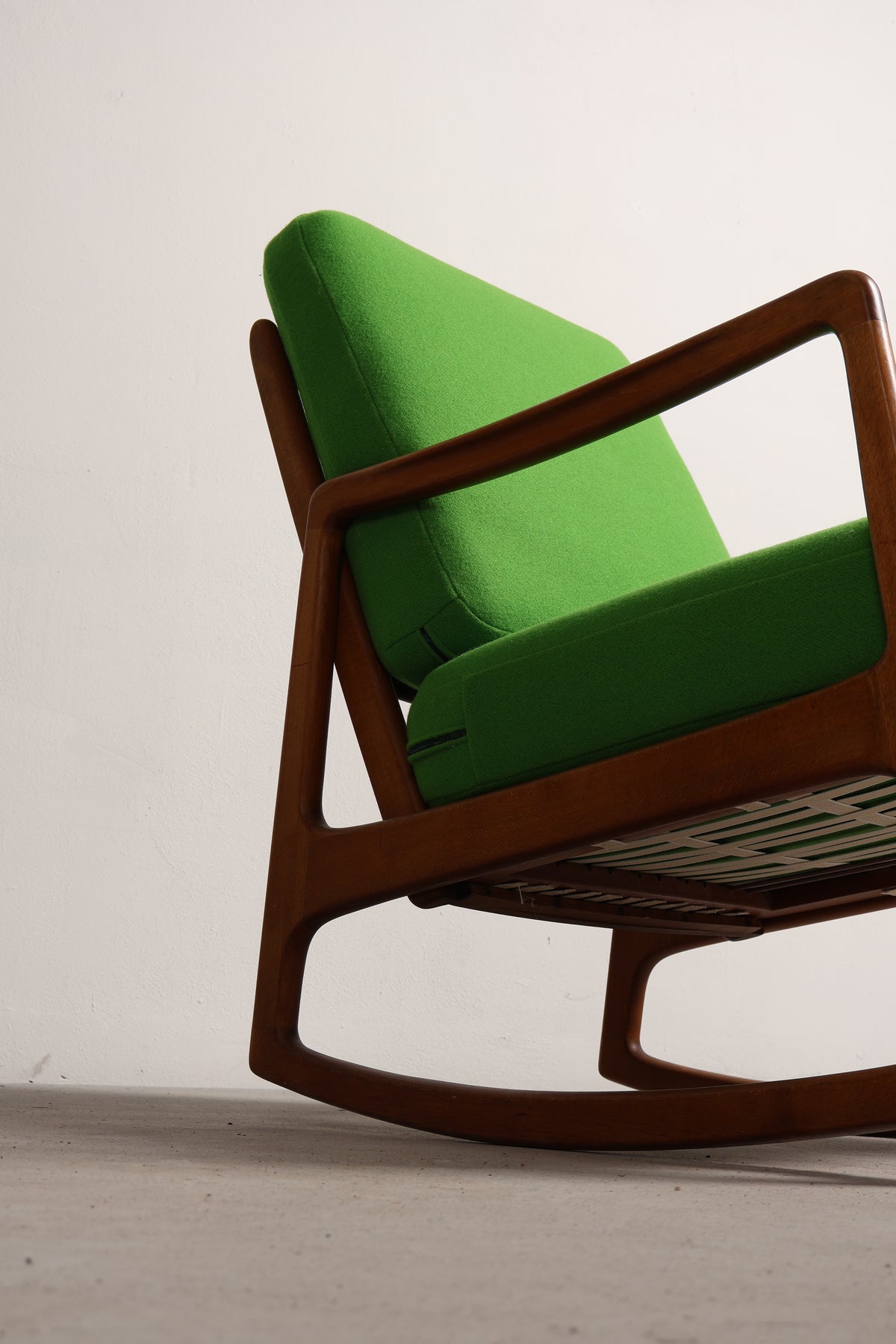 Schaukelstuhl „FD 120“ aus den 60er-Jahren von Ole Wanscher. Hergestellt in Dänemark. Gefertigt aus Eiche. Höhe 85 cm, Breite 62 cm, Tiefe 76 cm.