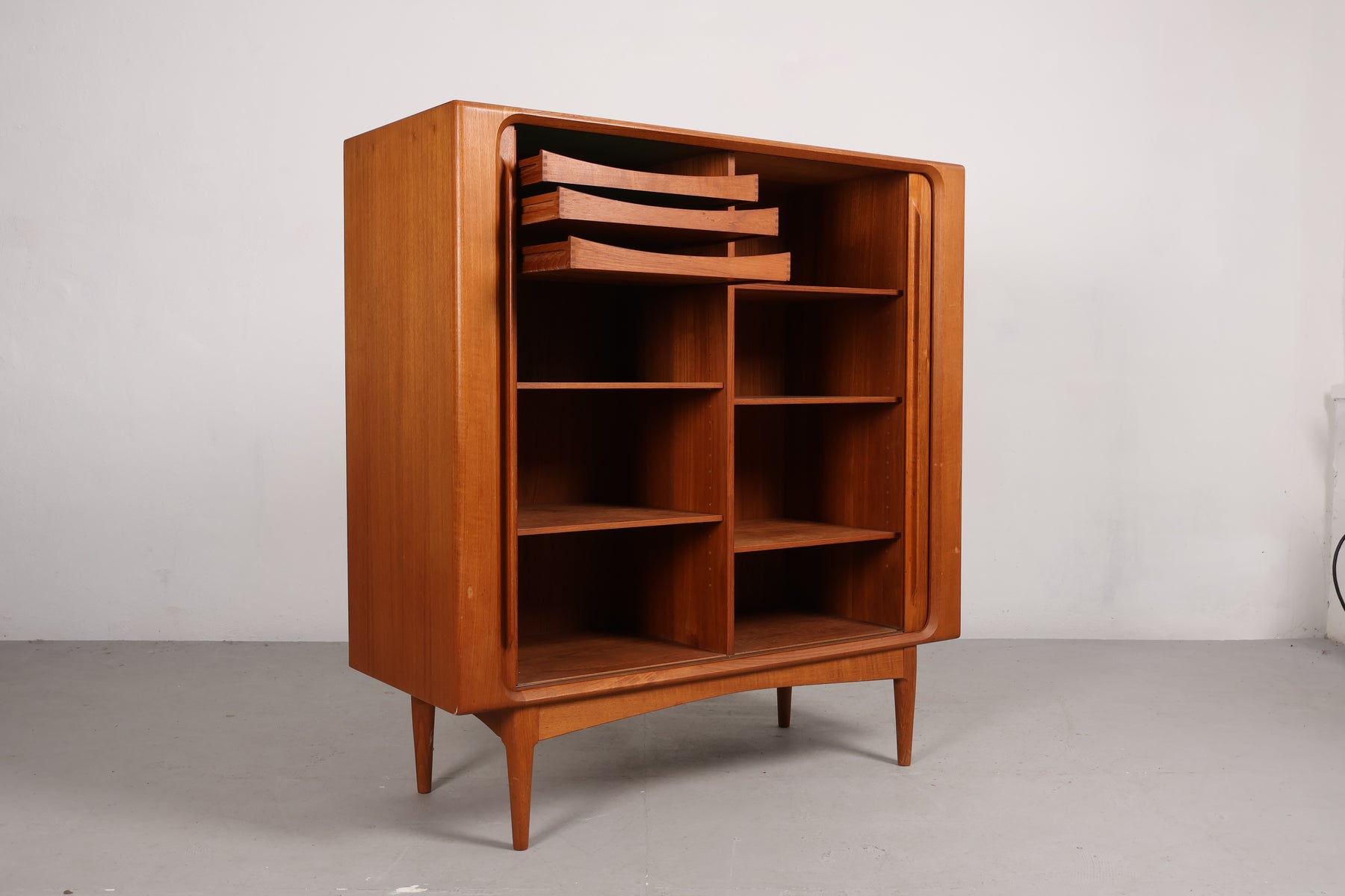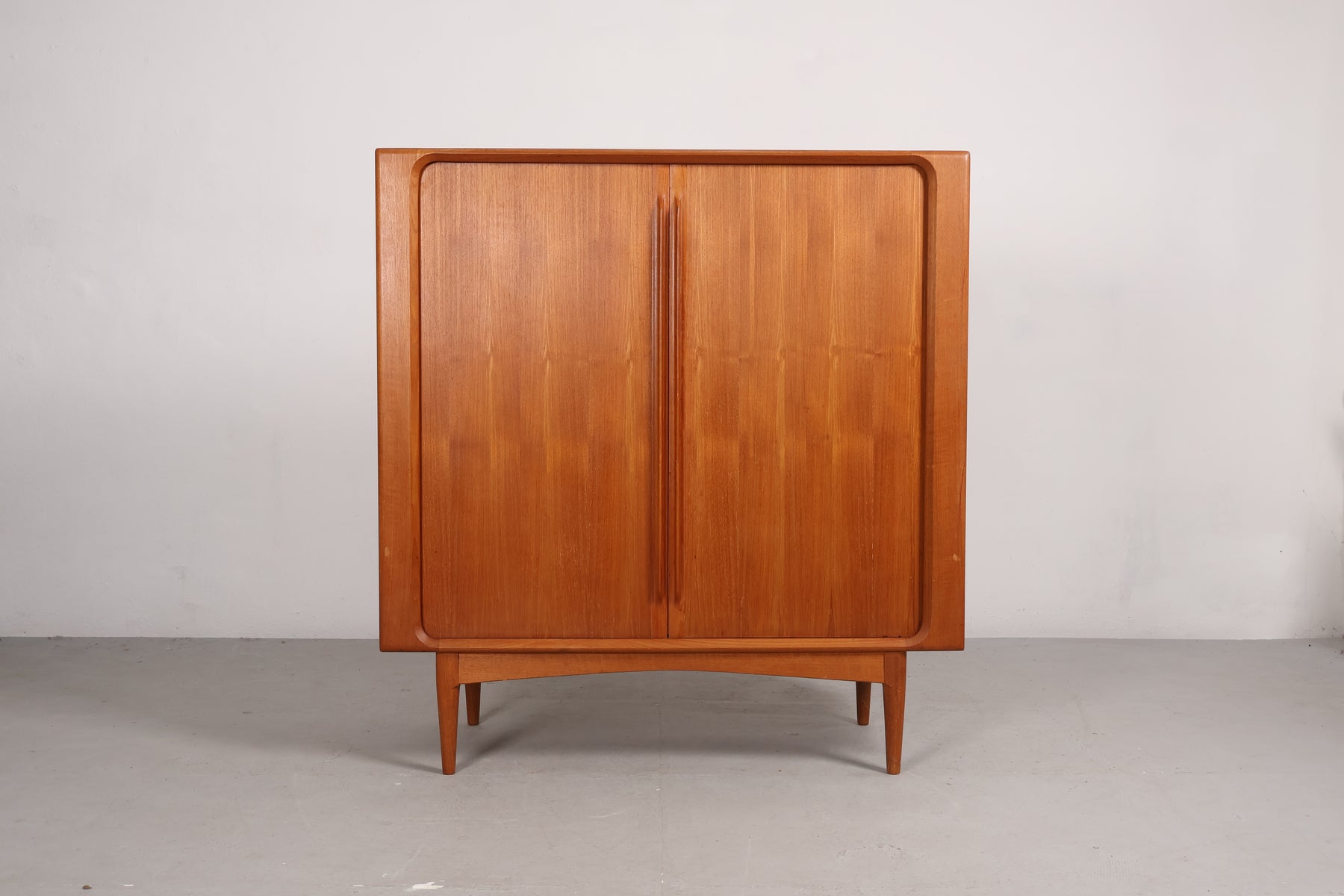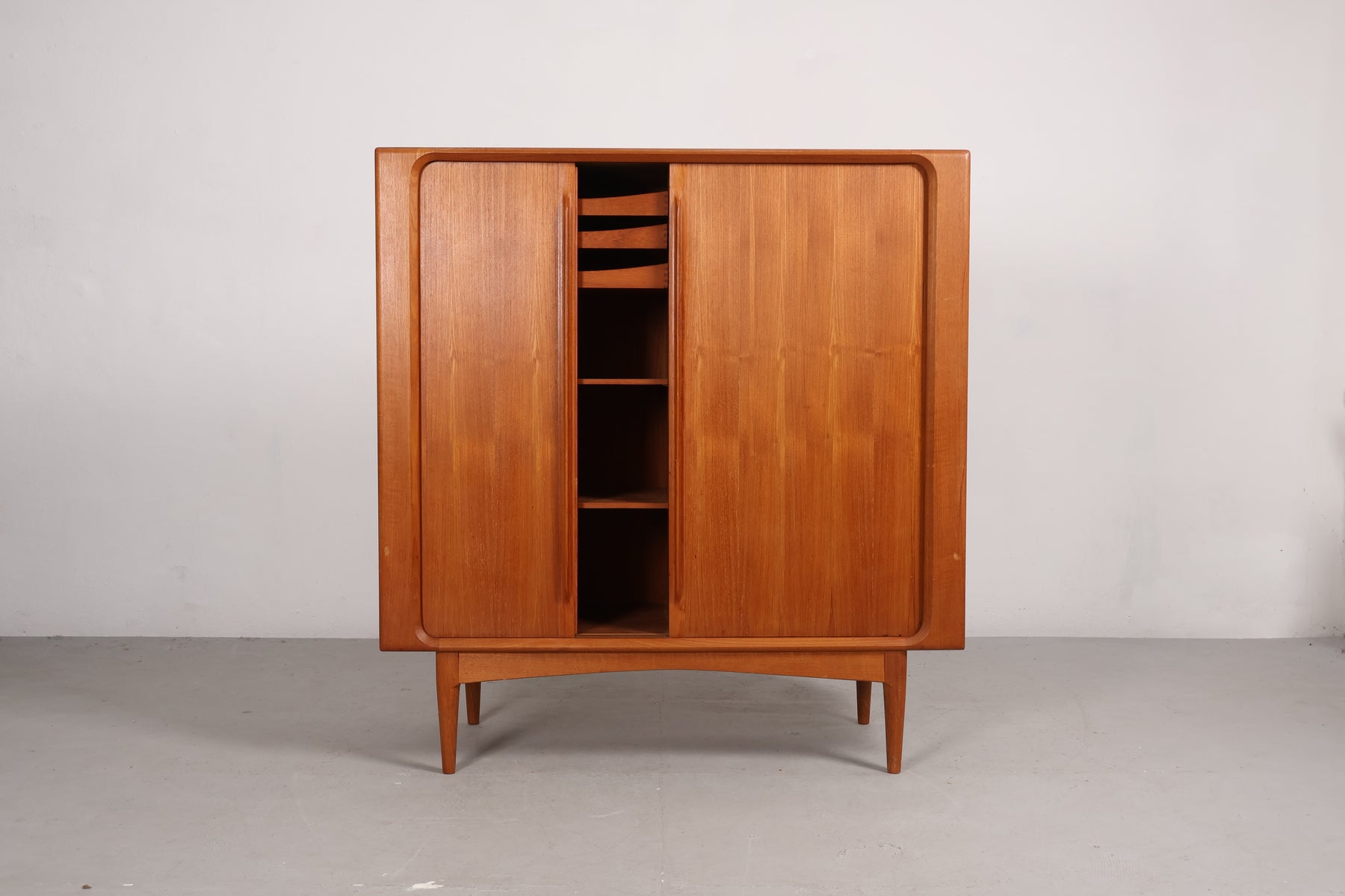 Highboard aus den 60er-Jahren von Bernhard Pedersen. Hergestellt in Dänemark. Gefertigt aus Teak. Höhe 128 cm, Breite 120 cm, Tiefe 48 cm.