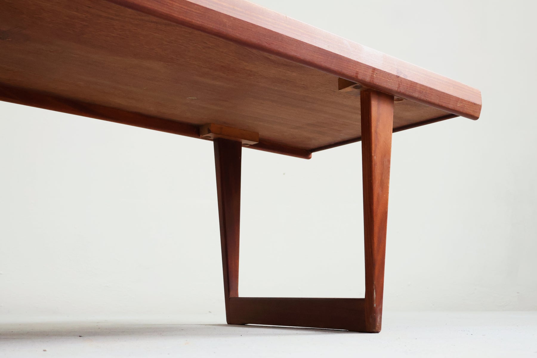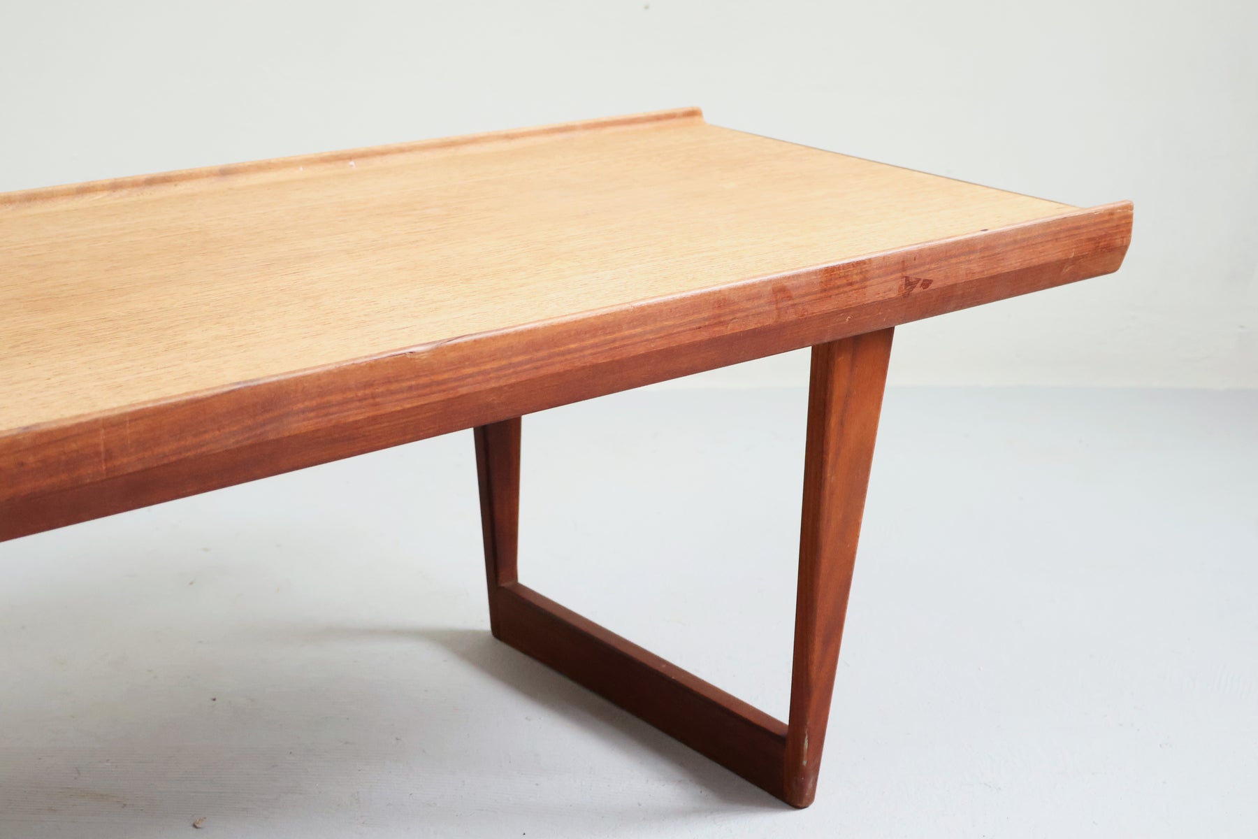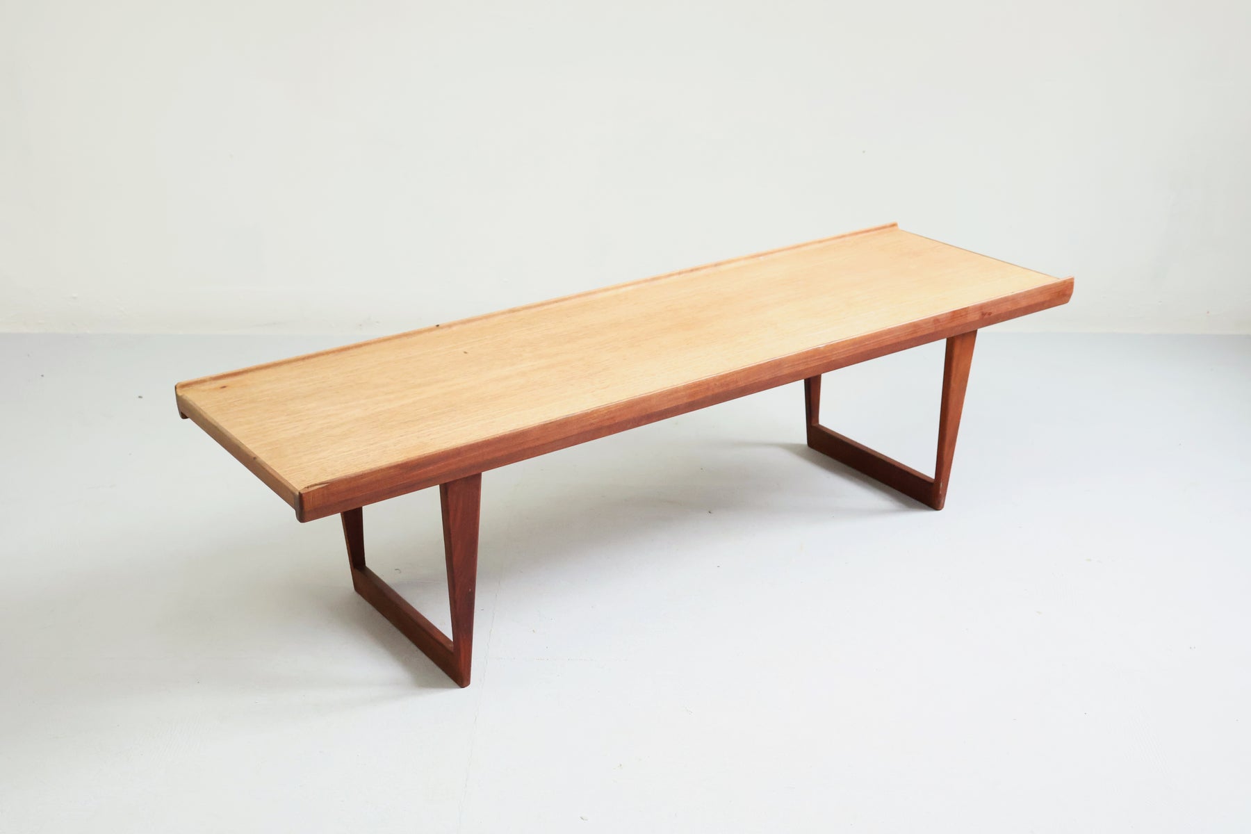 Couchtisch aus den 60er-Jahren von Peter Løvig. Hergestellt in Dänemark. Gefertigt aus Teak. Höhe 41 cm, Breite 149 cm, Tiefe 45 cm.