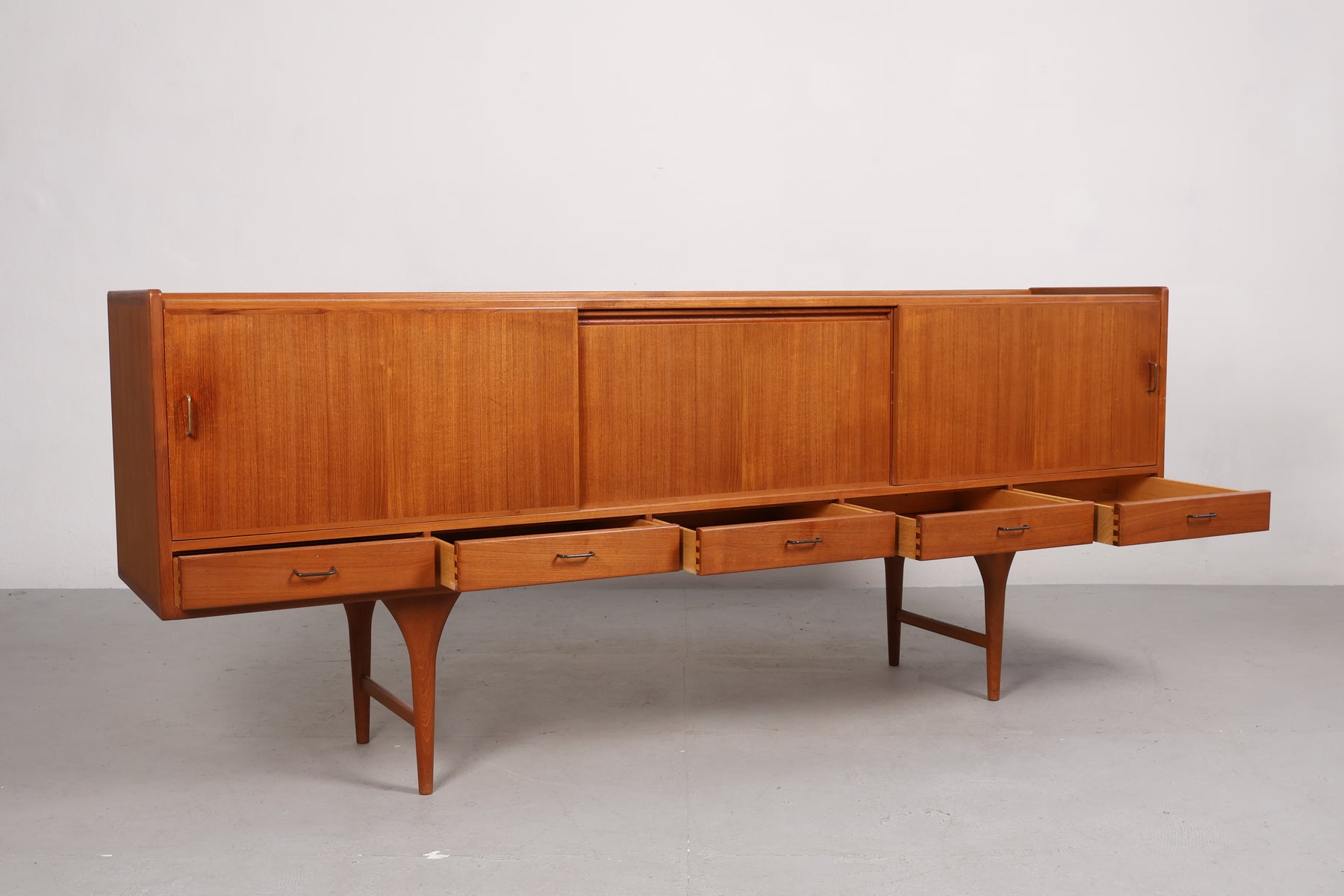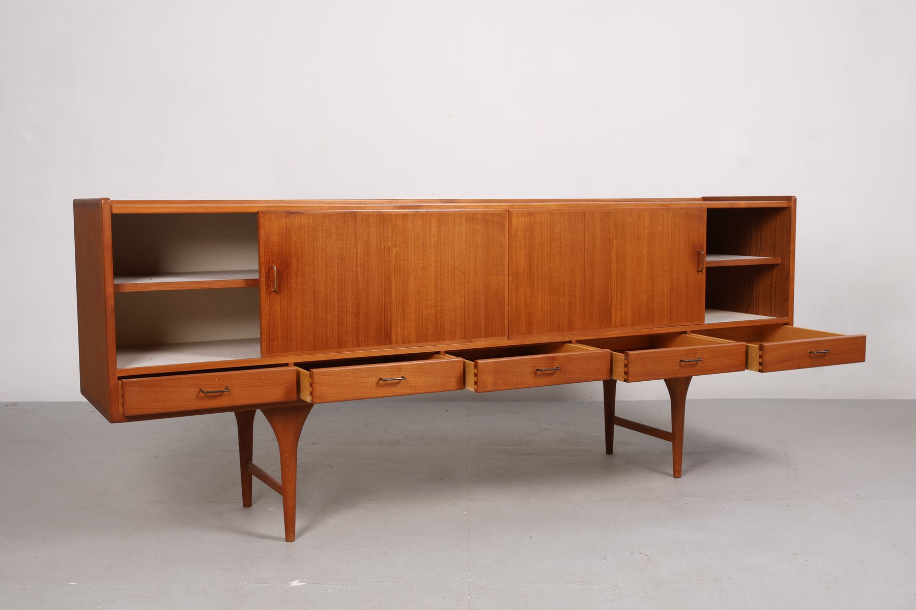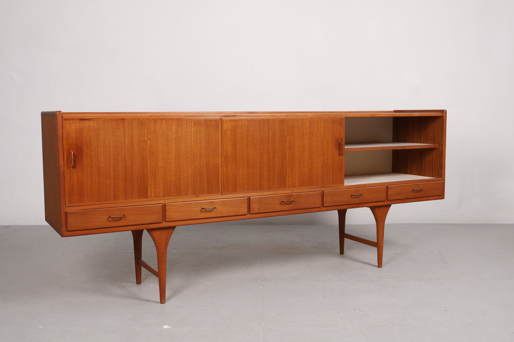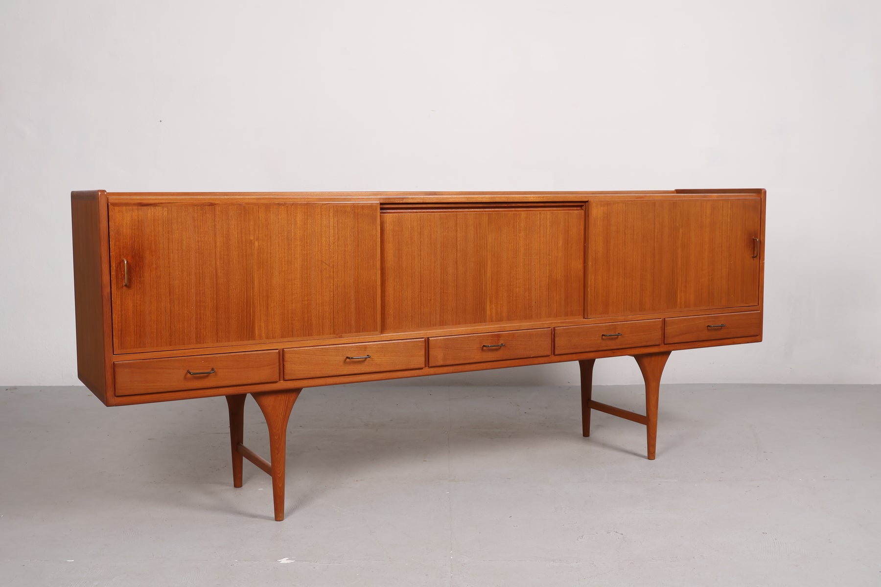 Sideboard aus den 60er-Jahren. Hergestellt in Dänemark. Gefertigt aus Teak. Höhe 82 cm, Breite 204 cm, Tiefe 43 cm.