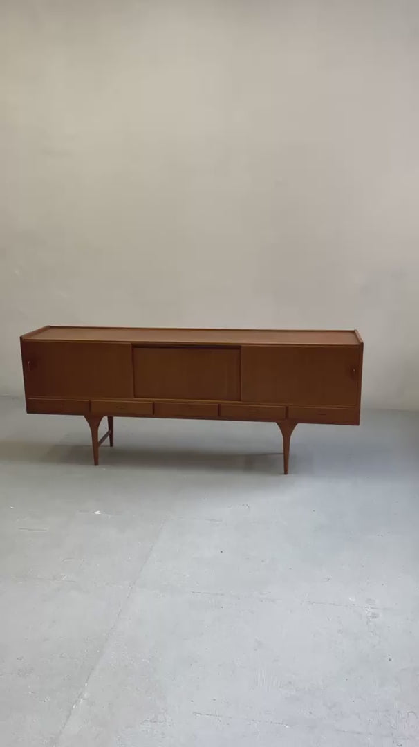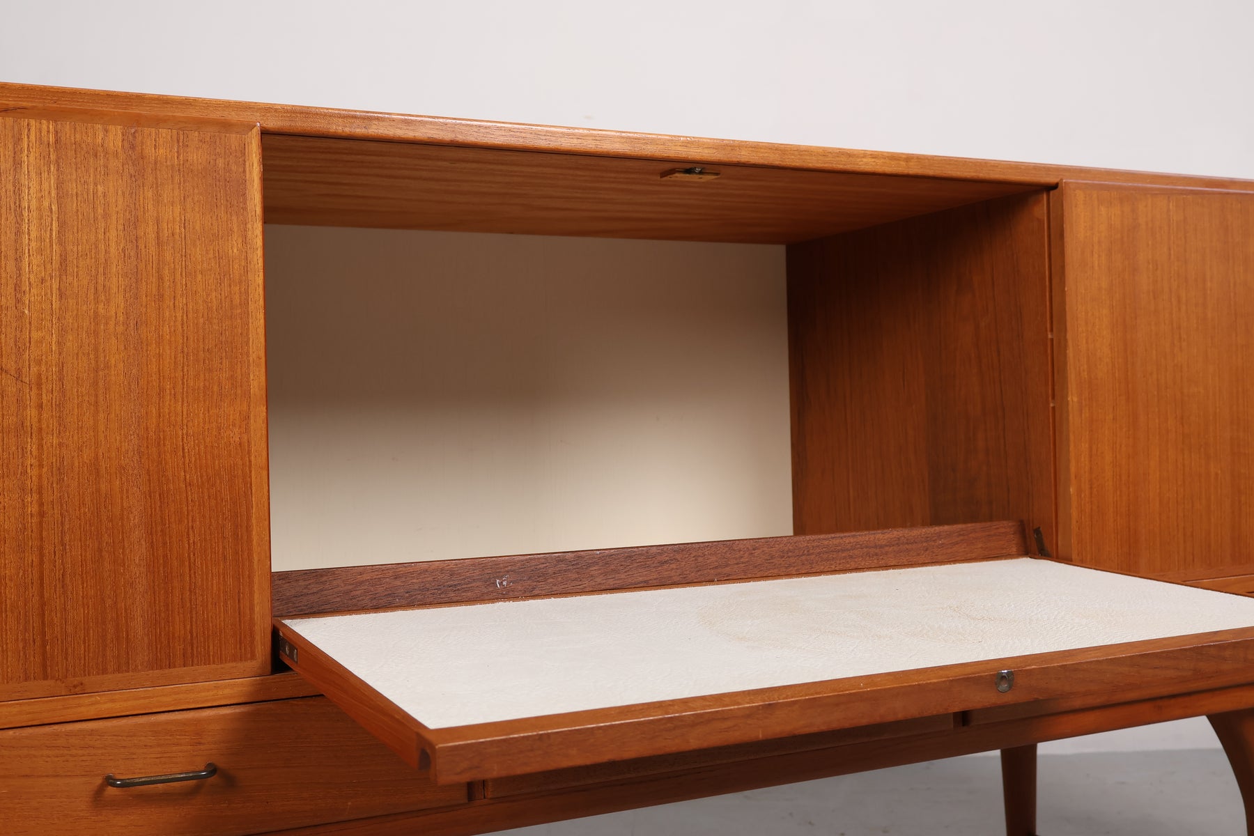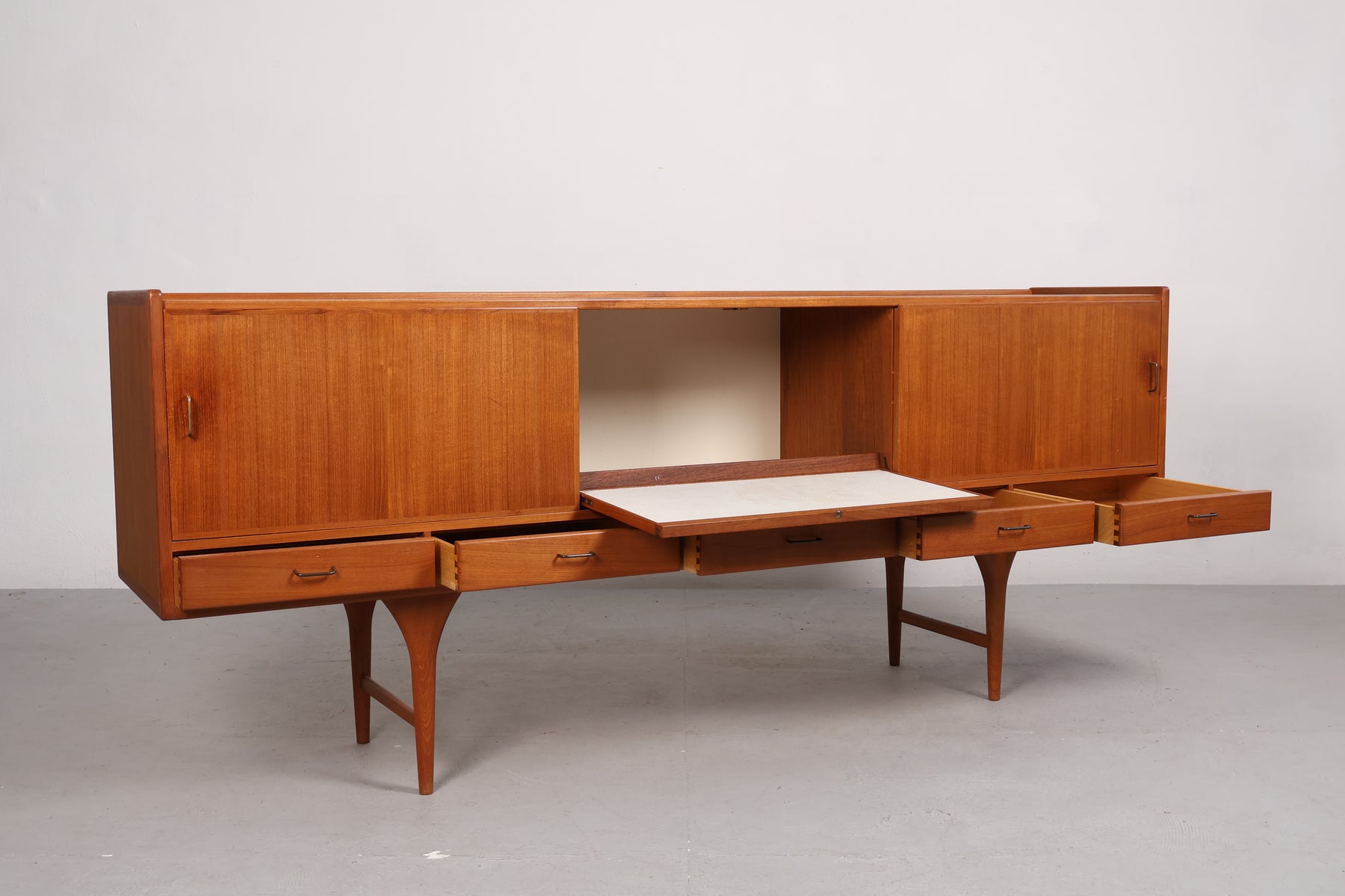 Sideboard aus den 60er-Jahren. Hergestellt in Dänemark. Gefertigt aus Teak. Höhe 82 cm, Breite 204 cm, Tiefe 43 cm.