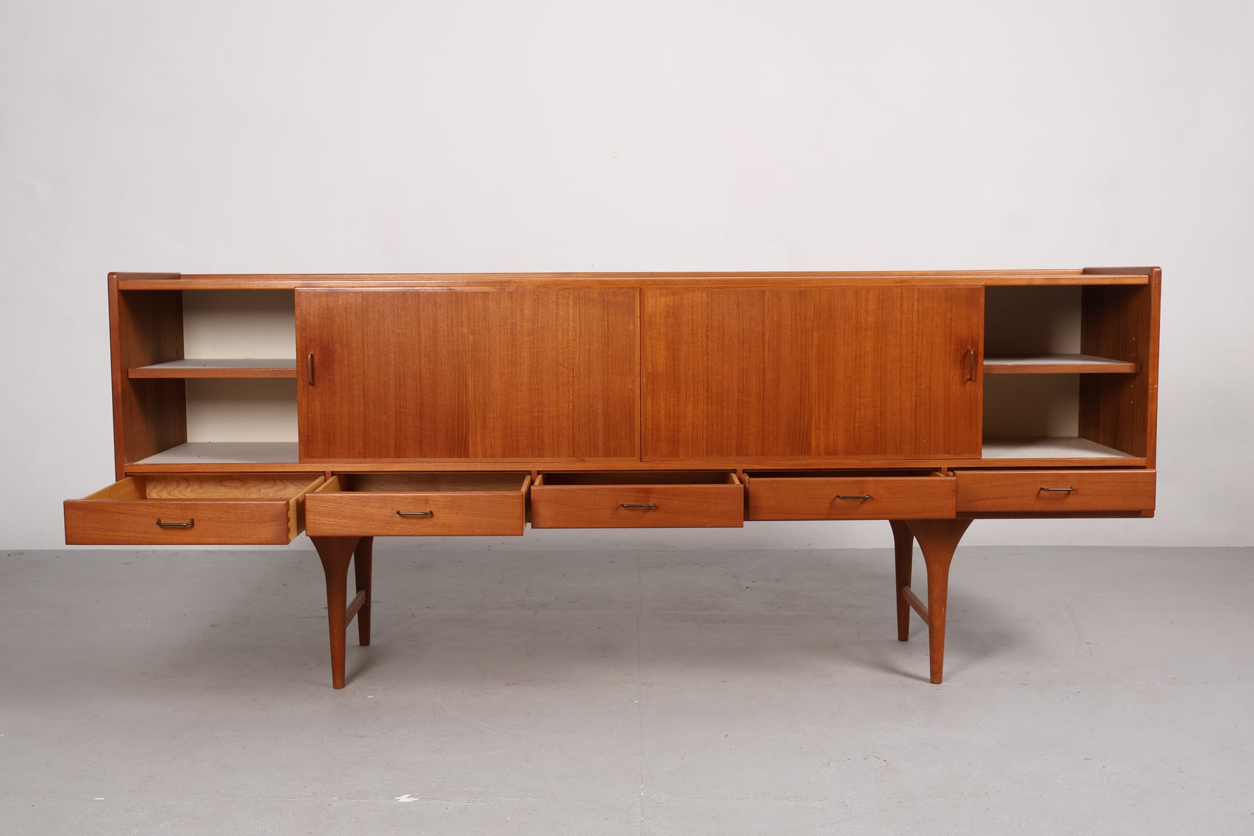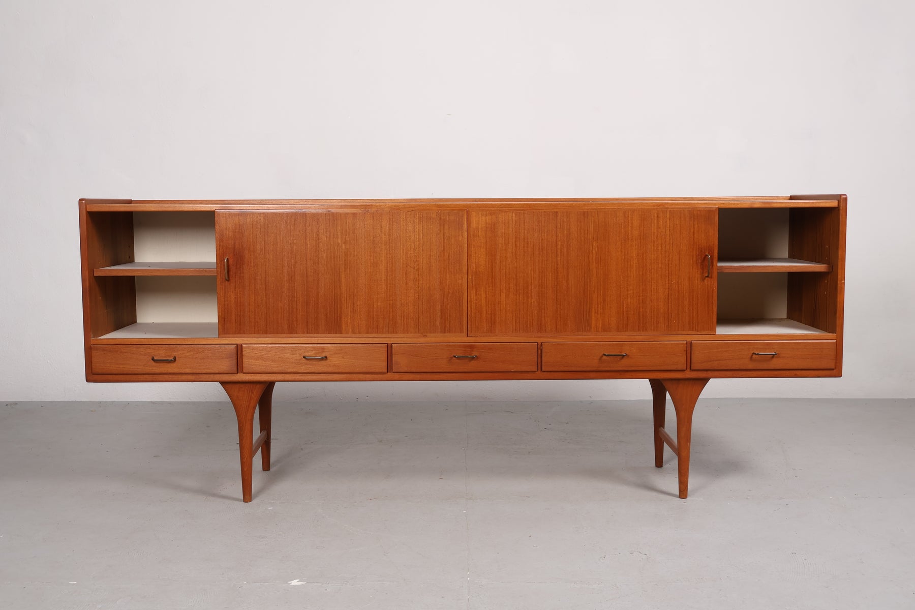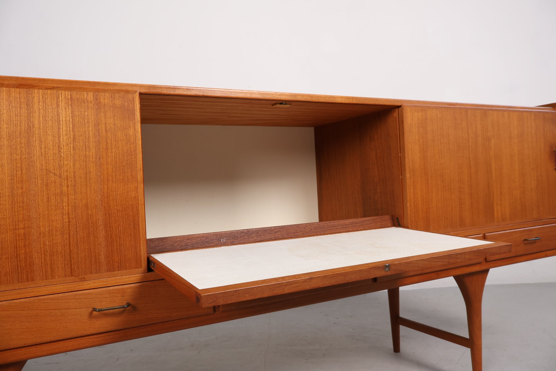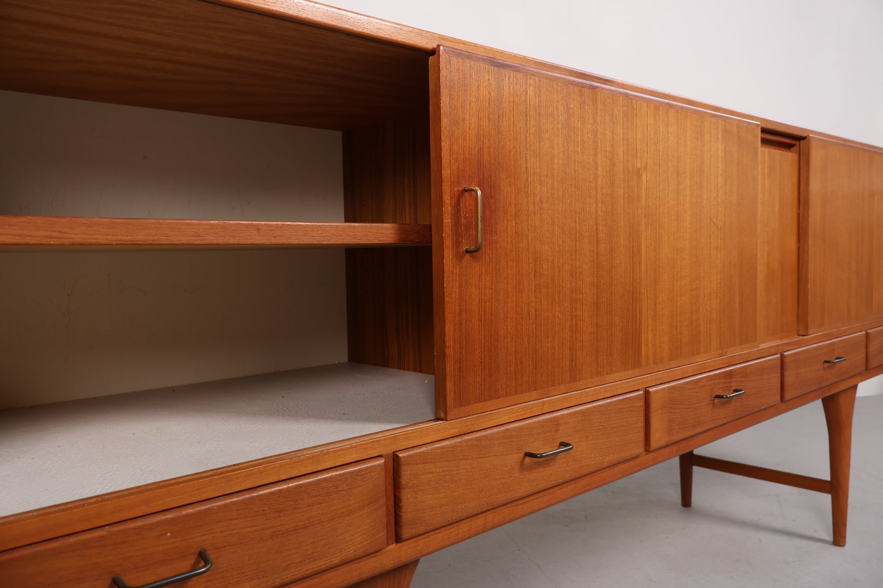 Sideboard aus den 60er-Jahren. Hergestellt in Dänemark. Gefertigt aus Teak. Höhe 82 cm, Breite 204 cm, Tiefe 43 cm.
