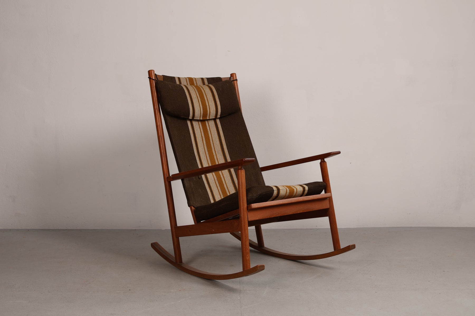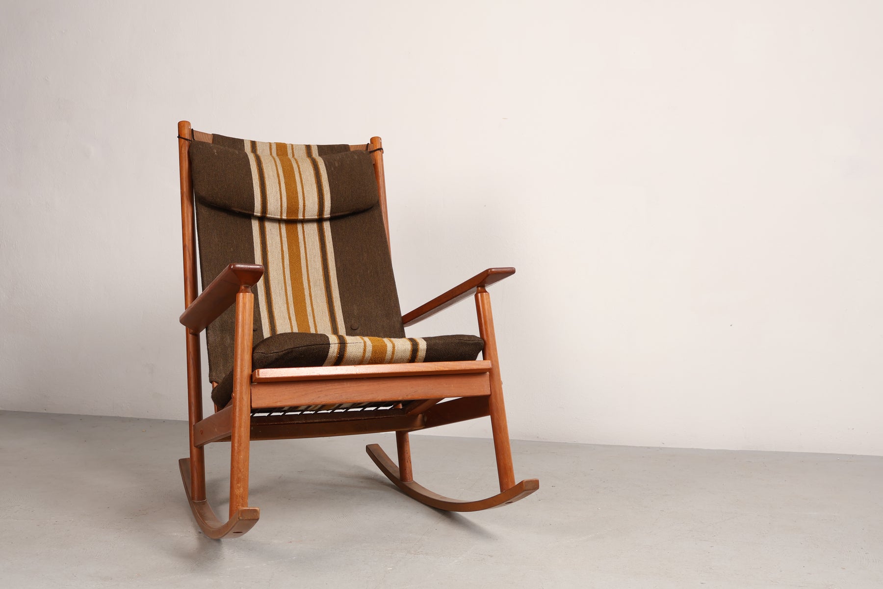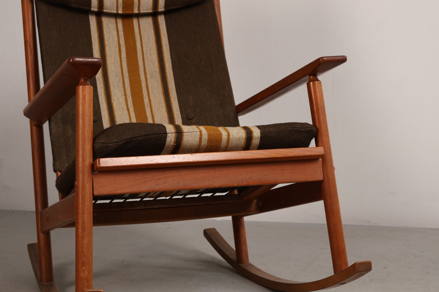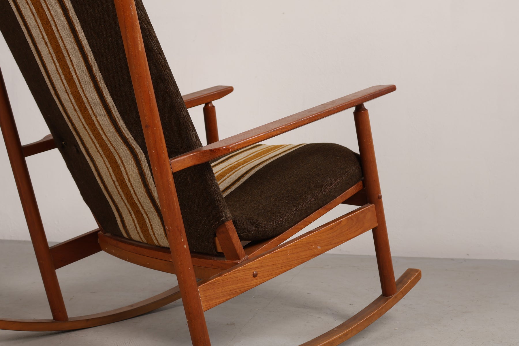 Schaukelstuhl aus den 60er-Jahren von Hans Olsen für Juul Kristensen. Hergestellt in Dänemark. Gefertigt aus Teak. Höhe 102 cm, Breite 67 cm, Tiefe 90 cm.
