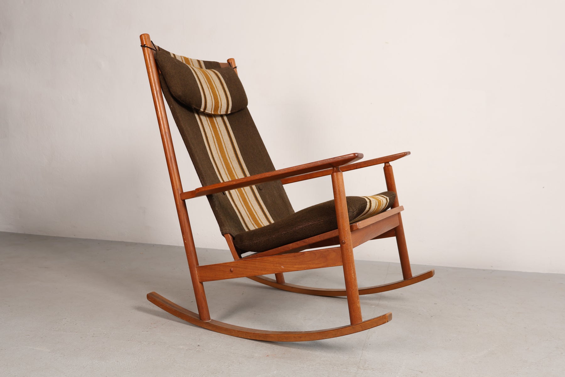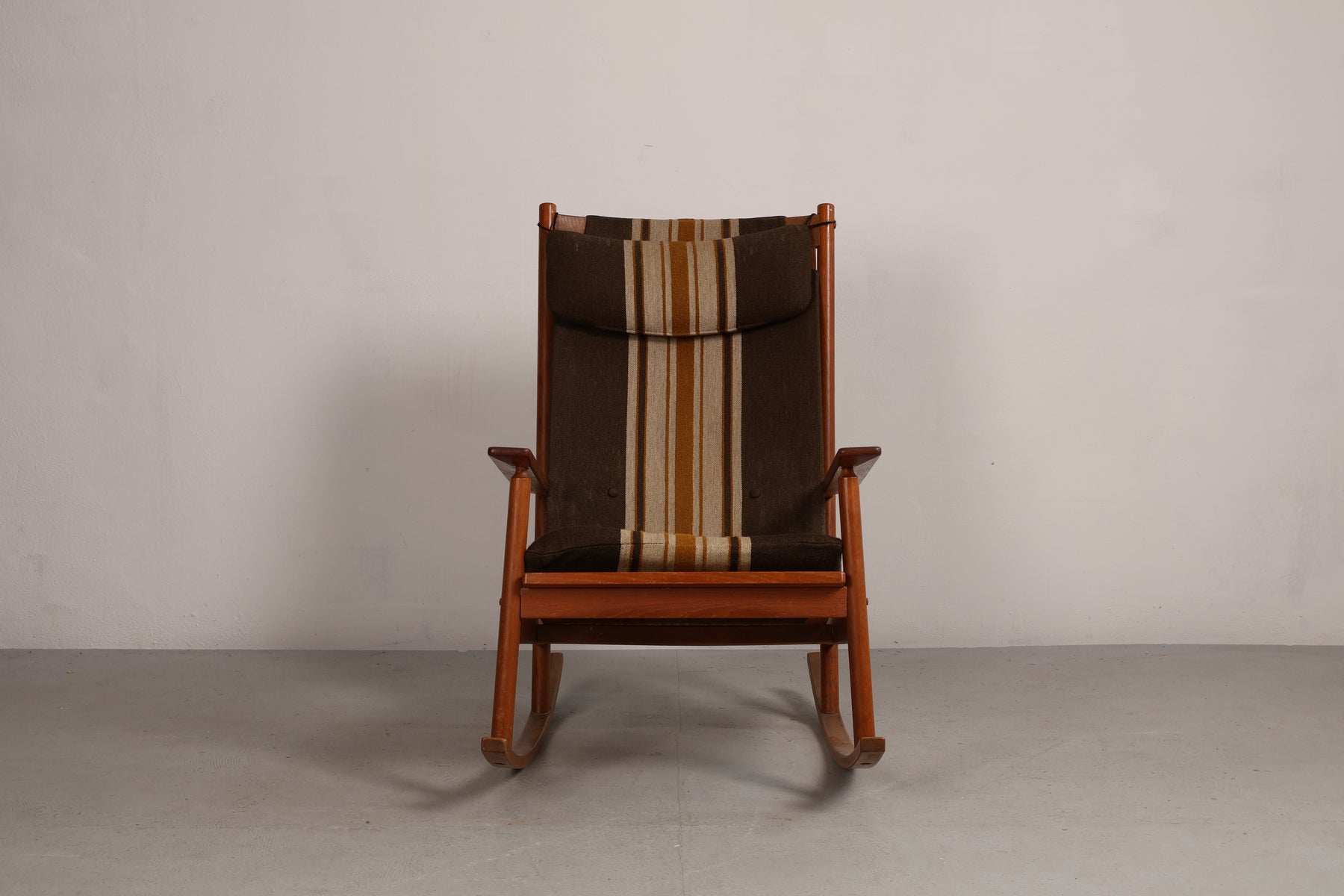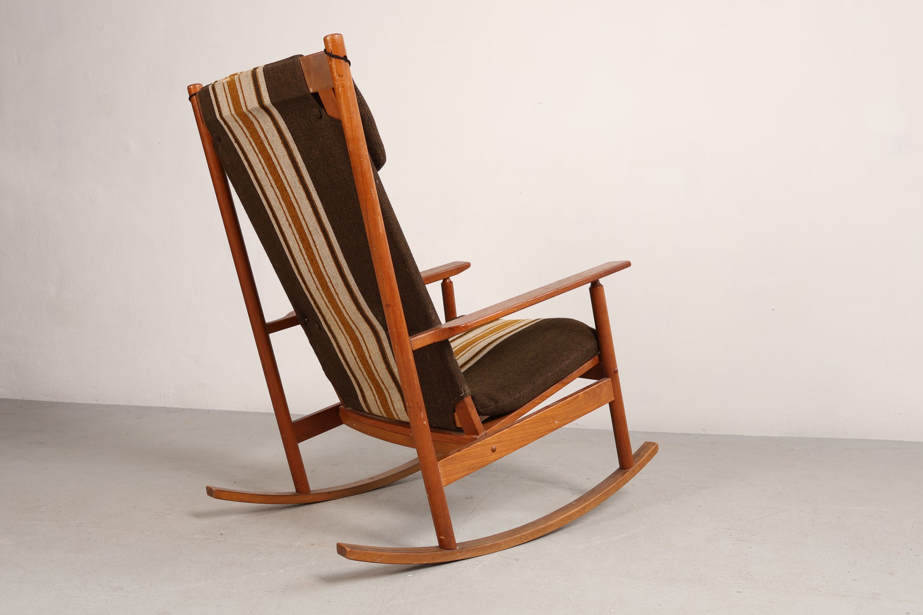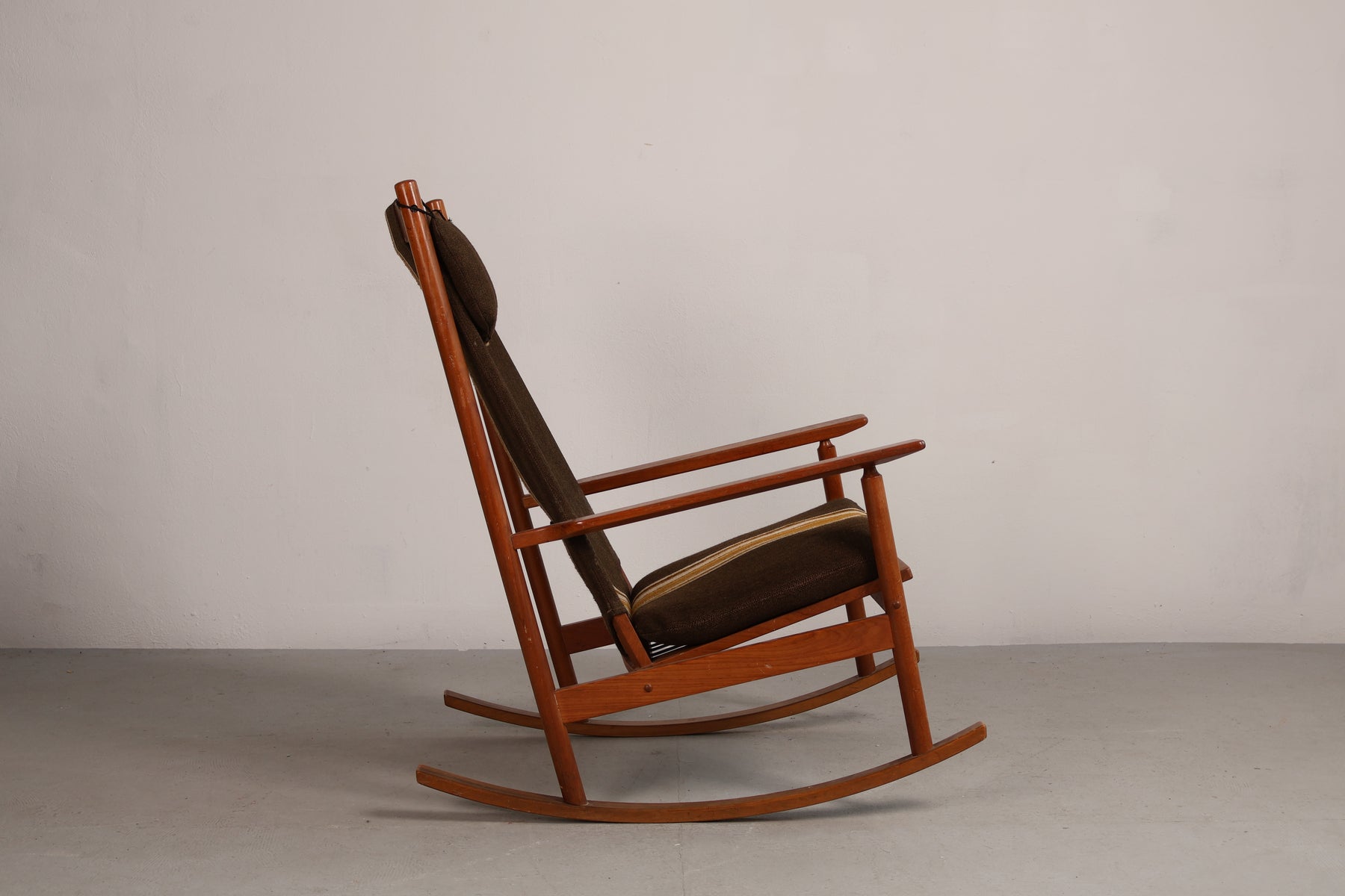 Schaukelstuhl aus den 60er-Jahren von Hans Olsen für Juul Kristensen. Hergestellt in Dänemark. Gefertigt aus Teak. Höhe 102 cm, Breite 67 cm, Tiefe 90 cm.