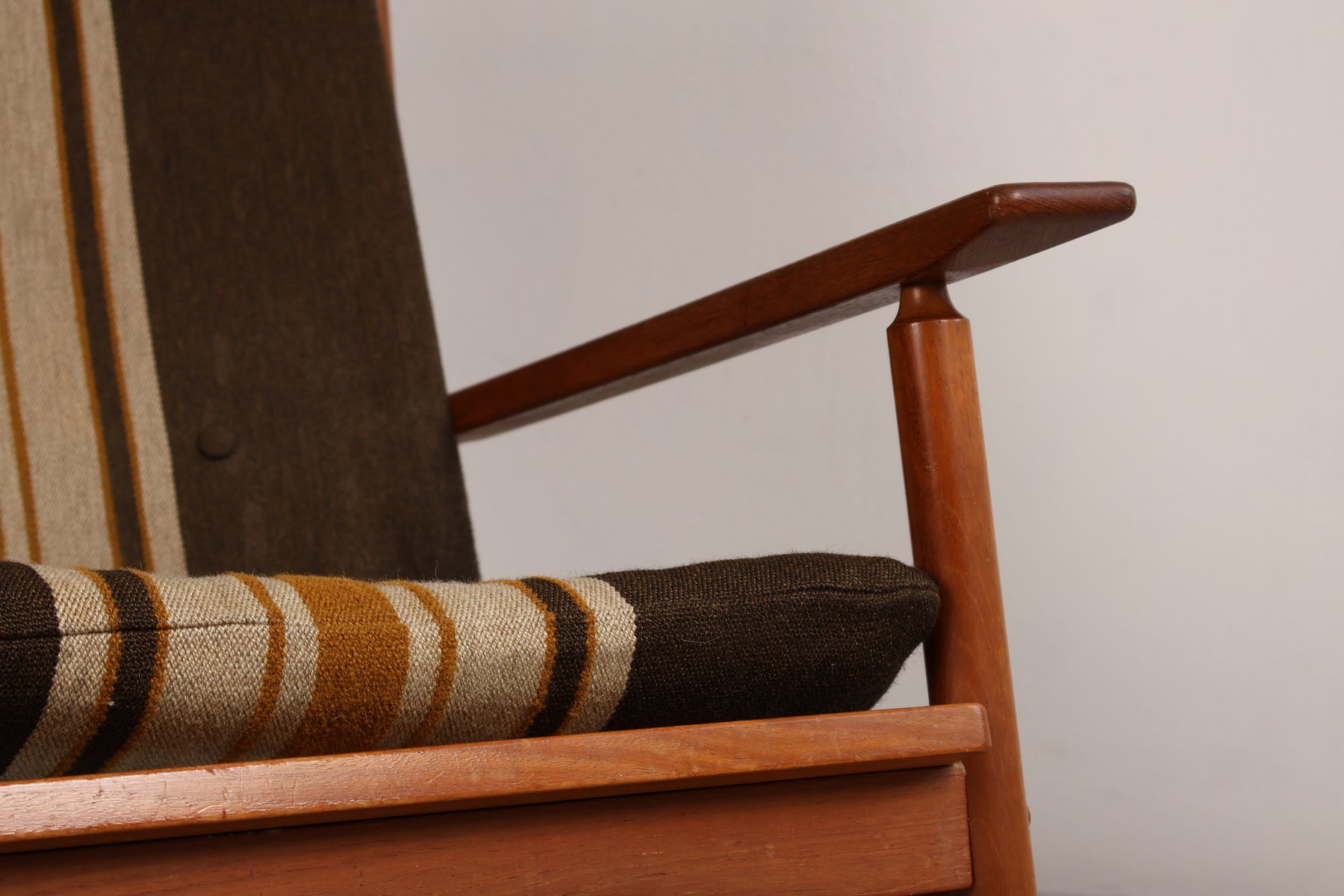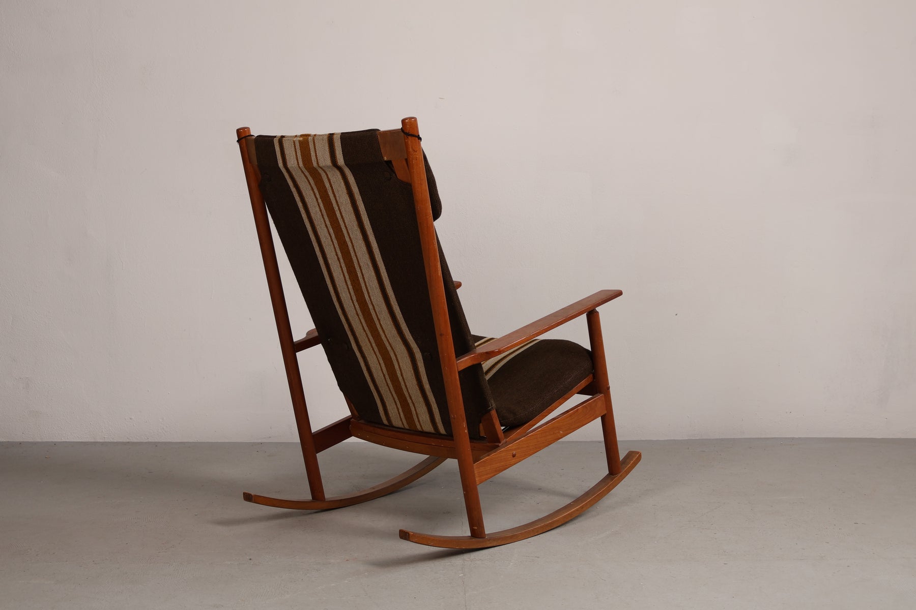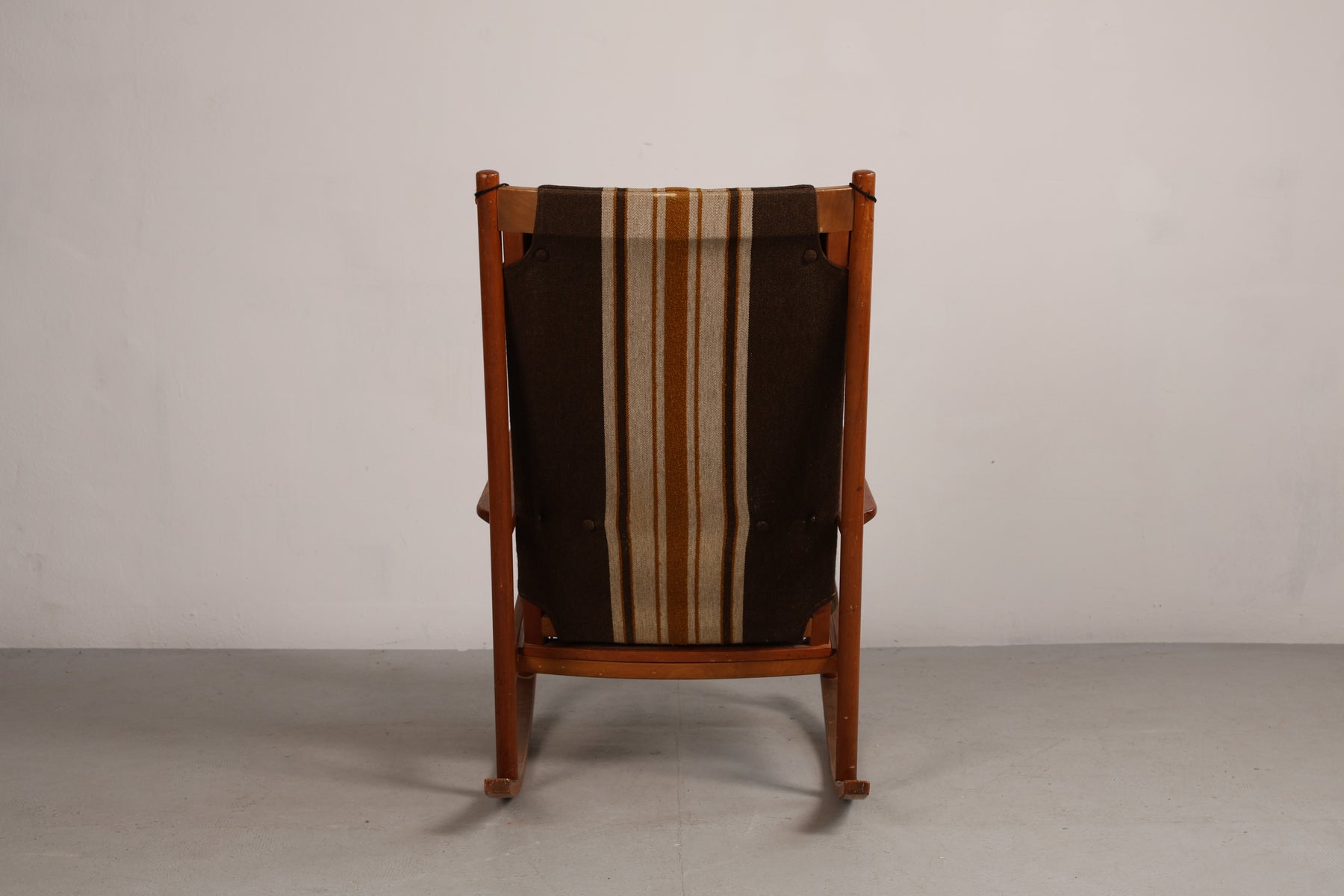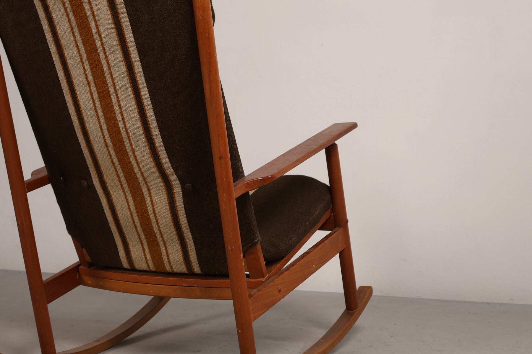 Schaukelstuhl aus den 60er-Jahren von Hans Olsen für Juul Kristensen. Hergestellt in Dänemark. Gefertigt aus Teak. Höhe 102 cm, Breite 67 cm, Tiefe 90 cm.