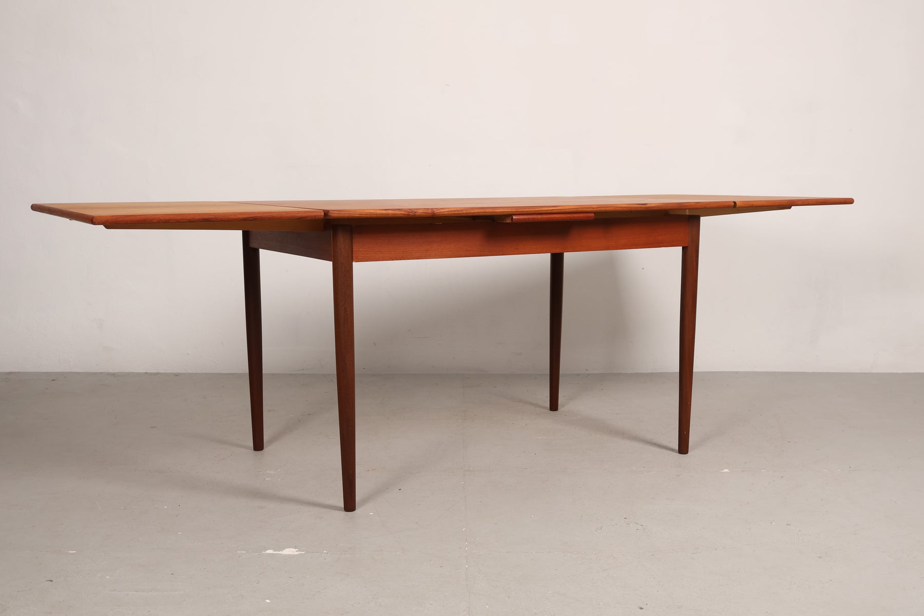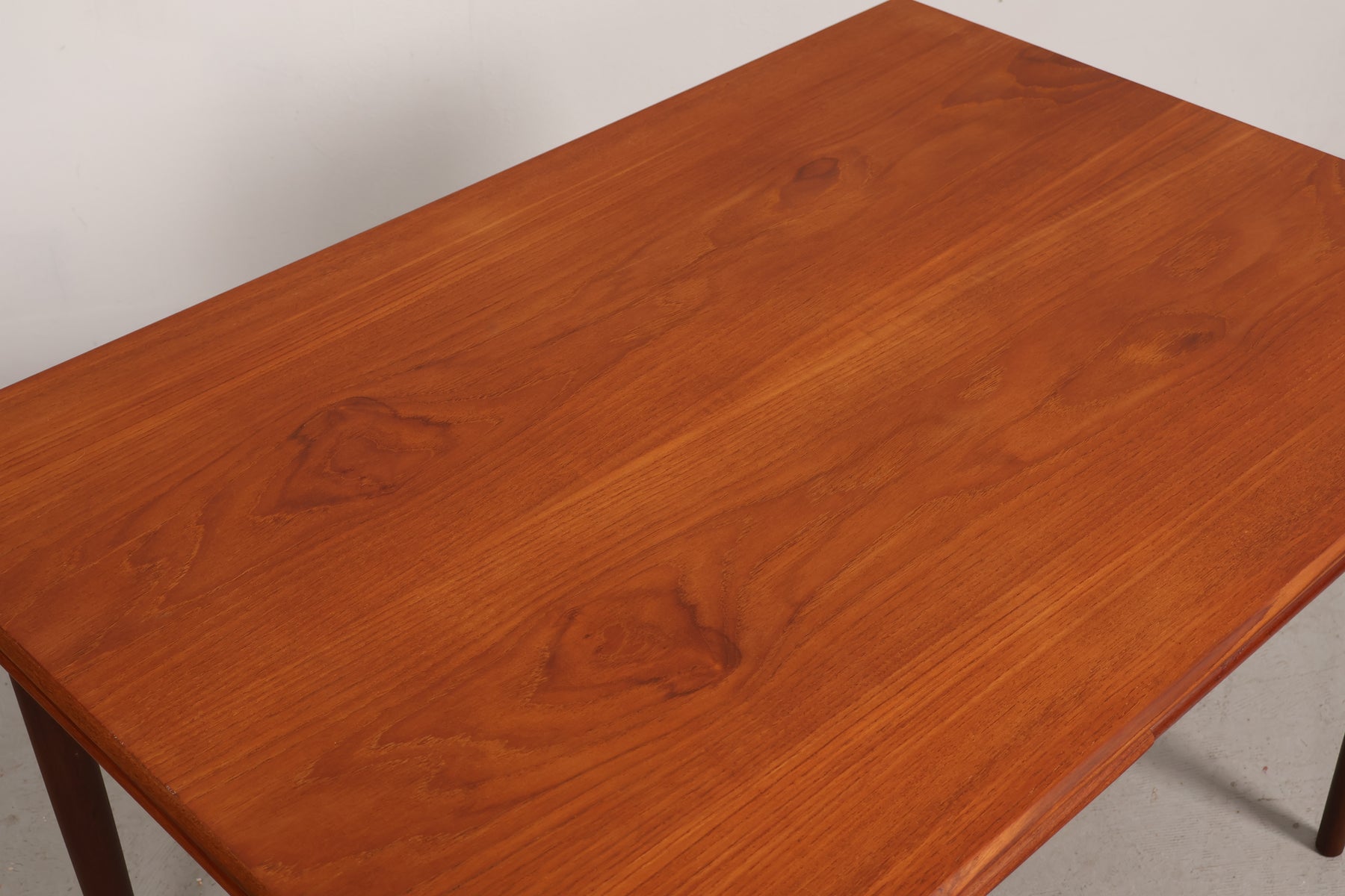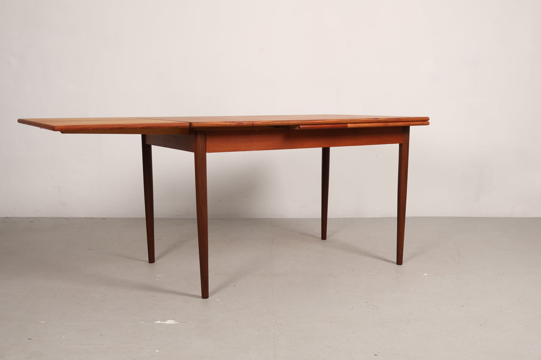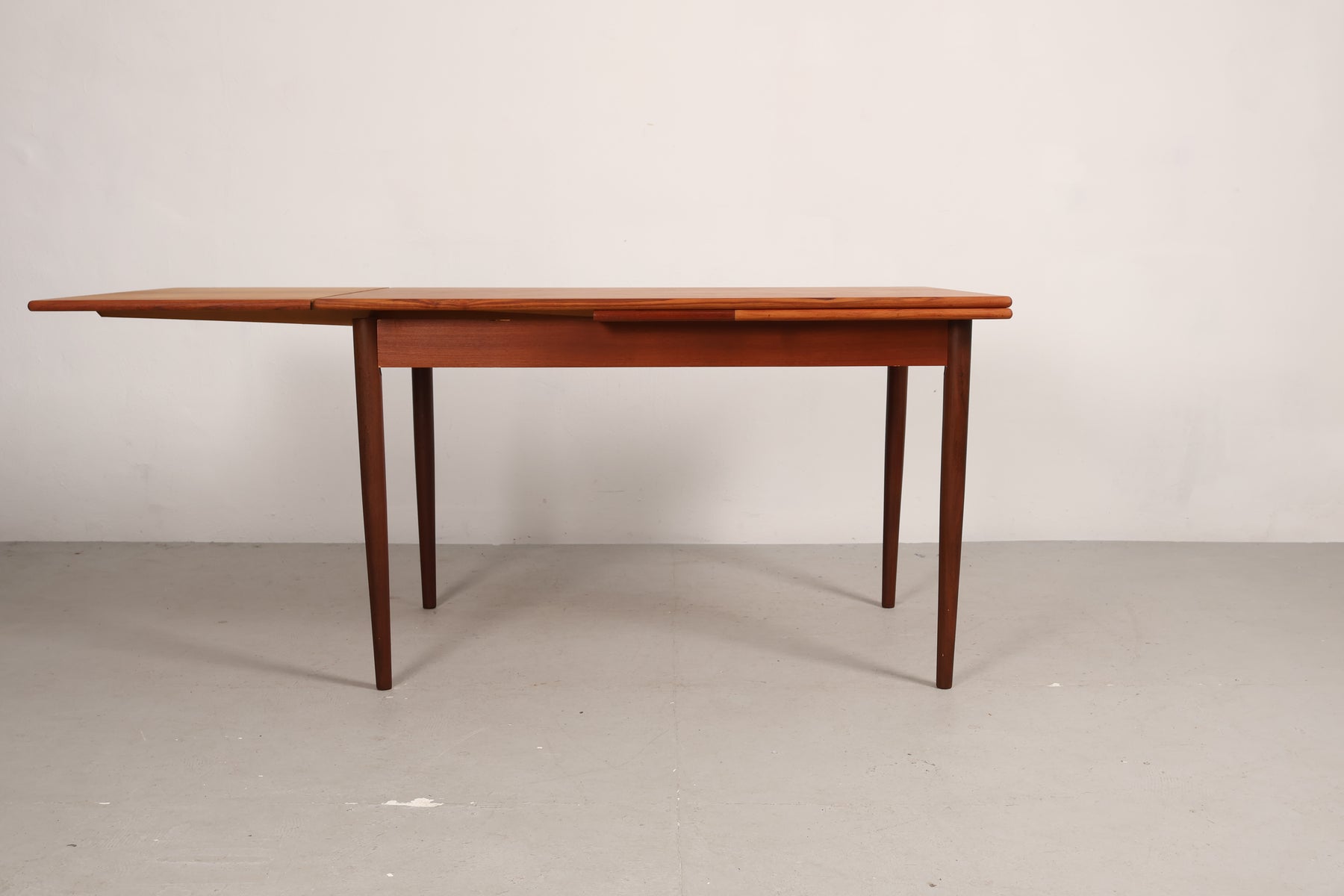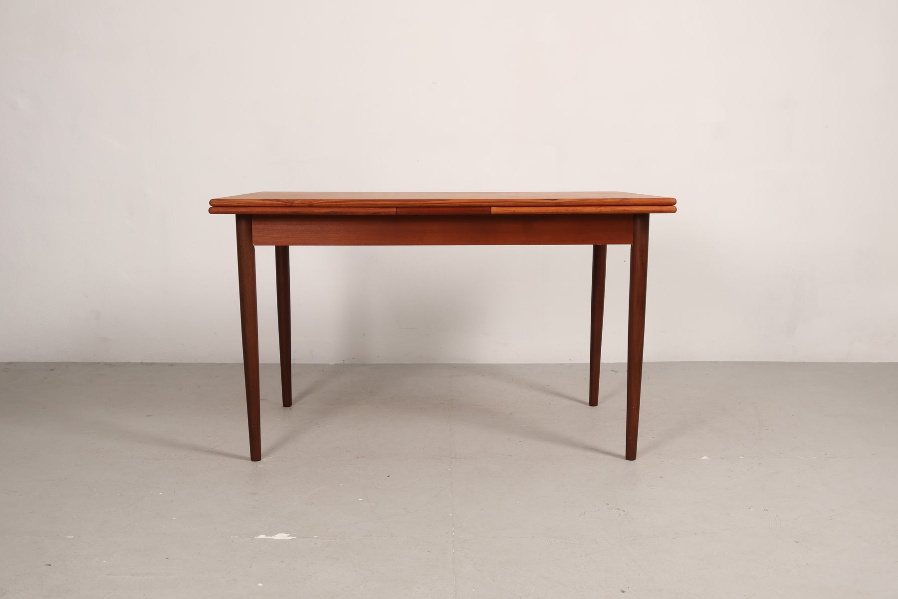 Esstisch aus den 60er-Jahren. Hergestellt in Dänemark. Gefertigt aus Teak. Höhe 74 cm, Breite 125 cm, Tiefe 85 cm.