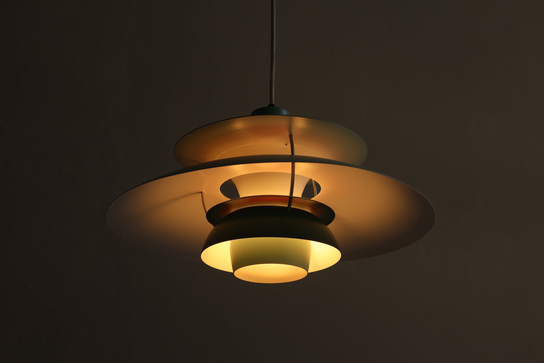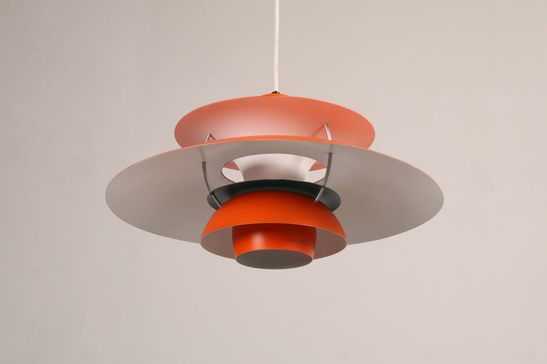 Deckenlampe „PH5“ aus den 60er-Jahren von Louis Poulsen. Hergestellt in Dänemark. Gefertigt aus Alu, versch. Farben. Höhe 27 cm, Breite 50 cm, Tiefe 50 cm.