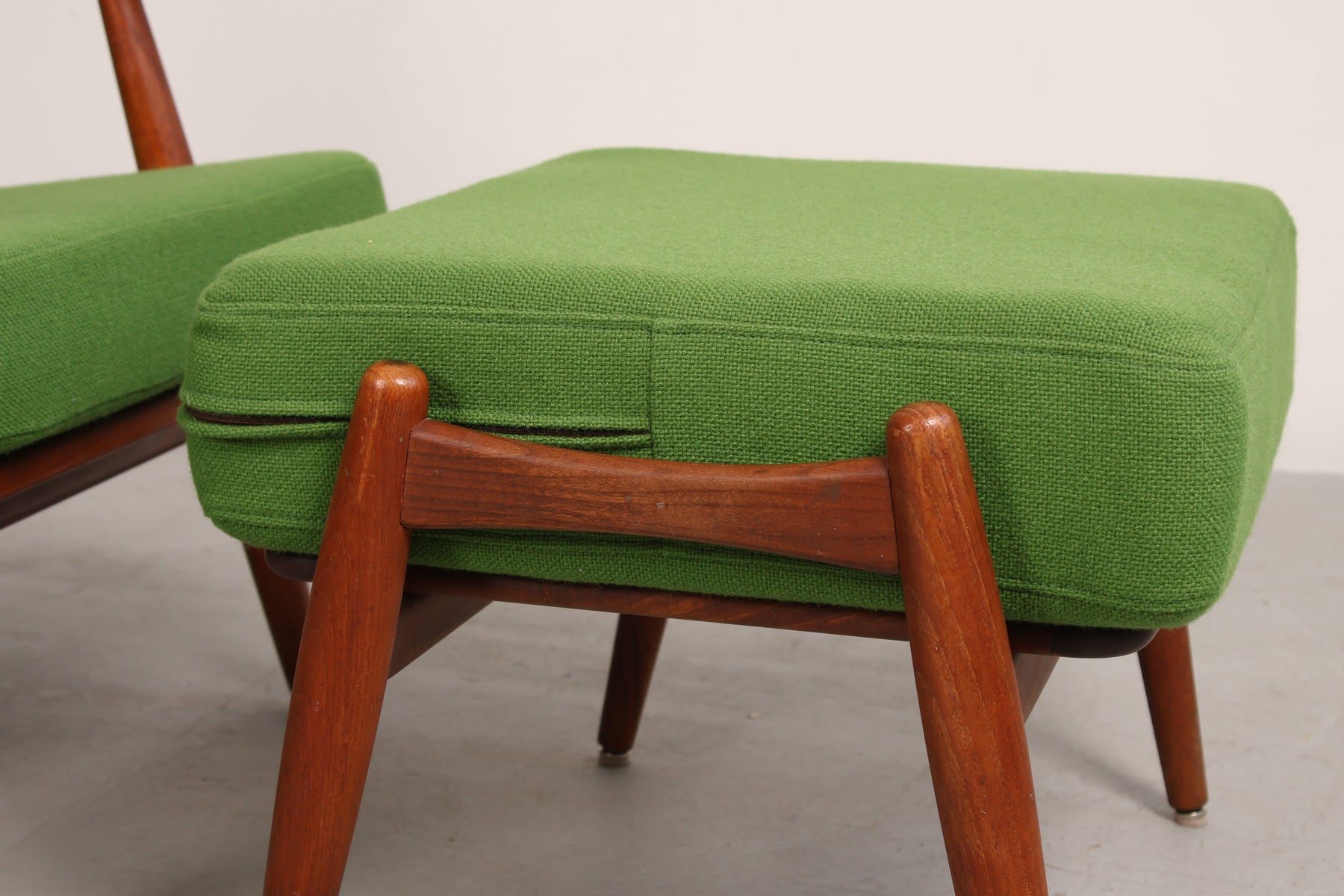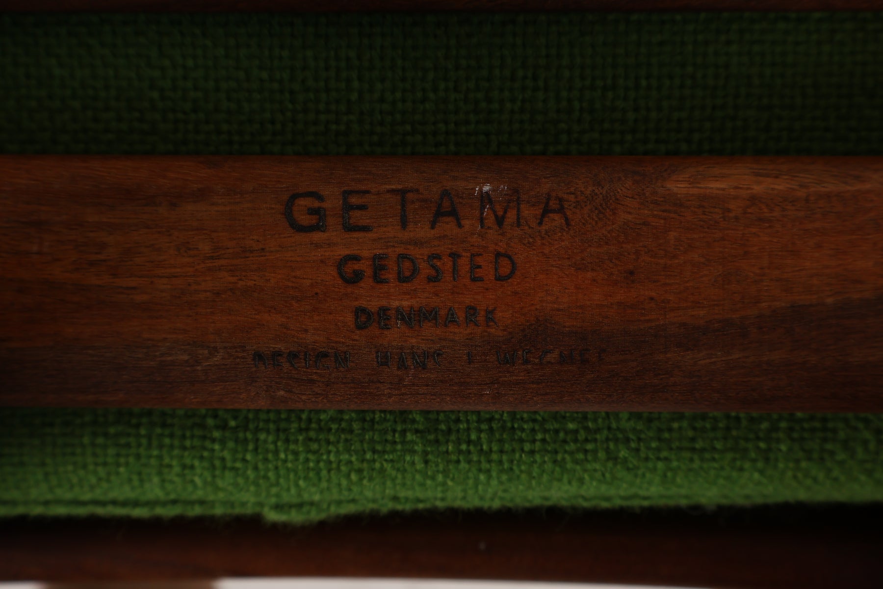 Sessel und Hocker „GE 270“ aus den 60er-Jahren von Hans Wegner für Getama. Hergestellt in Dänemark. Gefertigt aus Teak. Höhe 76 cm, Breite 126 cm, Tiefe 78 cm.