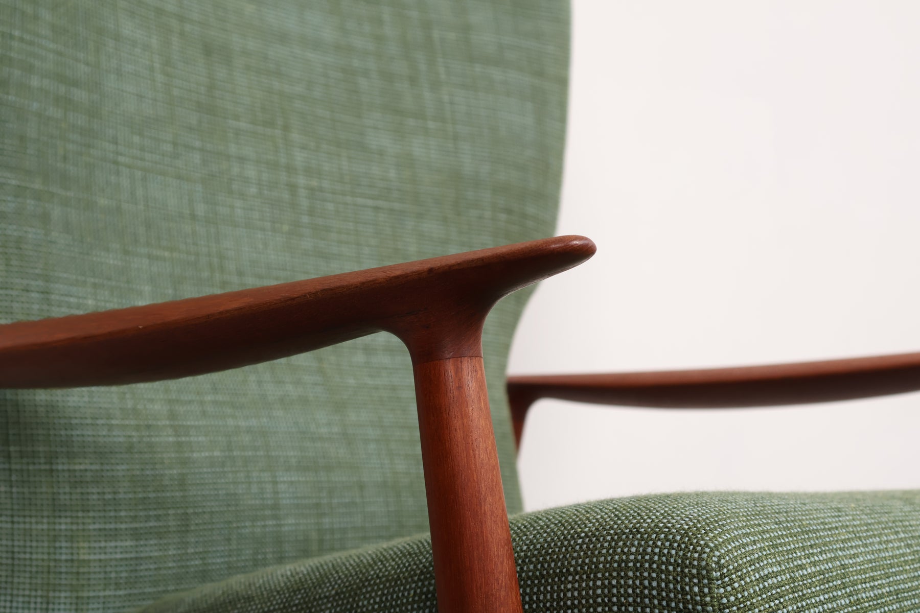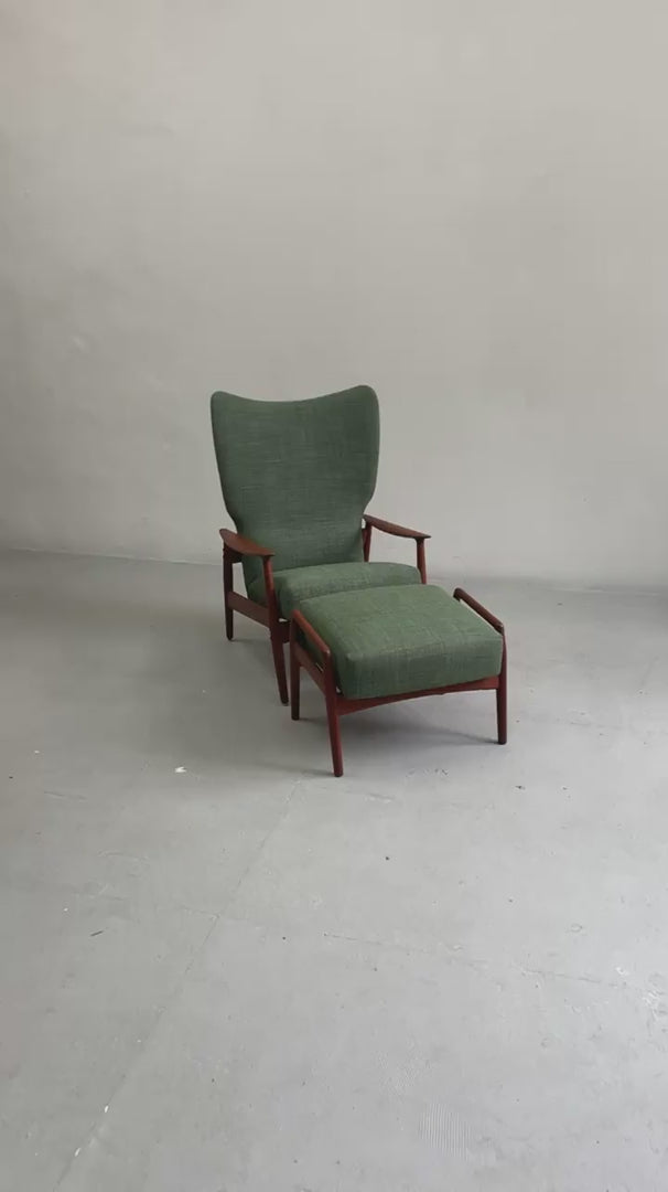 Sessel und Hocker aus den 60er-Jahren von K. Rasmussen für Peter Wessel. Hergestellt in Norwegen. Gefertigt aus Teak. Höhe 101 cm, Breite 70 cm, Tiefe 71 cm.