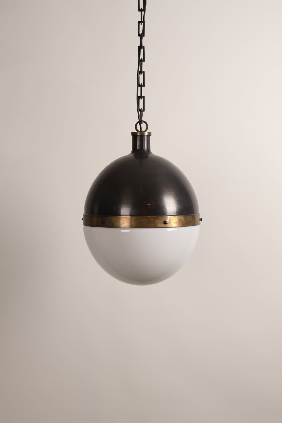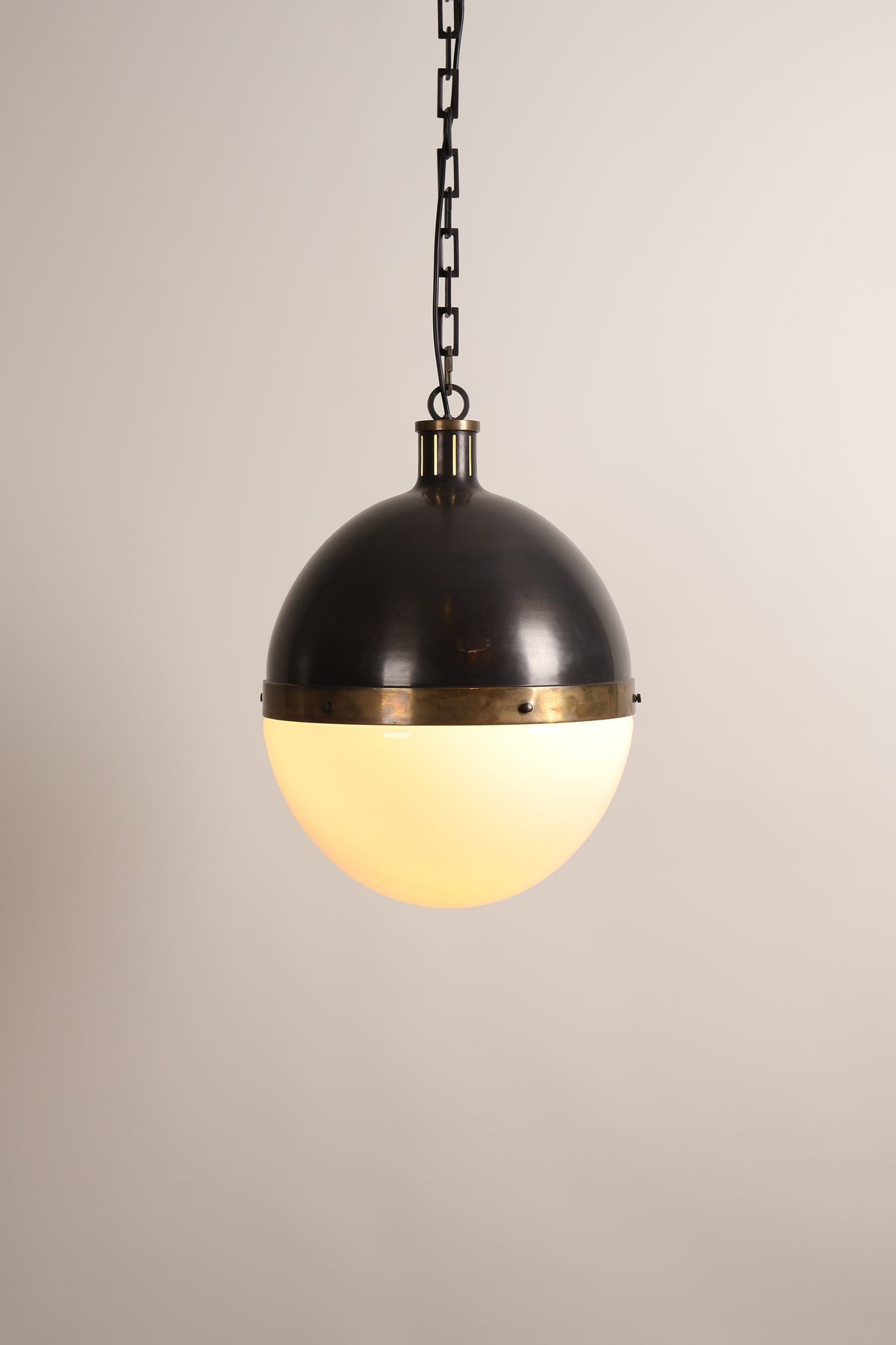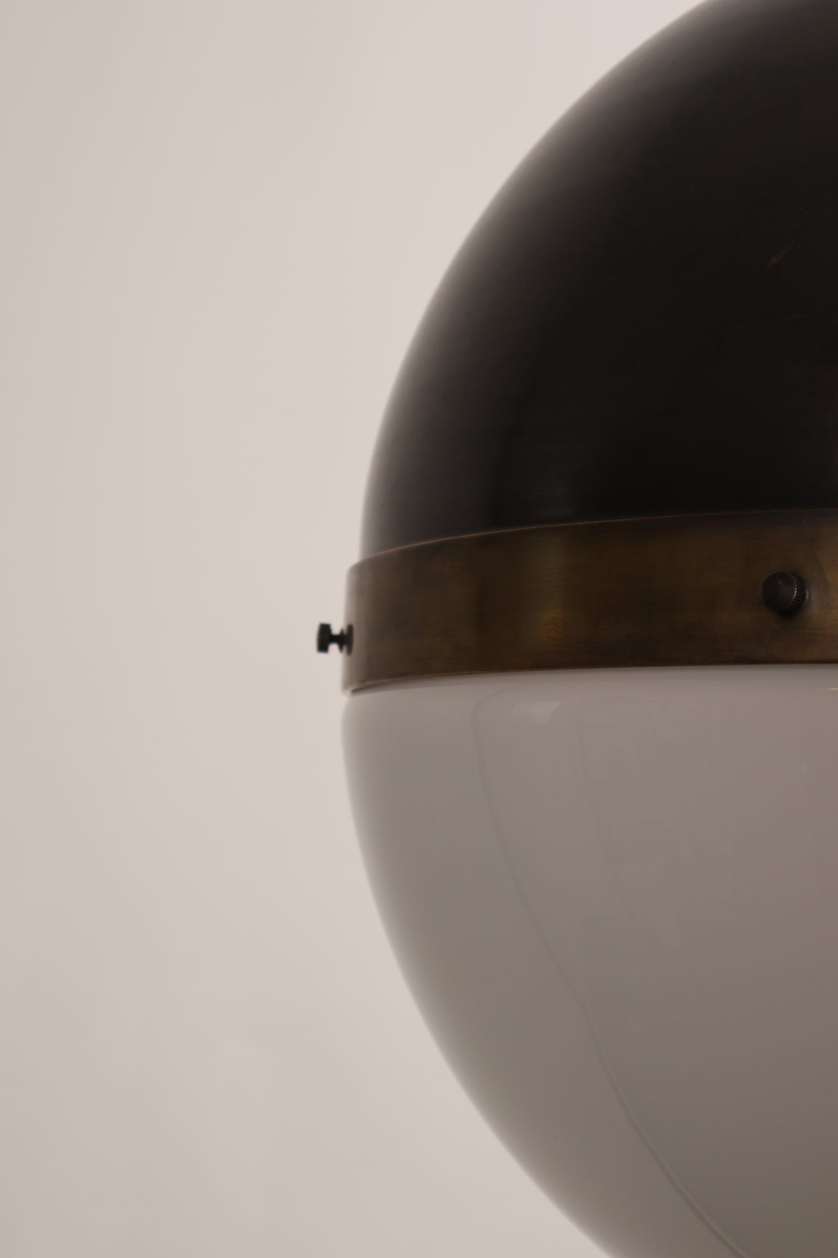 Plafondlamp uit de jaren 70 van Thomas O’Brien voor Hicks Pedant. Gemaakt in de VS. Vervaardigd uit messing en opaalglas. Hoogte 53 cm, breedte 36 cm, diepte 36 cm.