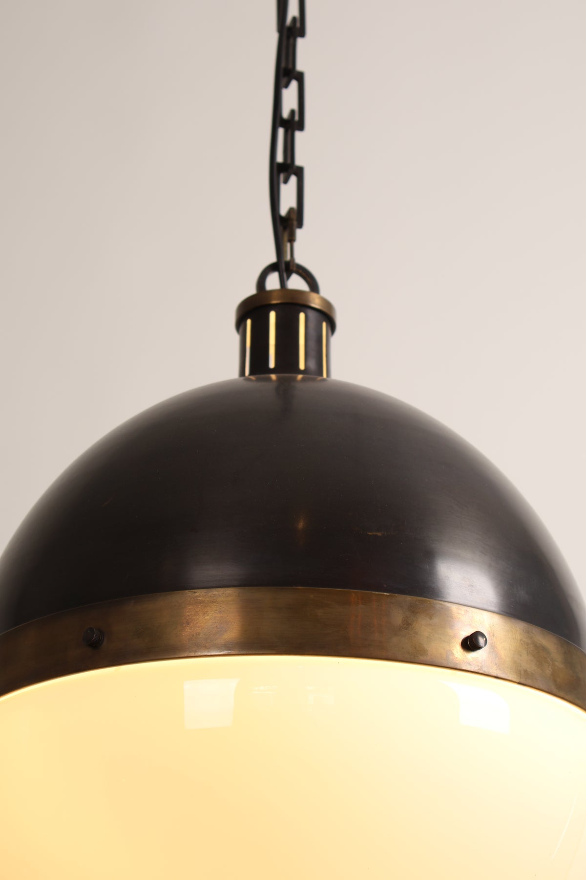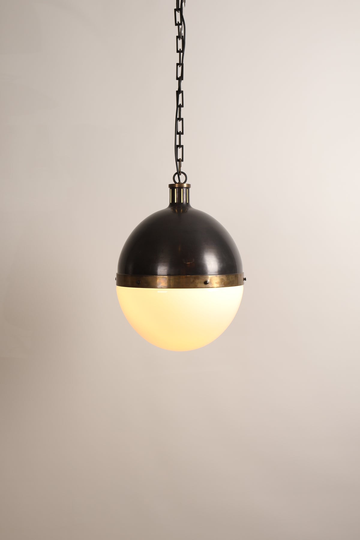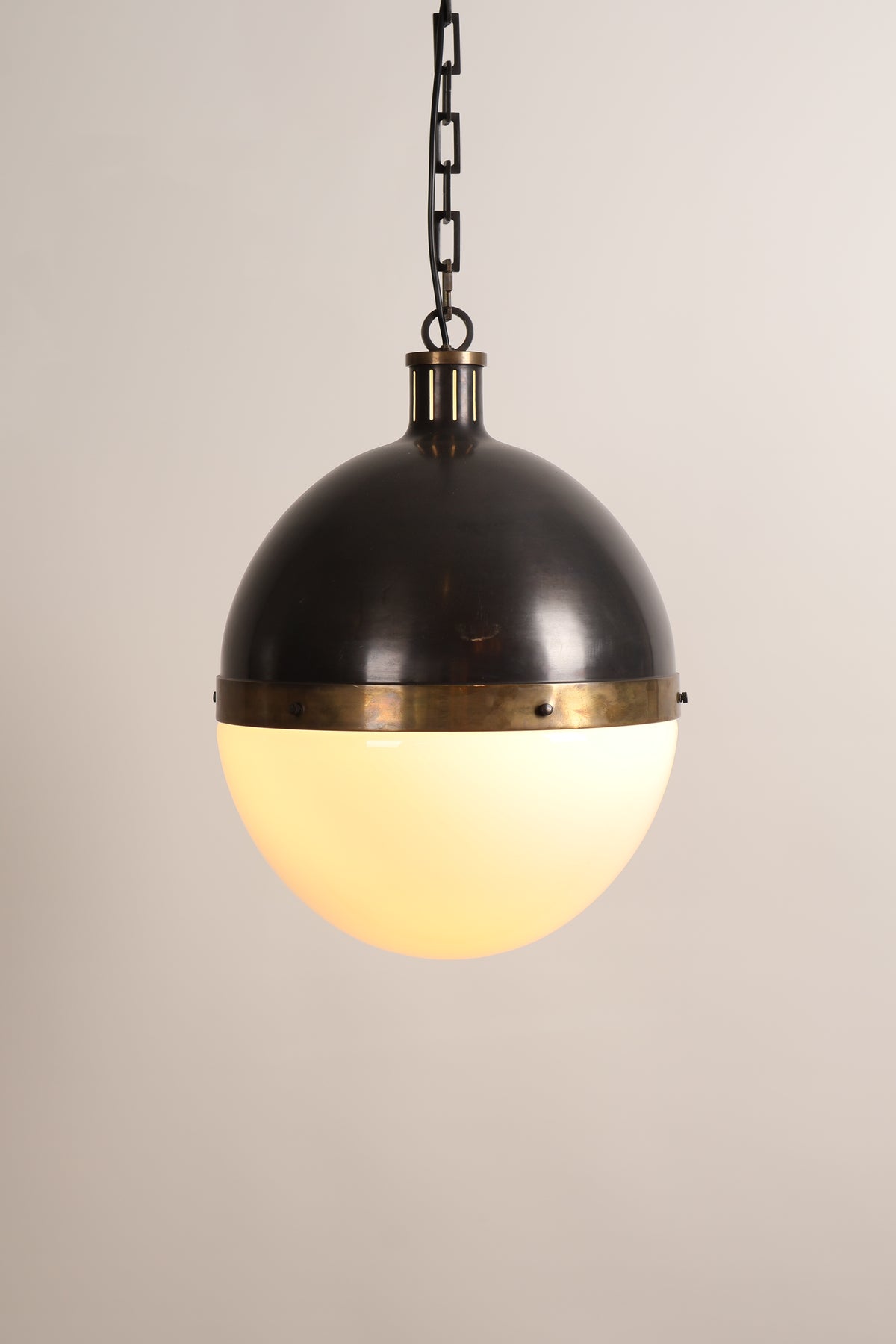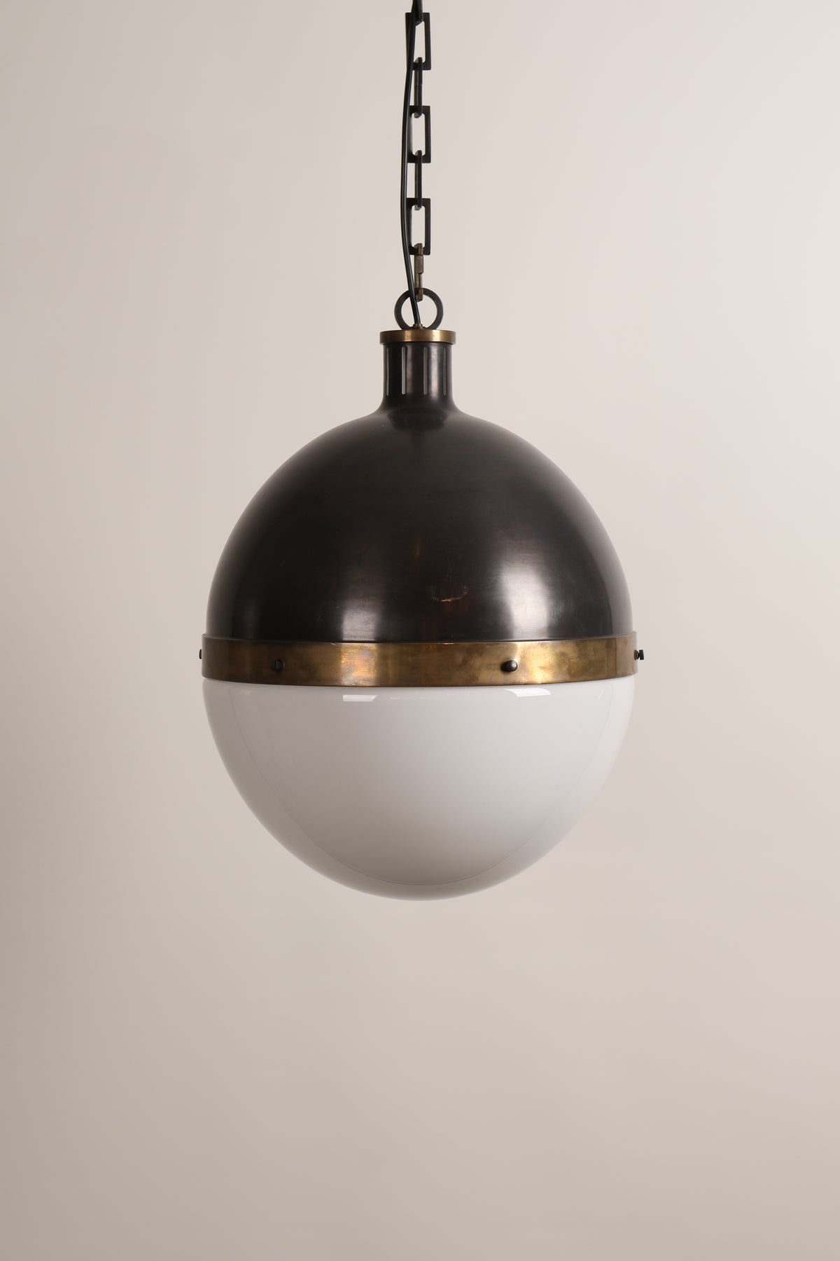Plafondlamp uit de jaren 70 van Thomas O’Brien voor Hicks Pedant. Gemaakt in de VS. Vervaardigd uit messing en opaalglas. Hoogte 53 cm, breedte 36 cm, diepte 36 cm.