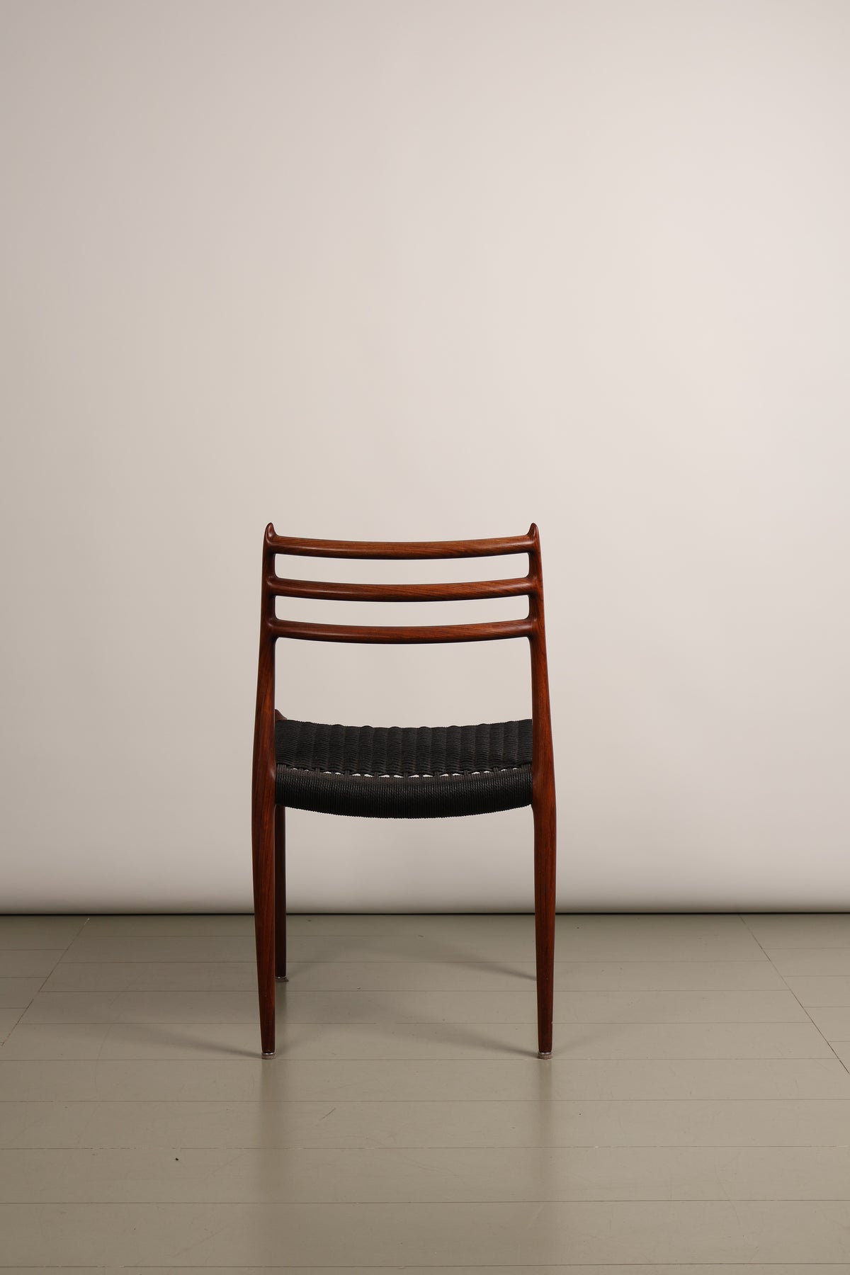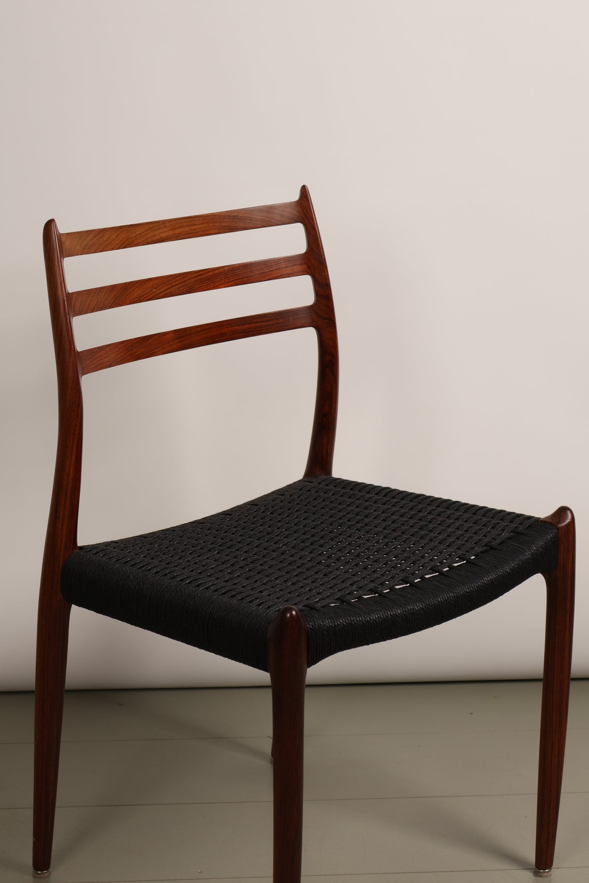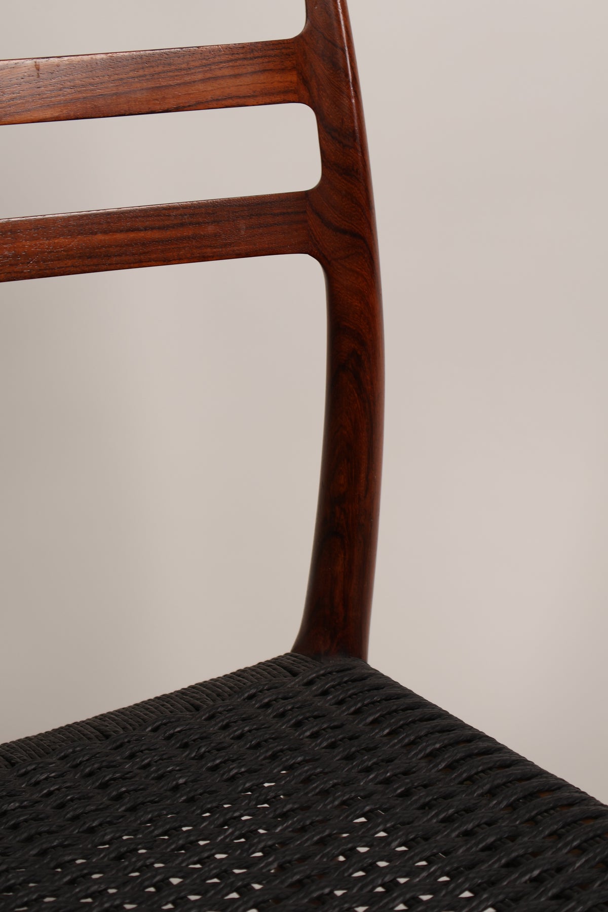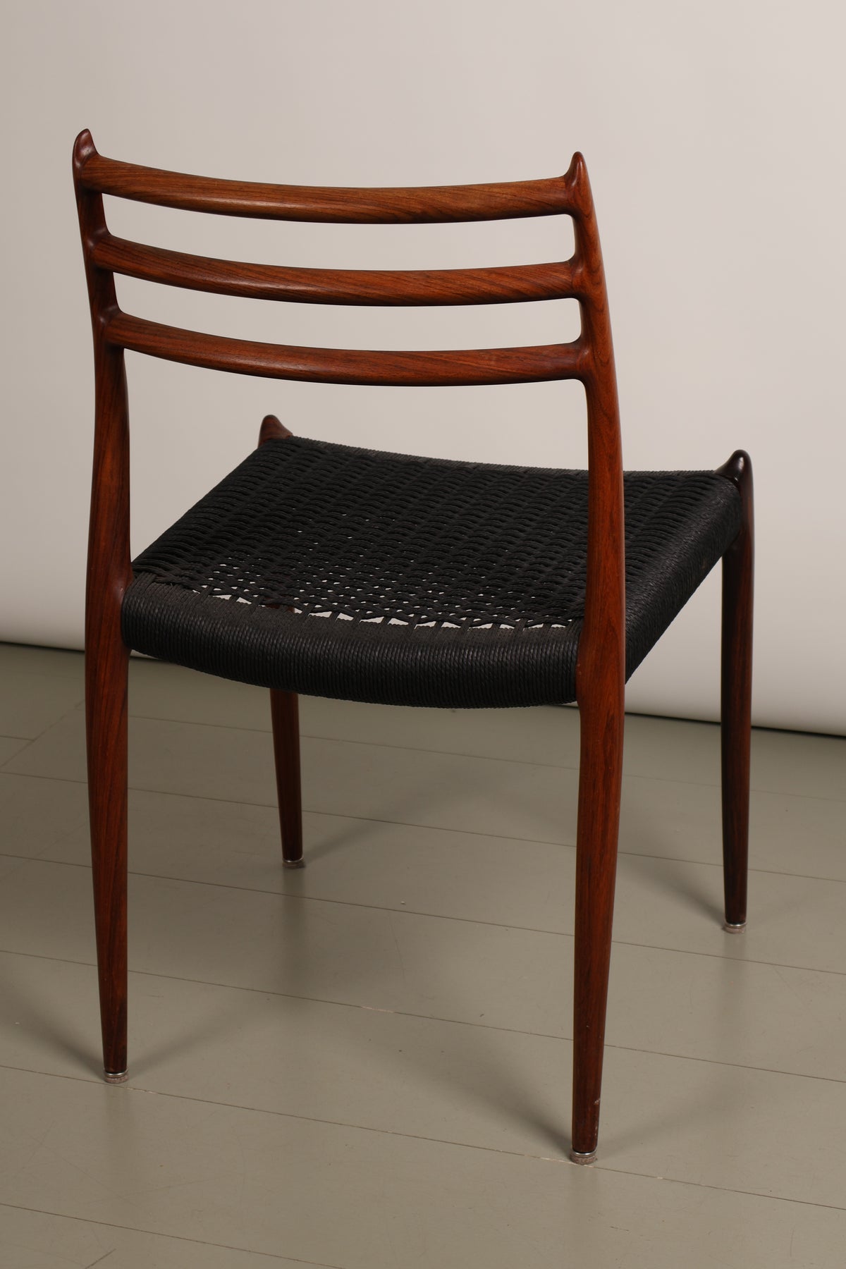 Stoel “Model 78” uit de jaren 60 van Niels Otto Møller voor J L Møbelfabrik. Gemaakt in Denemarken. Vervaardigd uit palissander en papkoord. Hoogte 82 cm, breedte 48 cm, diepte 46 cm.