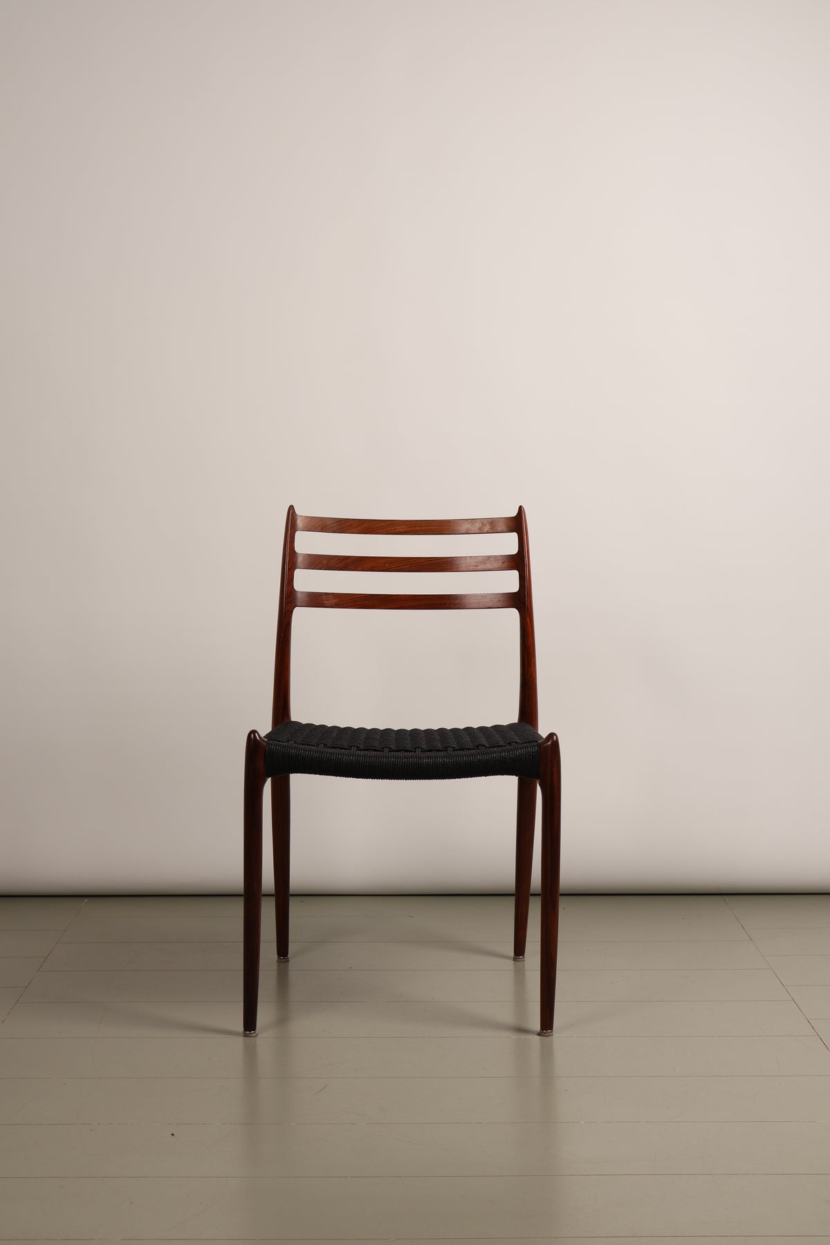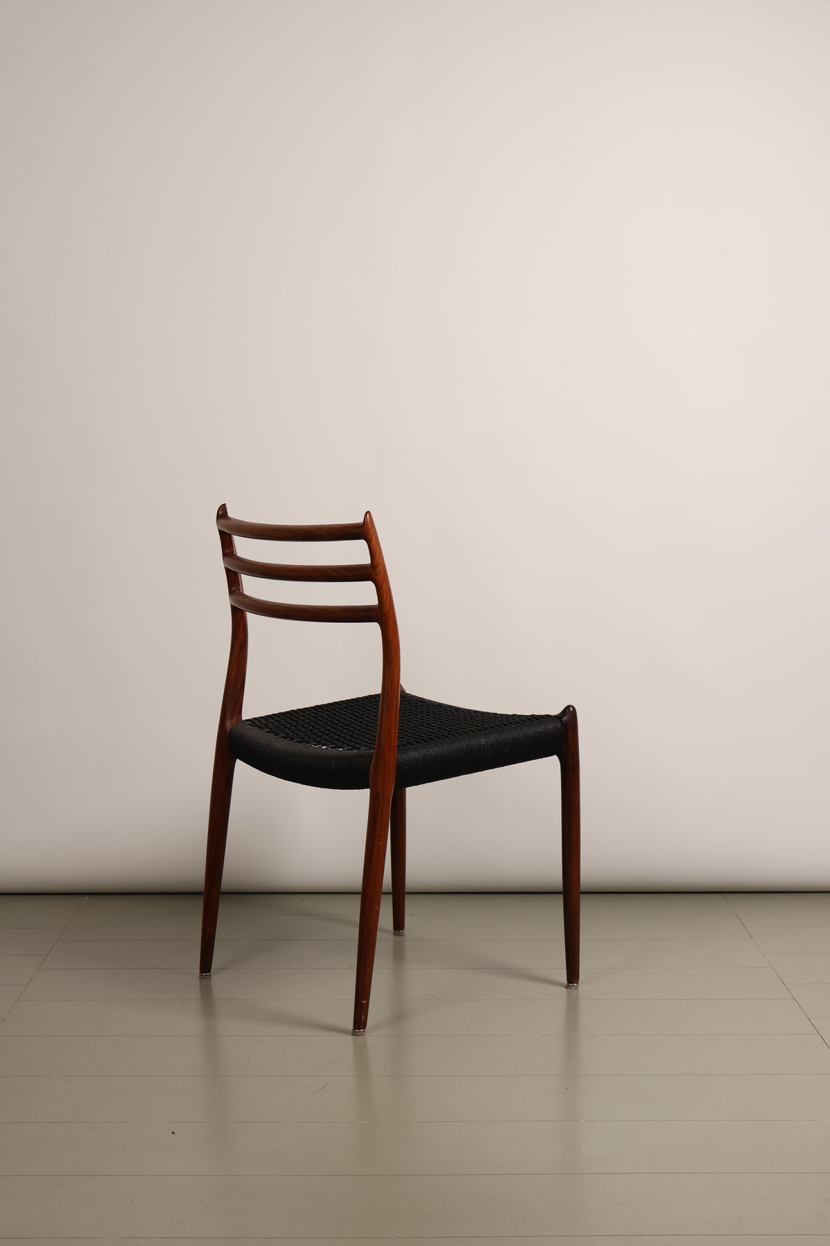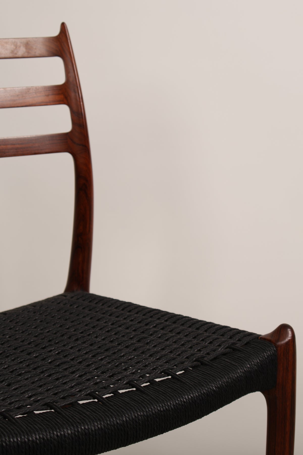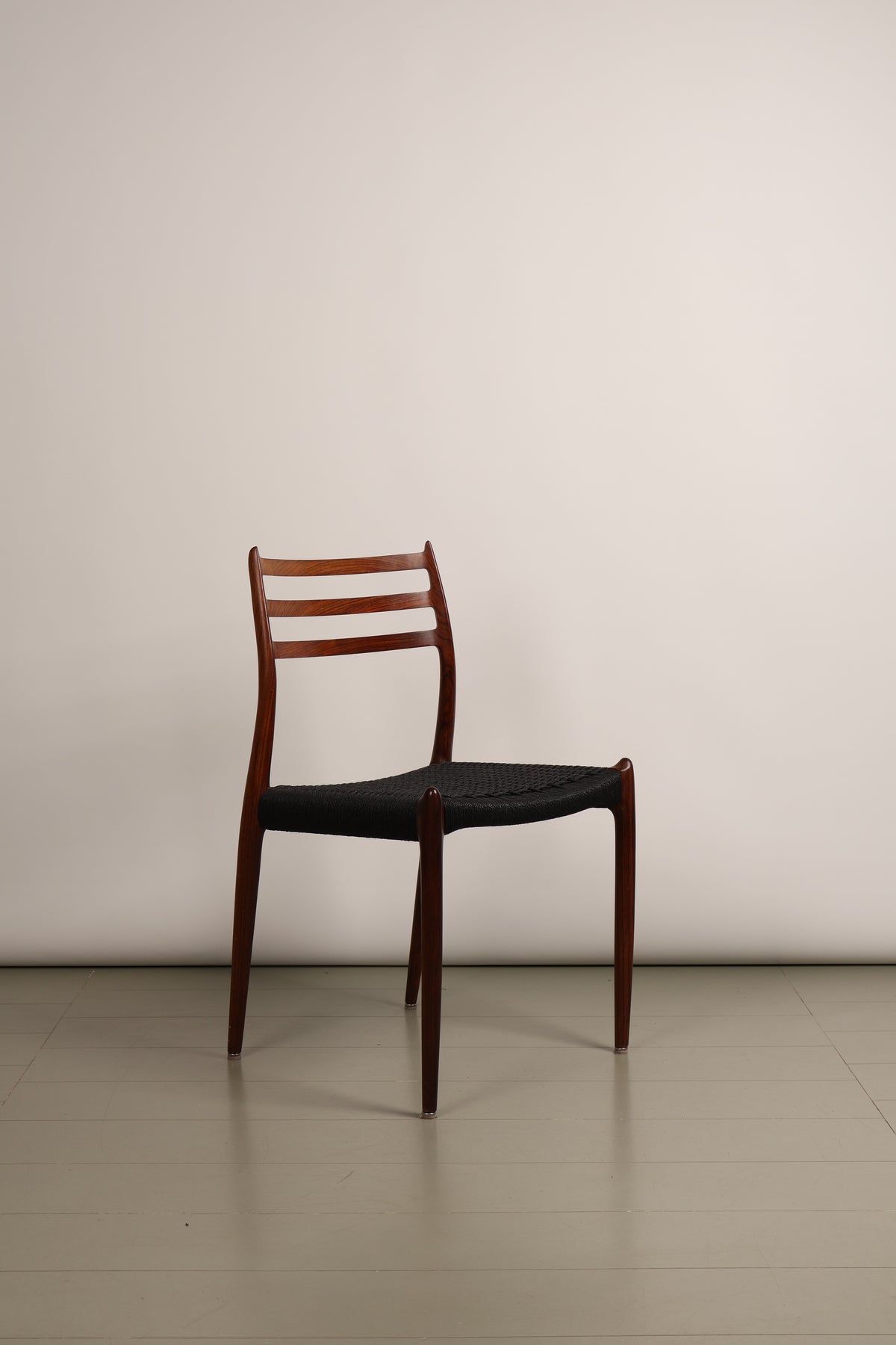 Stoel “Model 78” uit de jaren 60 van Niels Otto Møller voor J L Møbelfabrik. Gemaakt in Denemarken. Vervaardigd uit palissander en papkoord. Hoogte 82 cm, breedte 48 cm, diepte 46 cm.