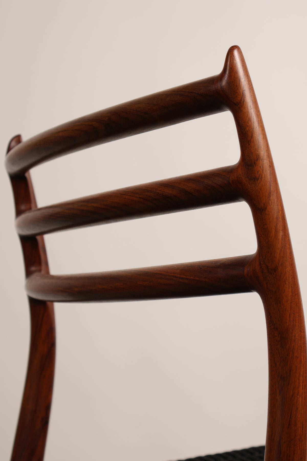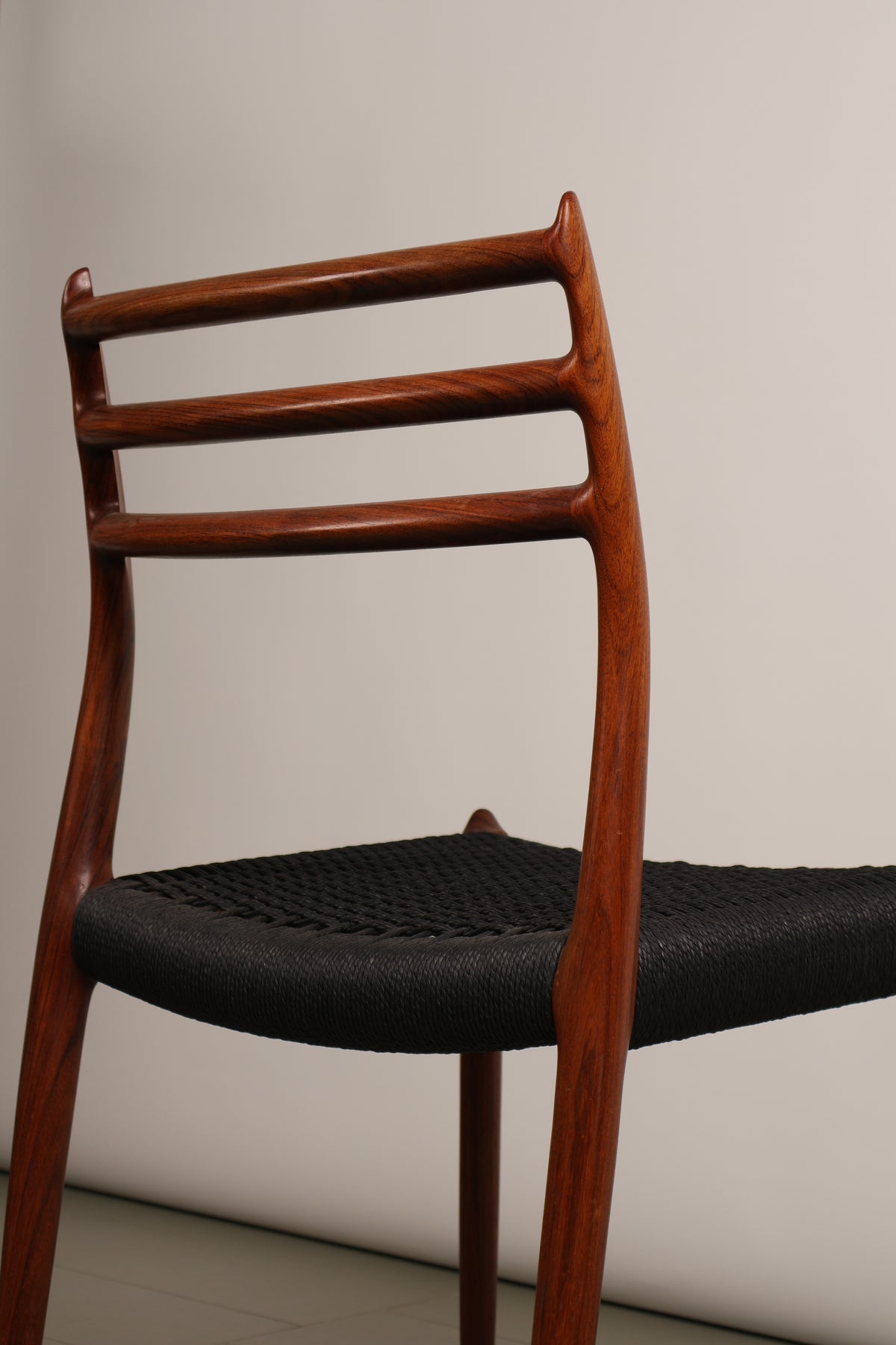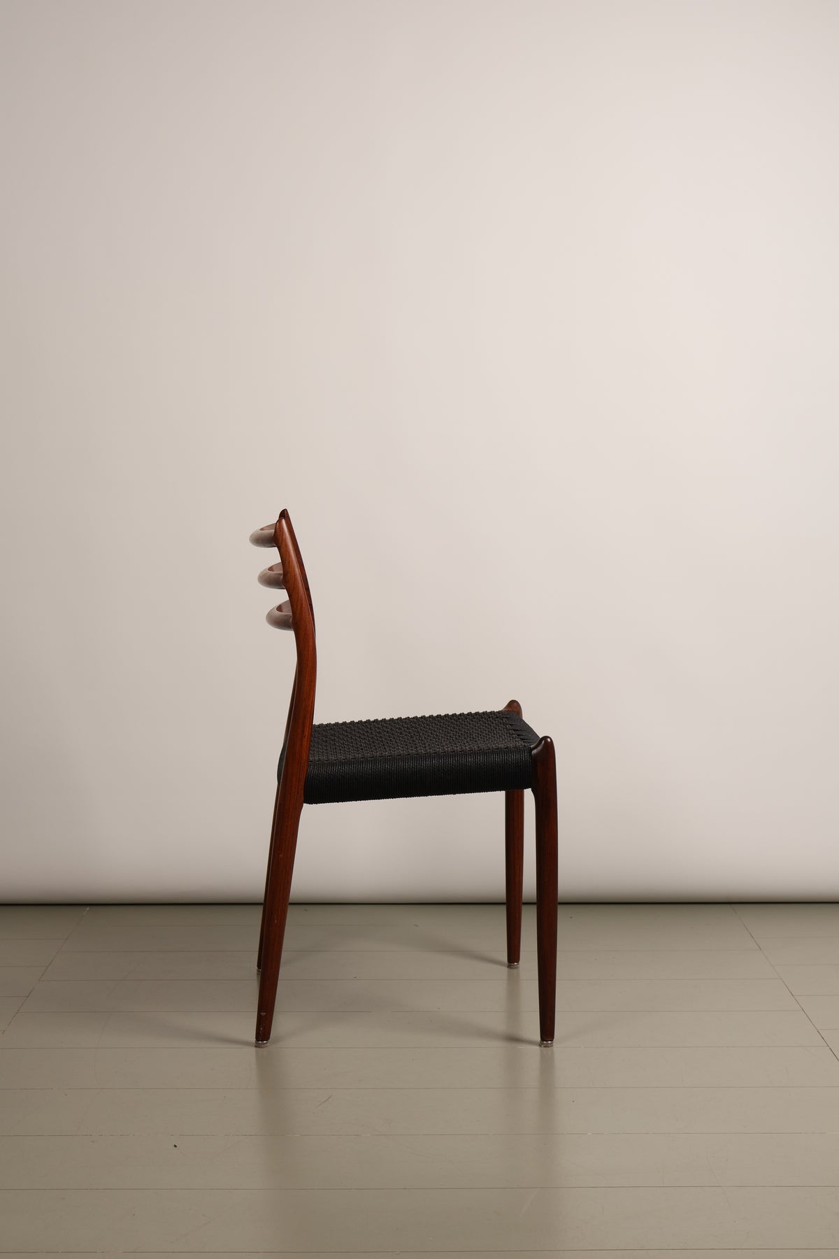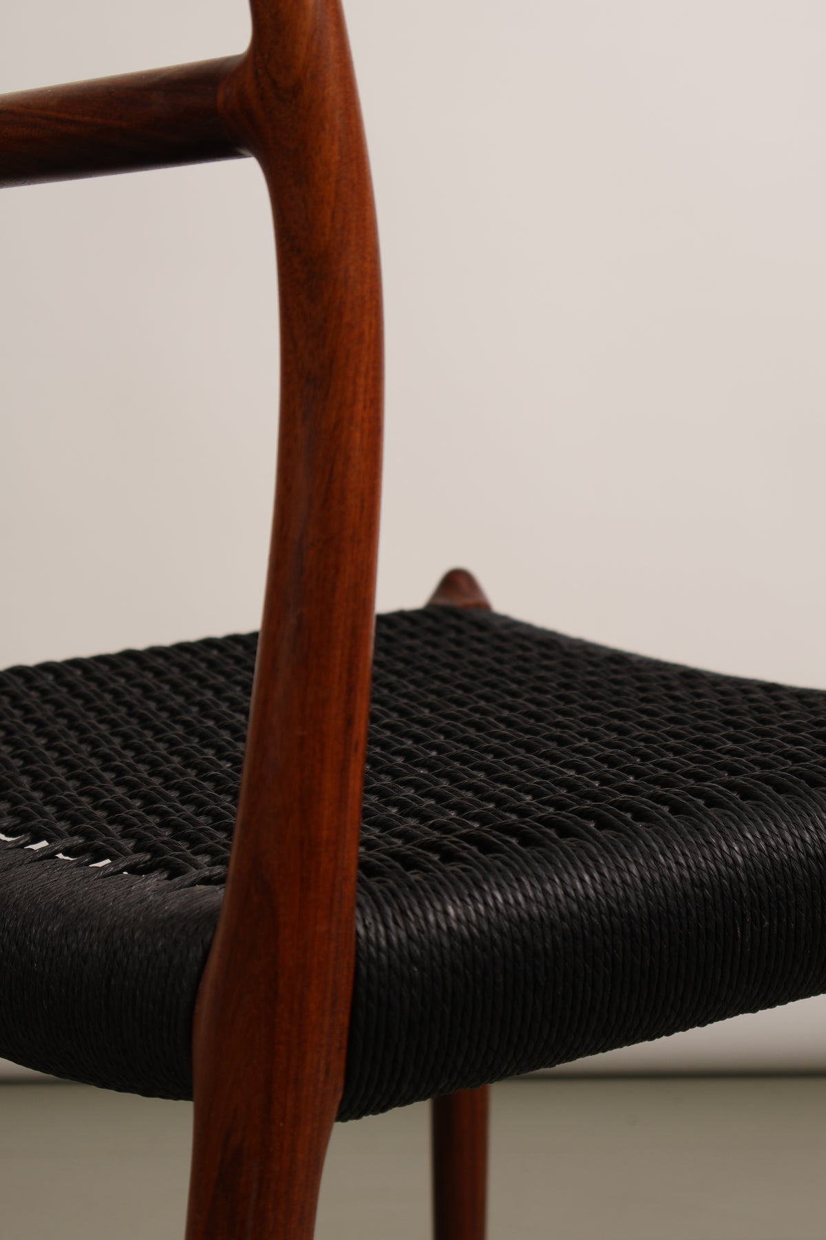 Stoel “Model 78” uit de jaren 60 van Niels Otto Møller voor J L Møbelfabrik. Gemaakt in Denemarken. Vervaardigd uit palissander en papkoord. Hoogte 82 cm, breedte 48 cm, diepte 46 cm.