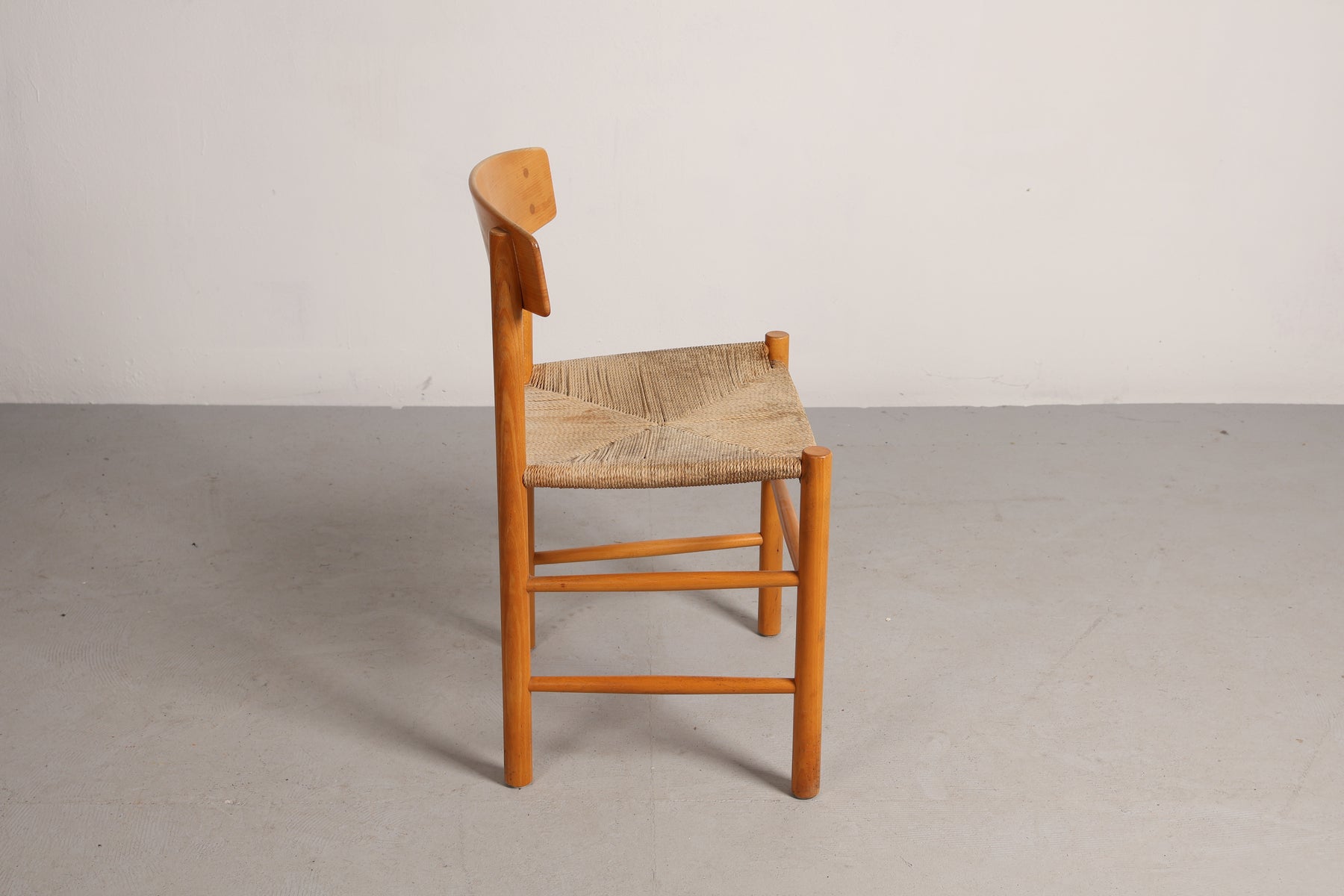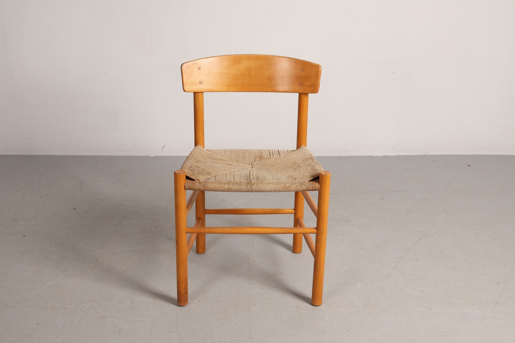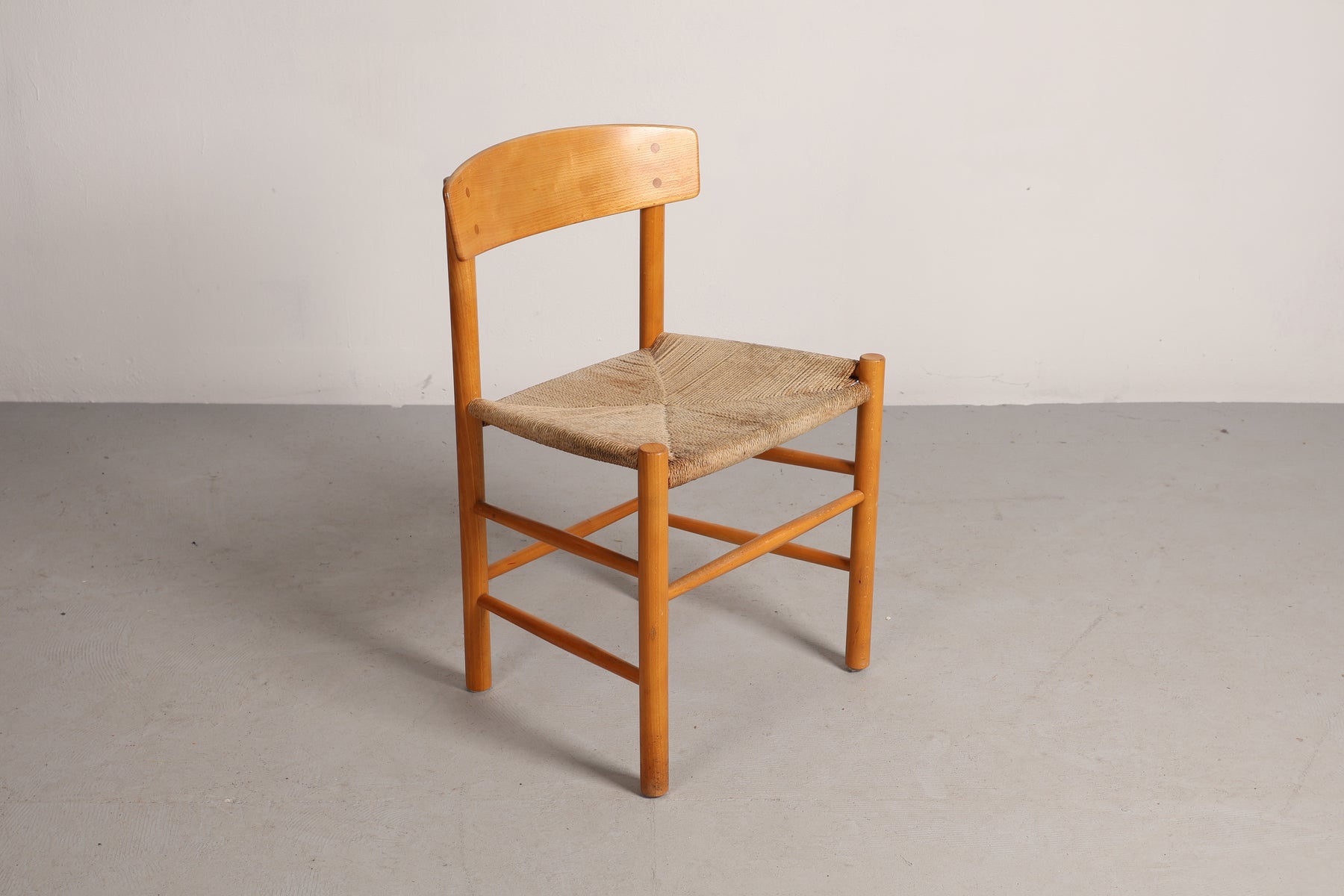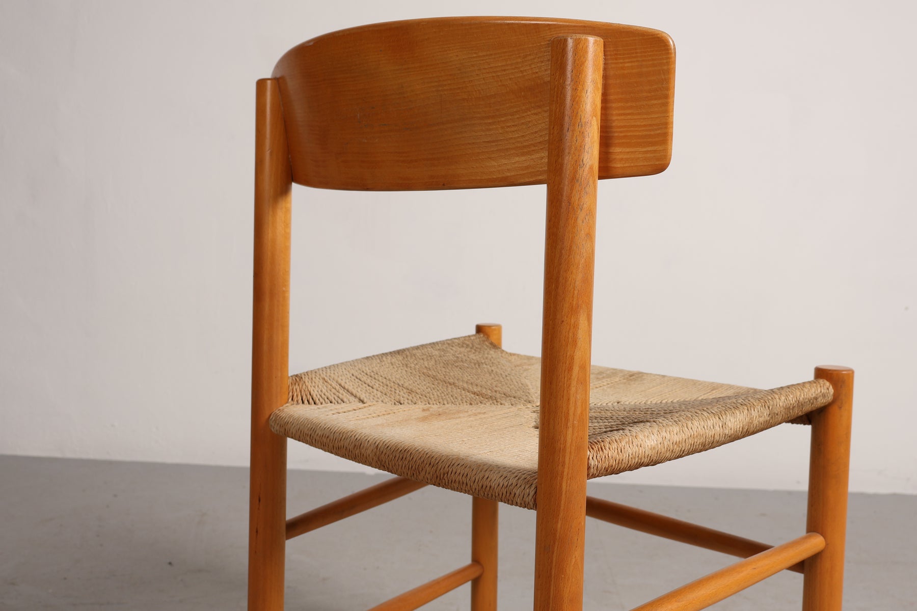 Stoel “J39” uit de jaren 60 van Børge Mogensen. Gemaakt in Denemarken. Vervaardigd uit eiken en papkoord. Hoogte 44 cm, breedte 48 cm, diepte 43 cm.