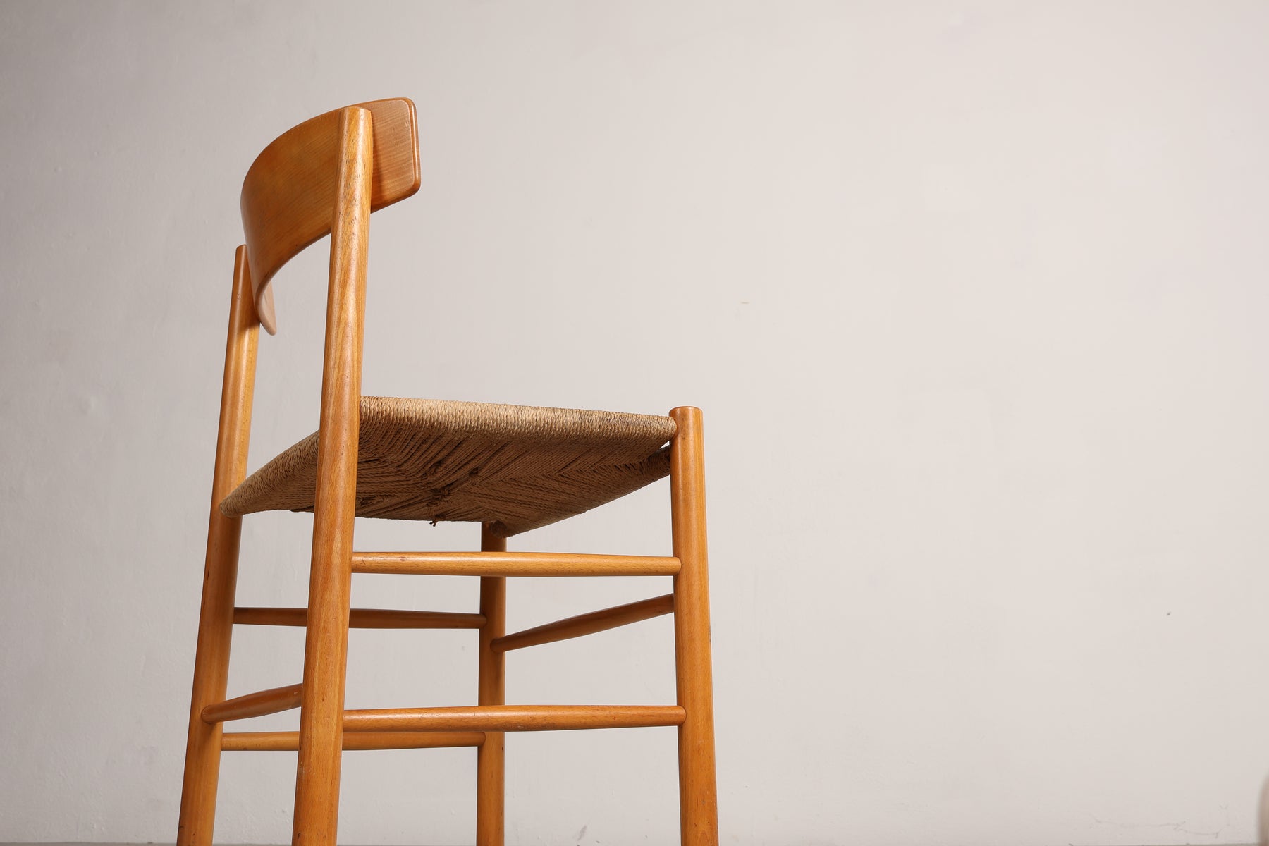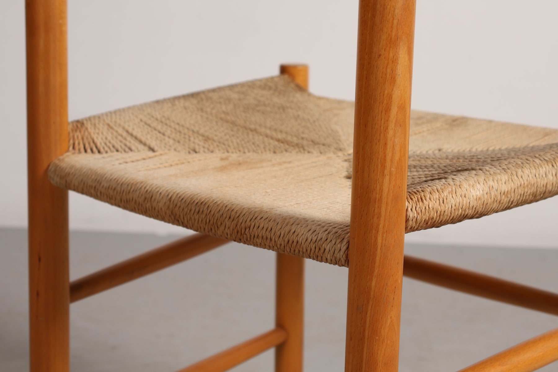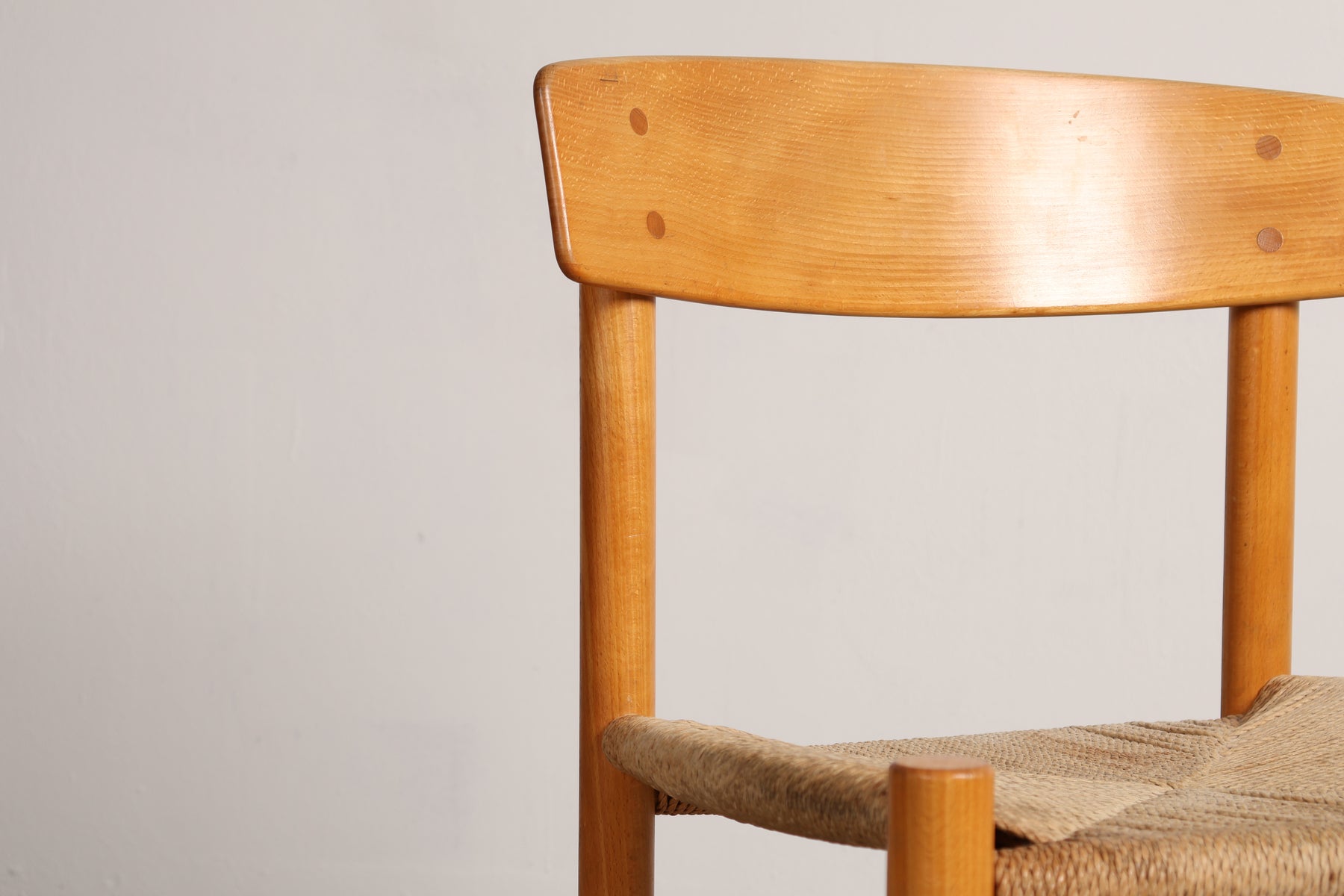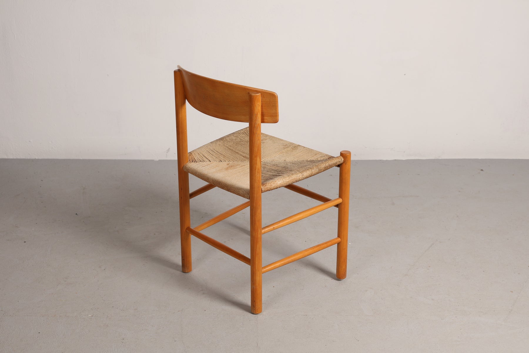 Stoel “J39” uit de jaren 60 van Børge Mogensen. Gemaakt in Denemarken. Vervaardigd uit eiken en papkoord. Hoogte 44 cm, breedte 48 cm, diepte 43 cm.