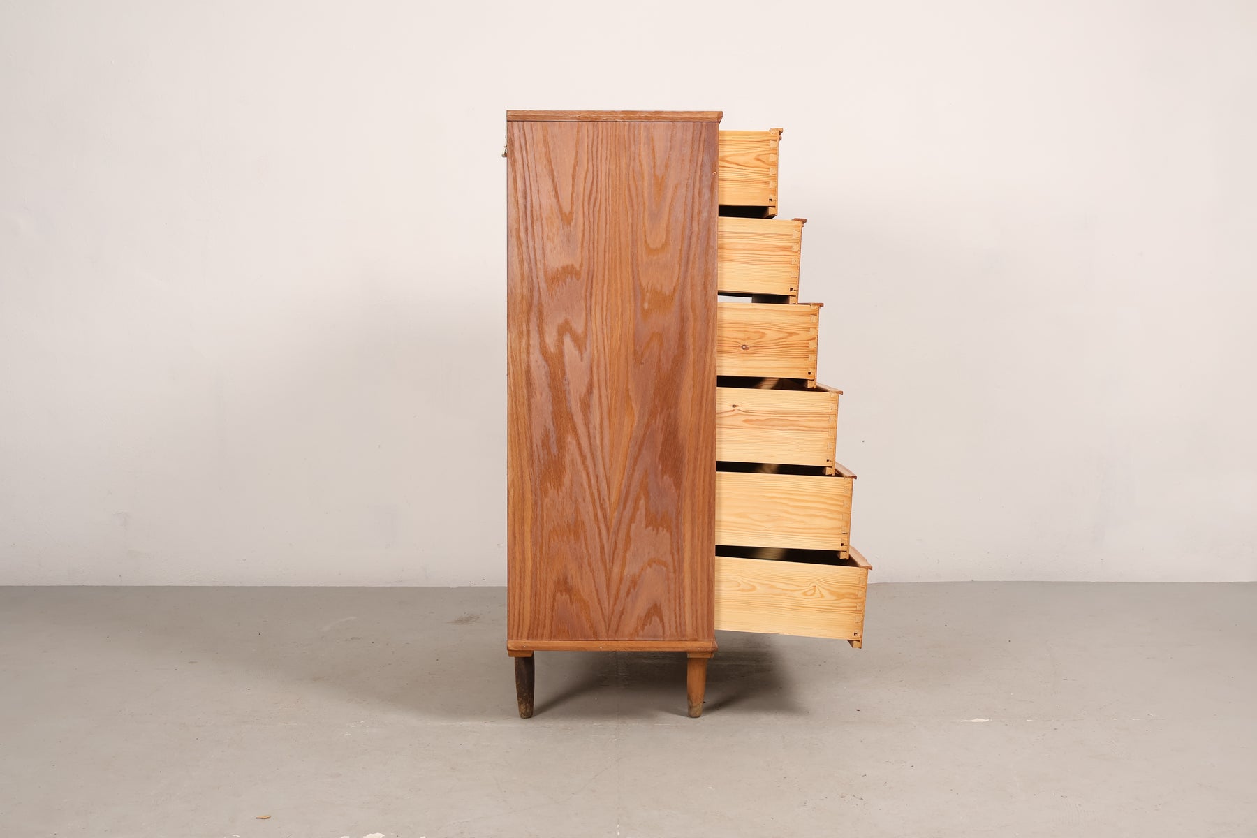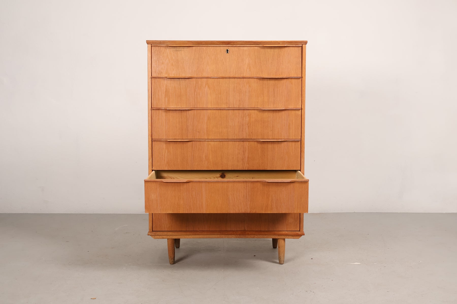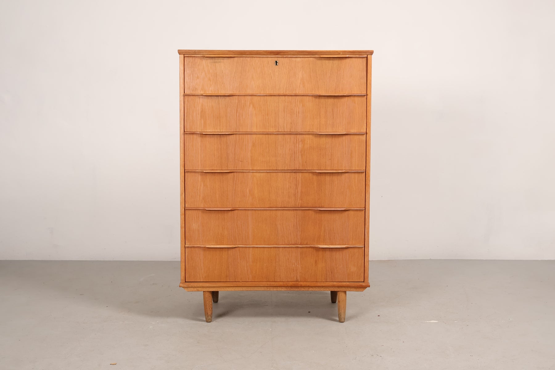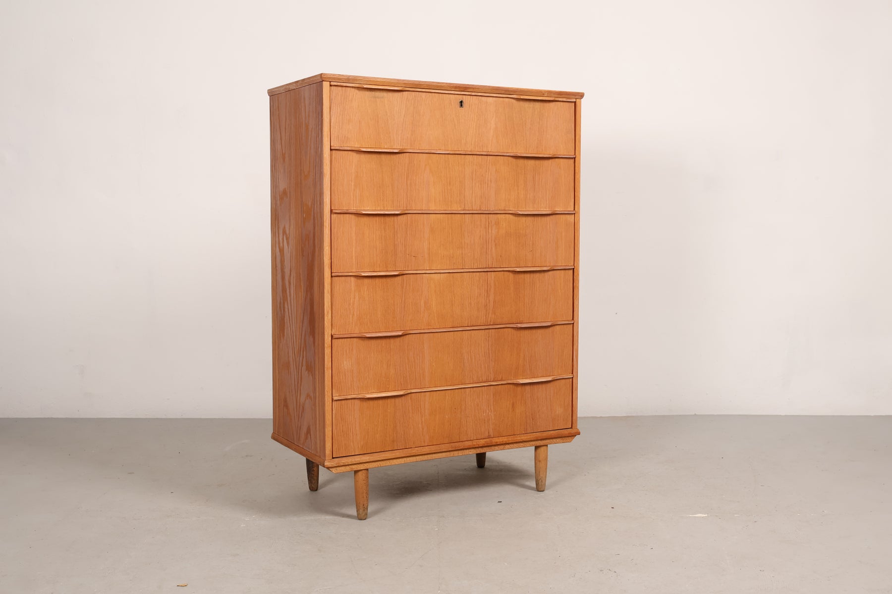 Kommode aus den 60er-Jahren. Hergestellt in Dänemark. Gefertigt aus Eiche. Höhe 122 cm, Breite 85 cm, Tiefe 41 cm.