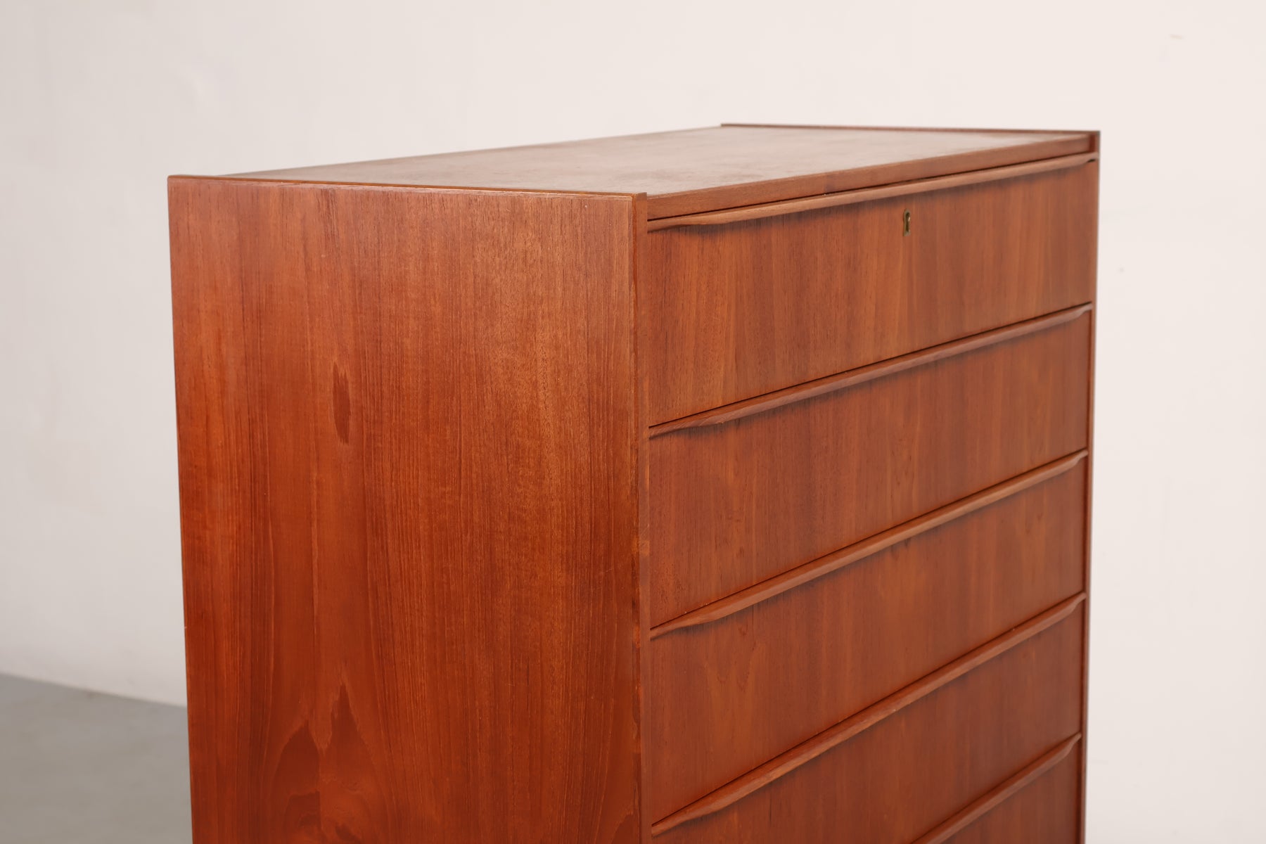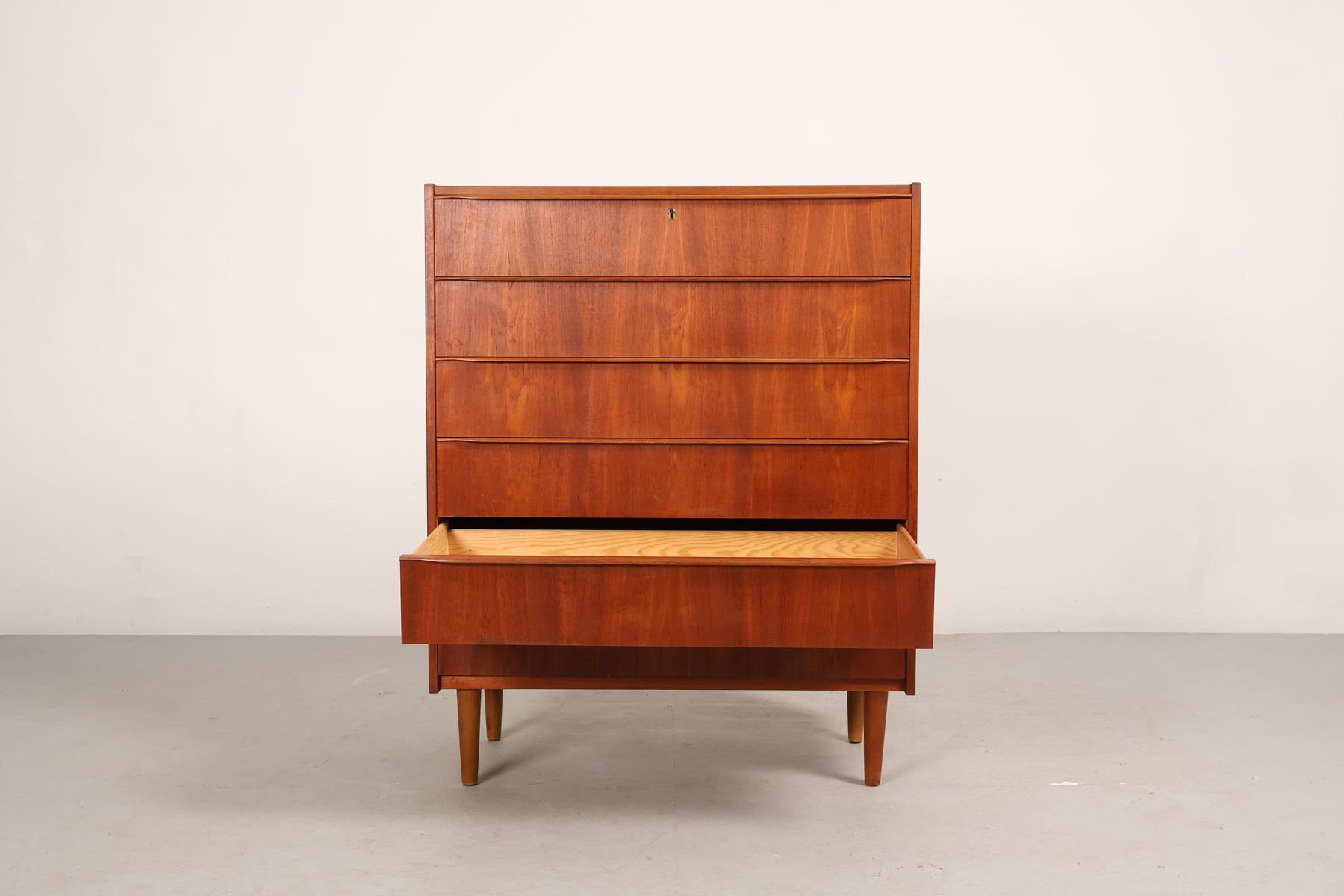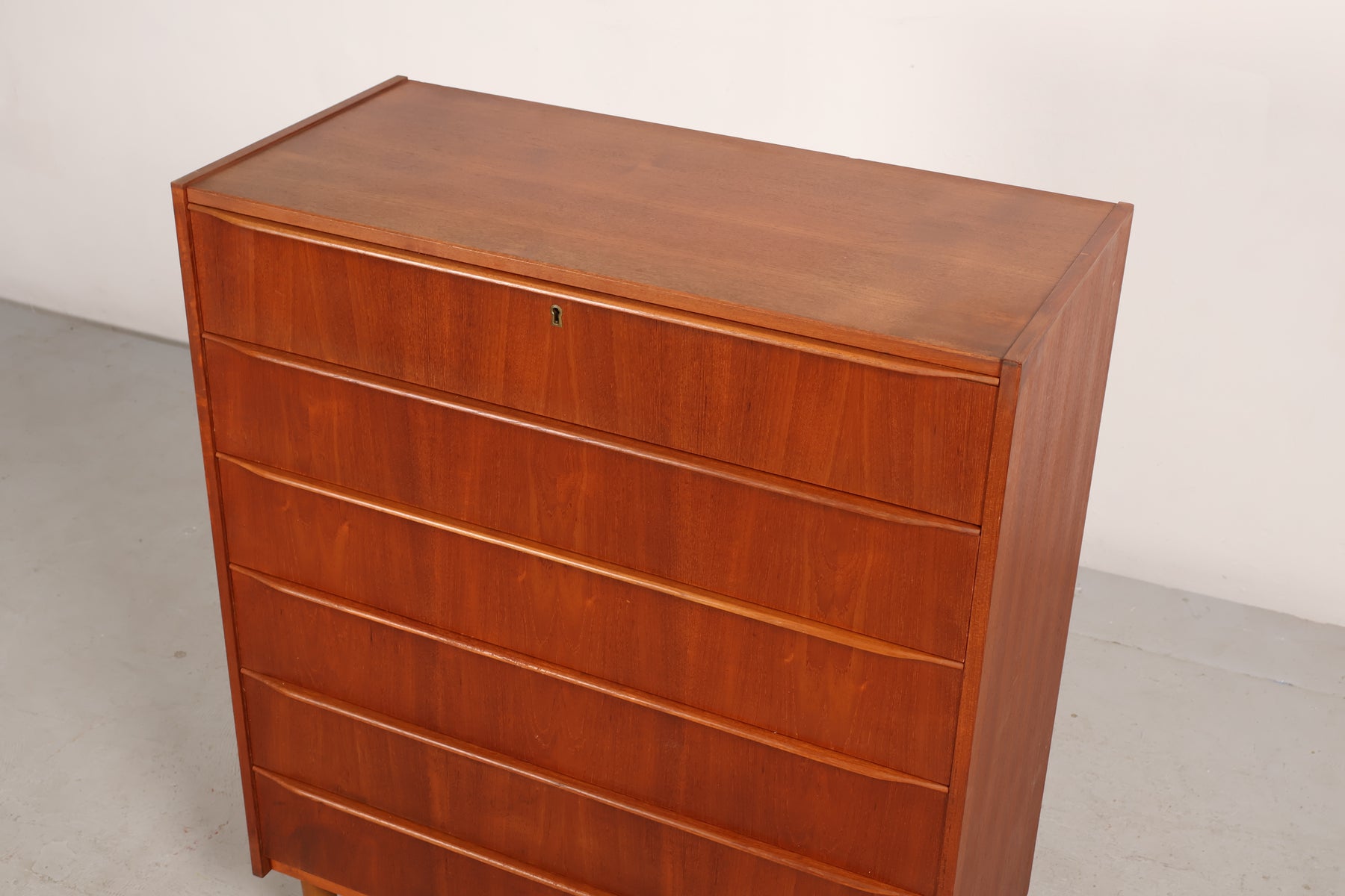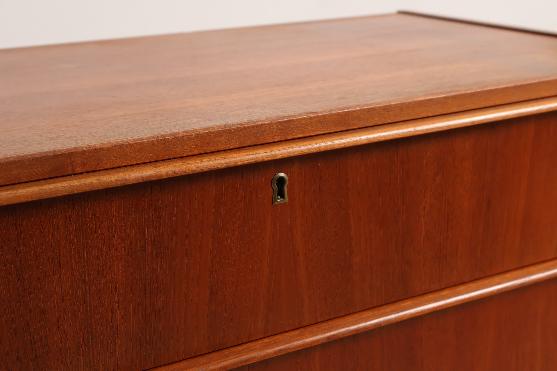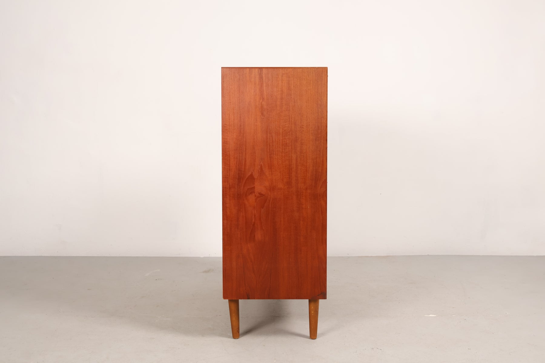 Kommode aus den 60er-Jahren. Hergestellt in Dänemark. Gefertigt aus Teak. Höhe 110 cm, Breite 89 cm, Tiefe 43 cm.