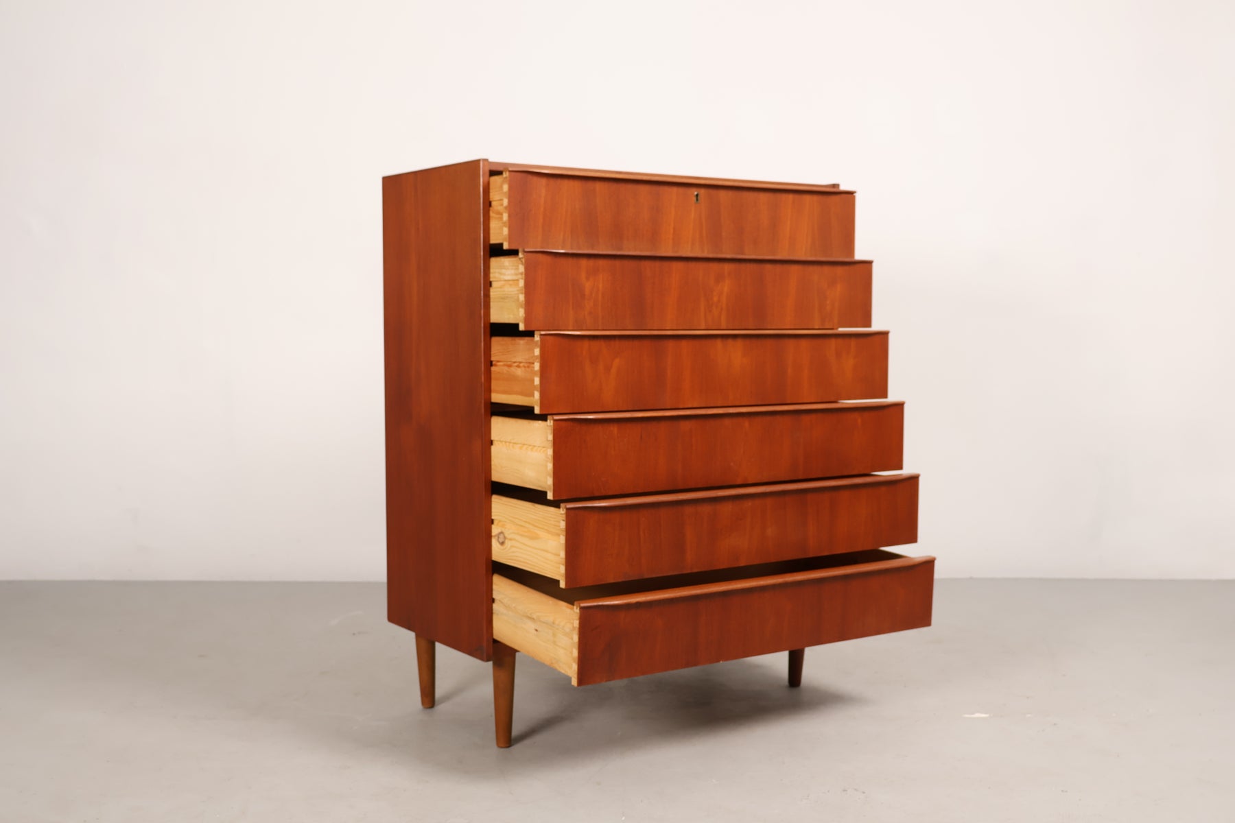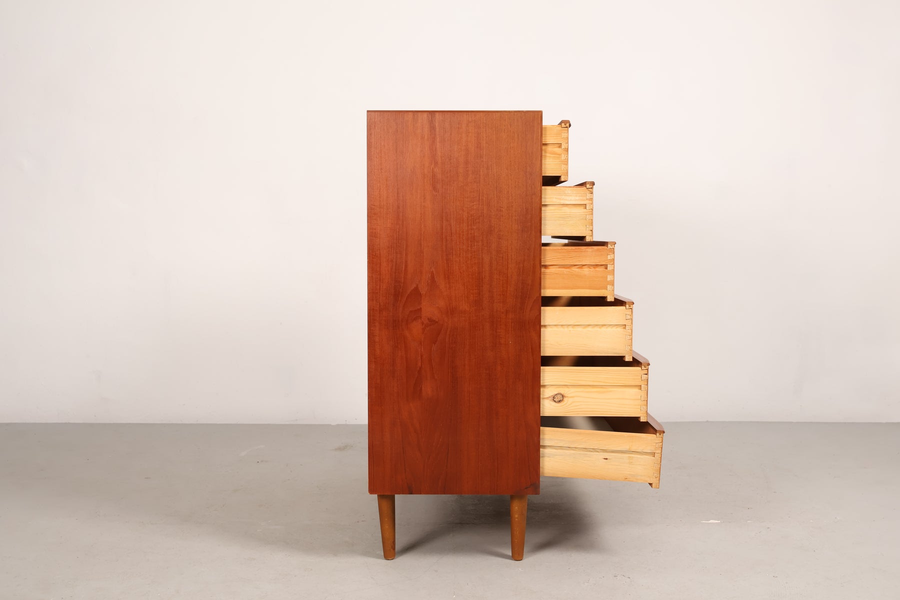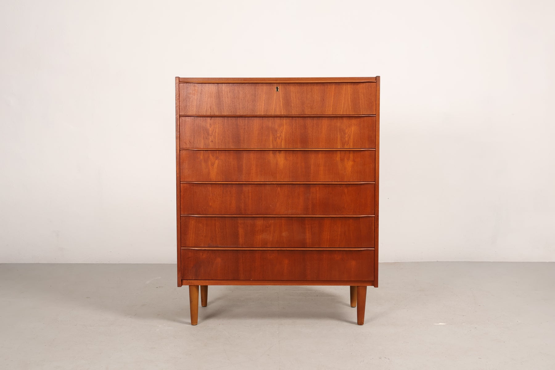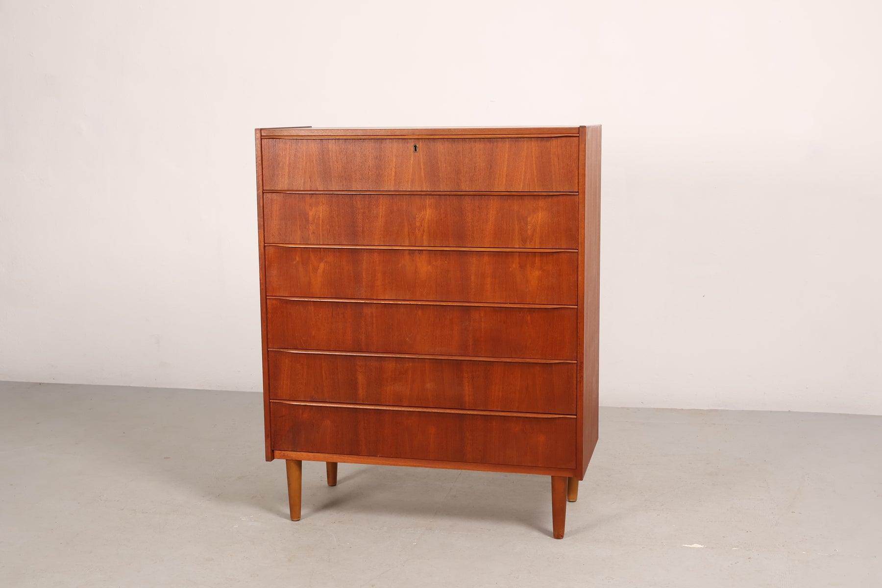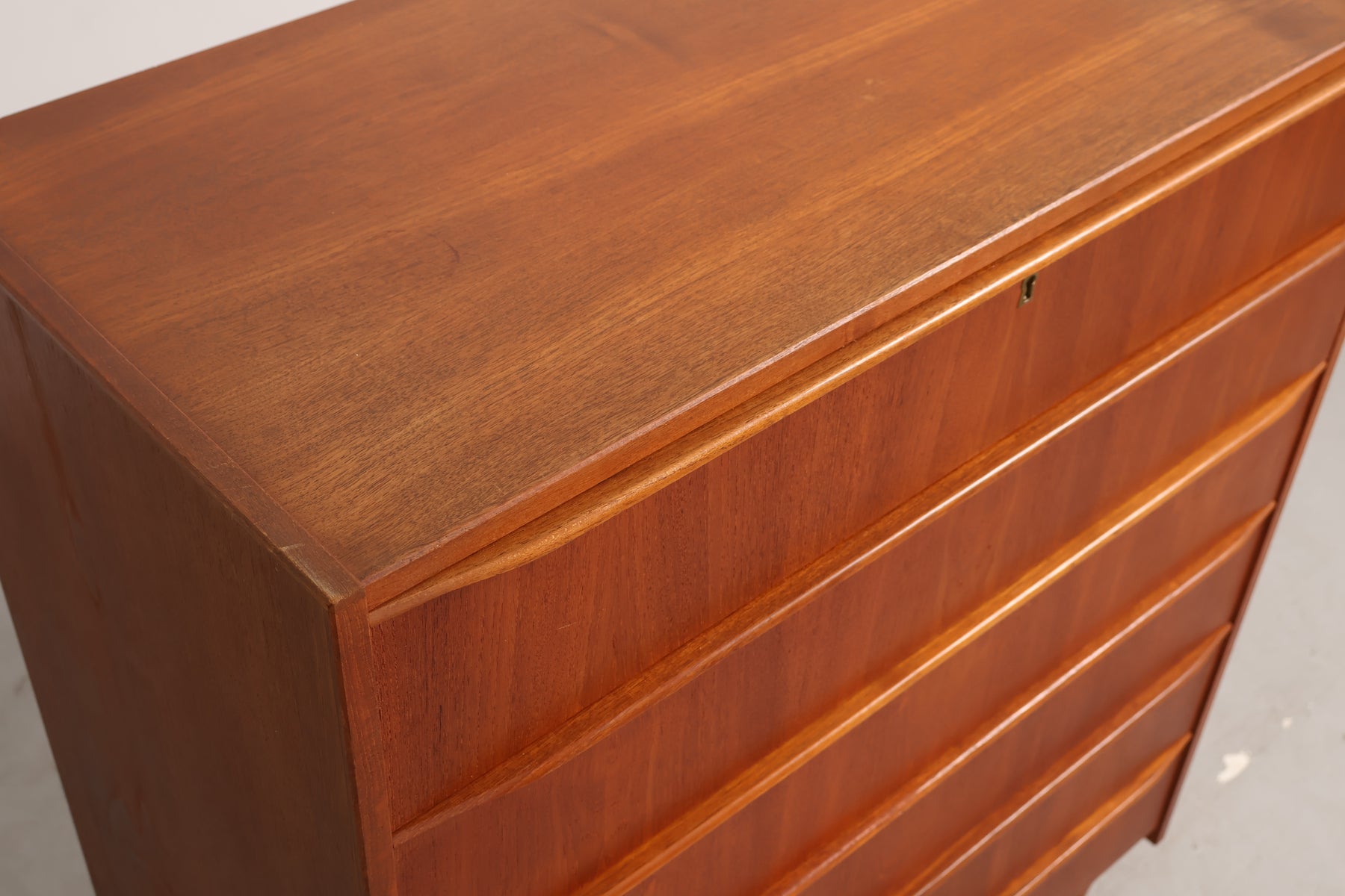 Kommode aus den 60er-Jahren. Hergestellt in Dänemark. Gefertigt aus Teak. Höhe 110 cm, Breite 89 cm, Tiefe 43 cm.