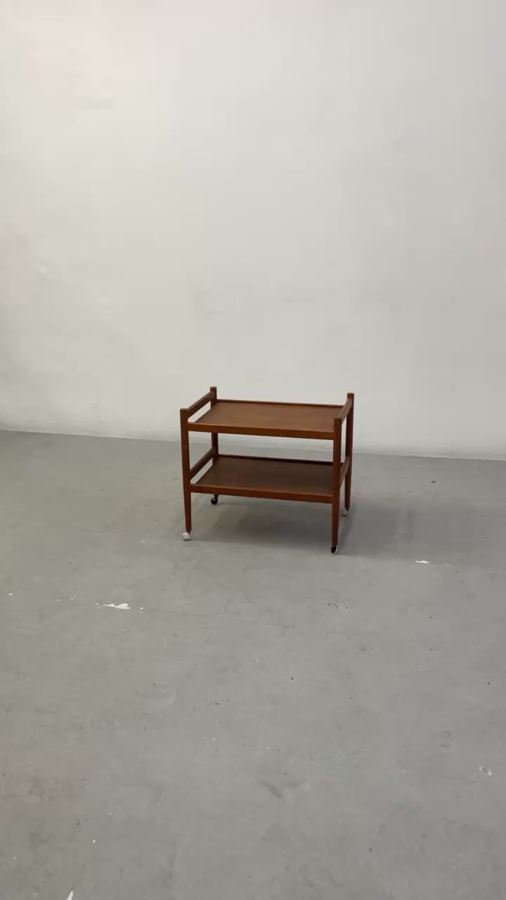 Servierwagen aus den 60er-Jahren. Hergestellt in Dänemark. Gefertigt aus Teak. Höhe 63 cm, Breite 71 cm, Tiefe 47 cm.