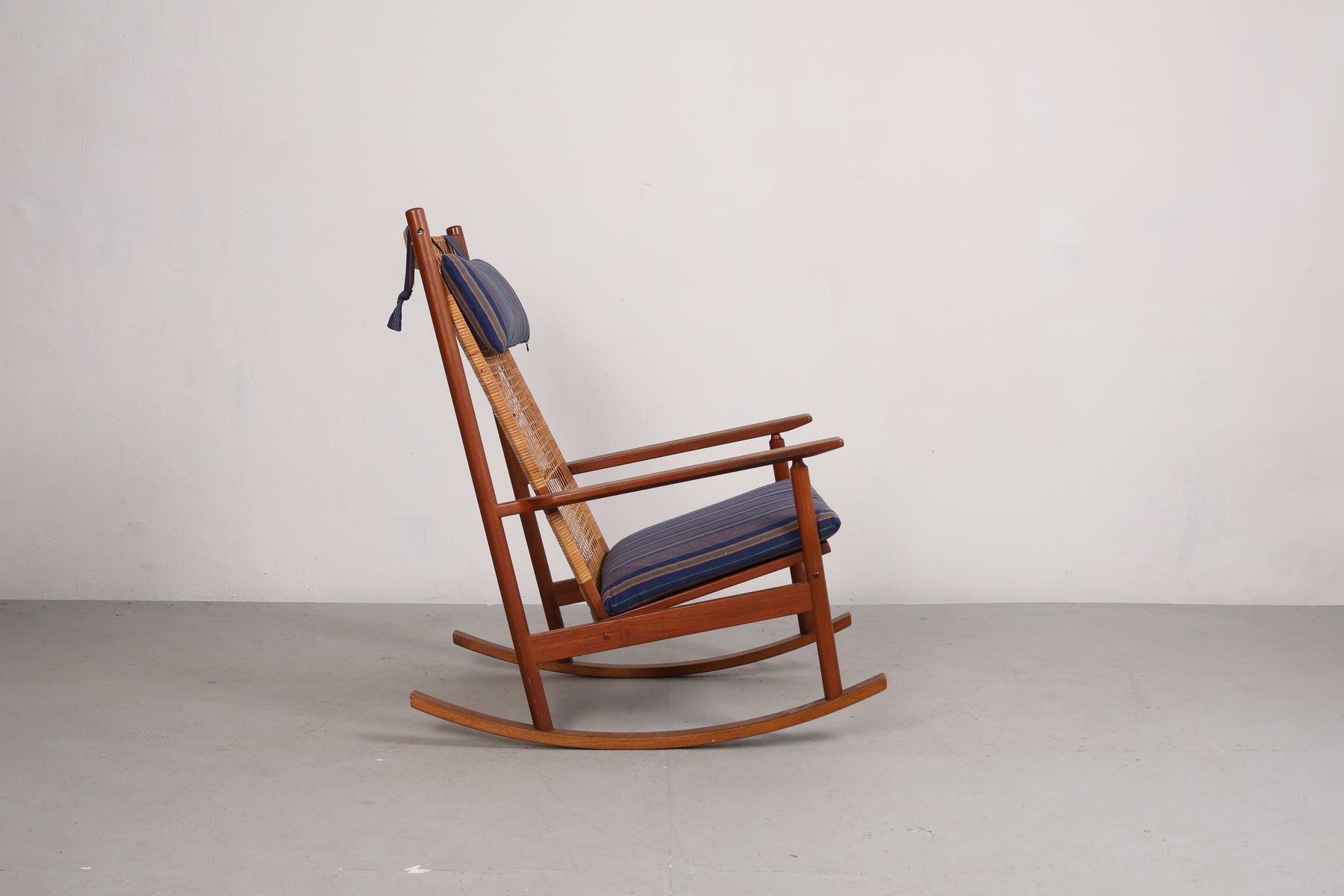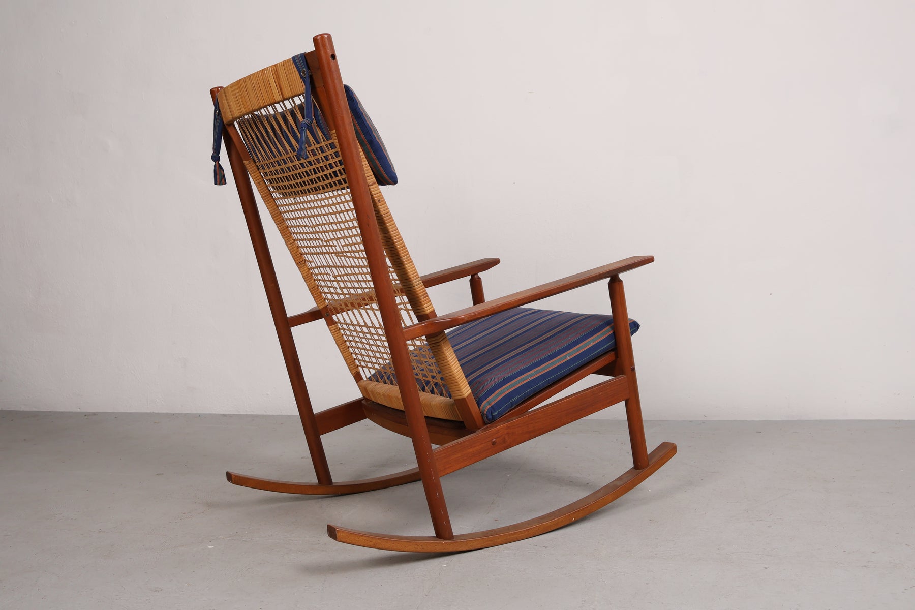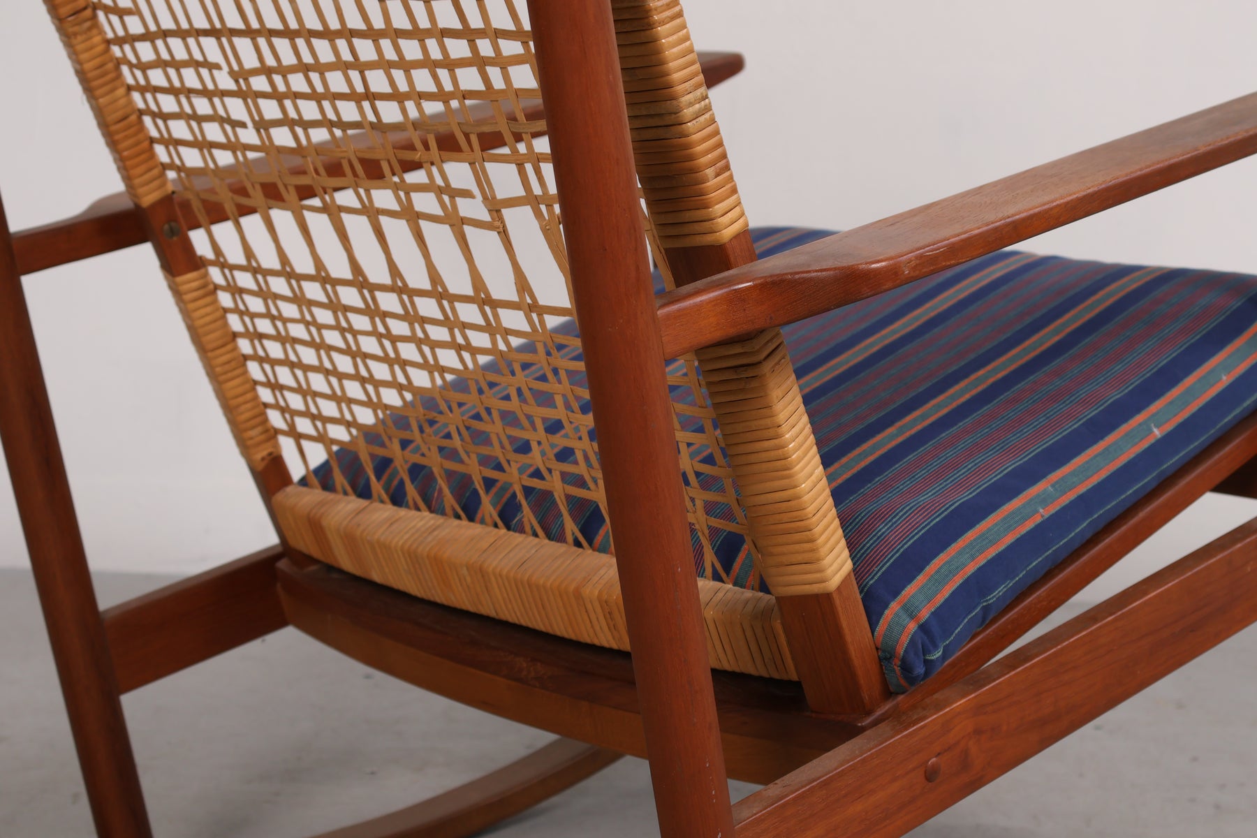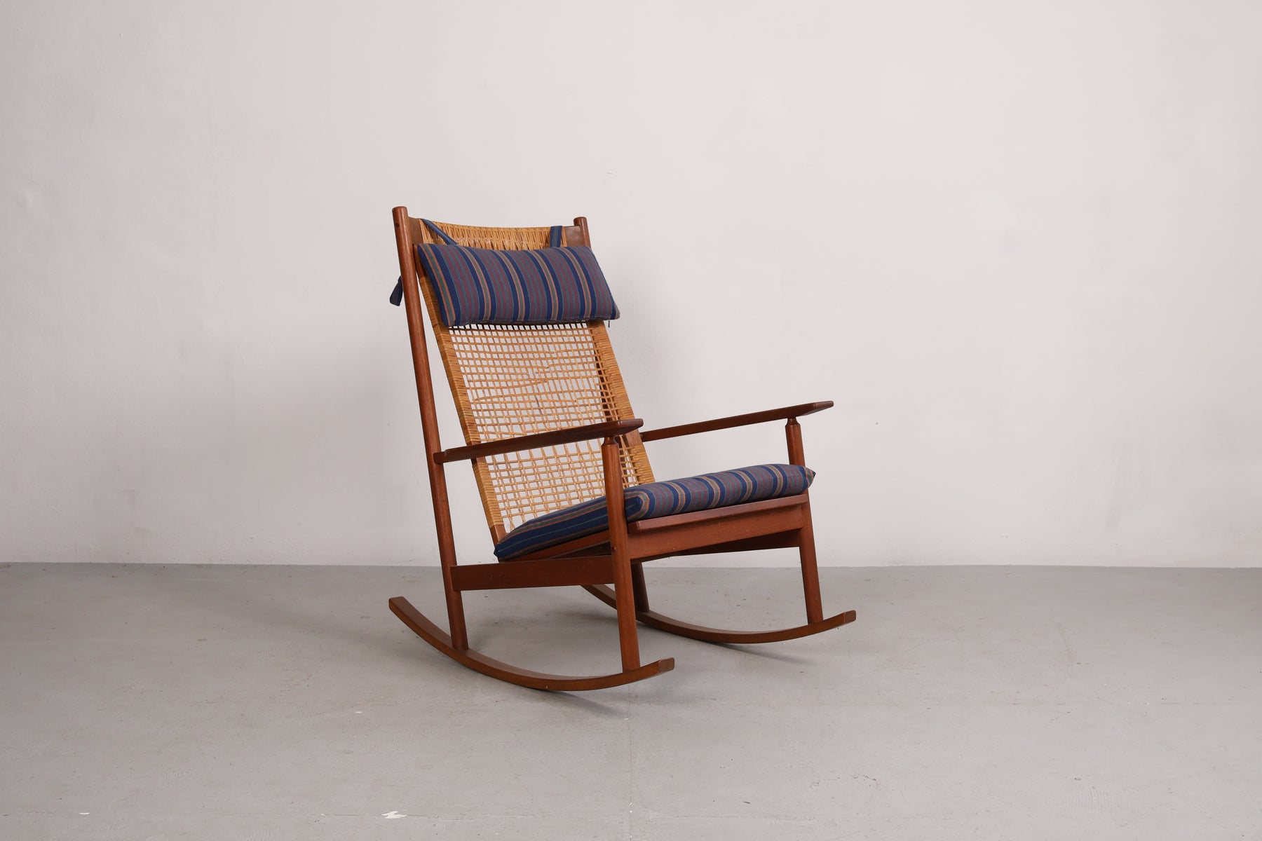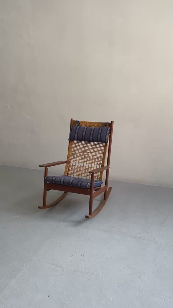 Schommelstoel uit de jaren 60 van Jul Kristensen voor Hans Olsen. Gemaakt in Denemarken. Vervaardigd uit teak en papkoord. Hoogte 102 cm, breedte 66 cm, diepte 89 cm.