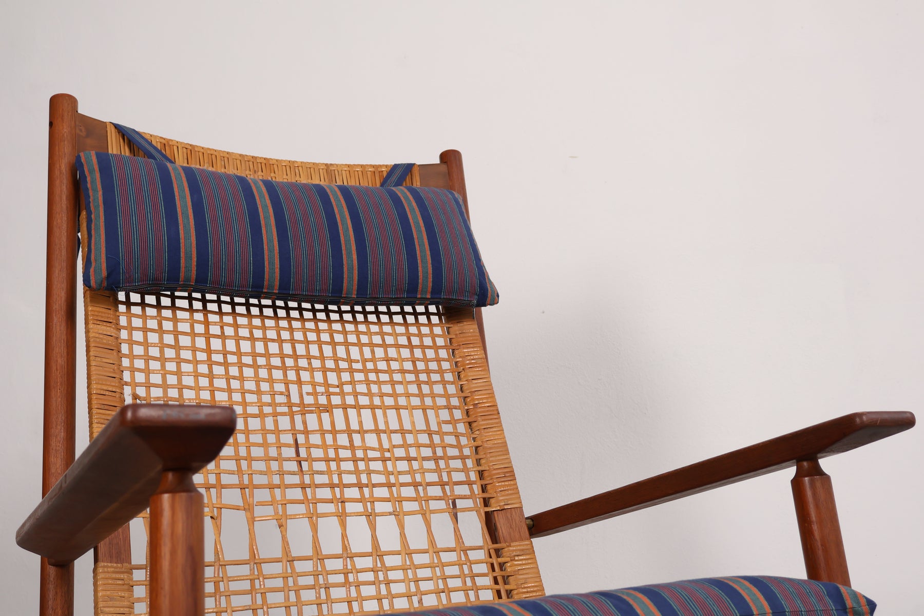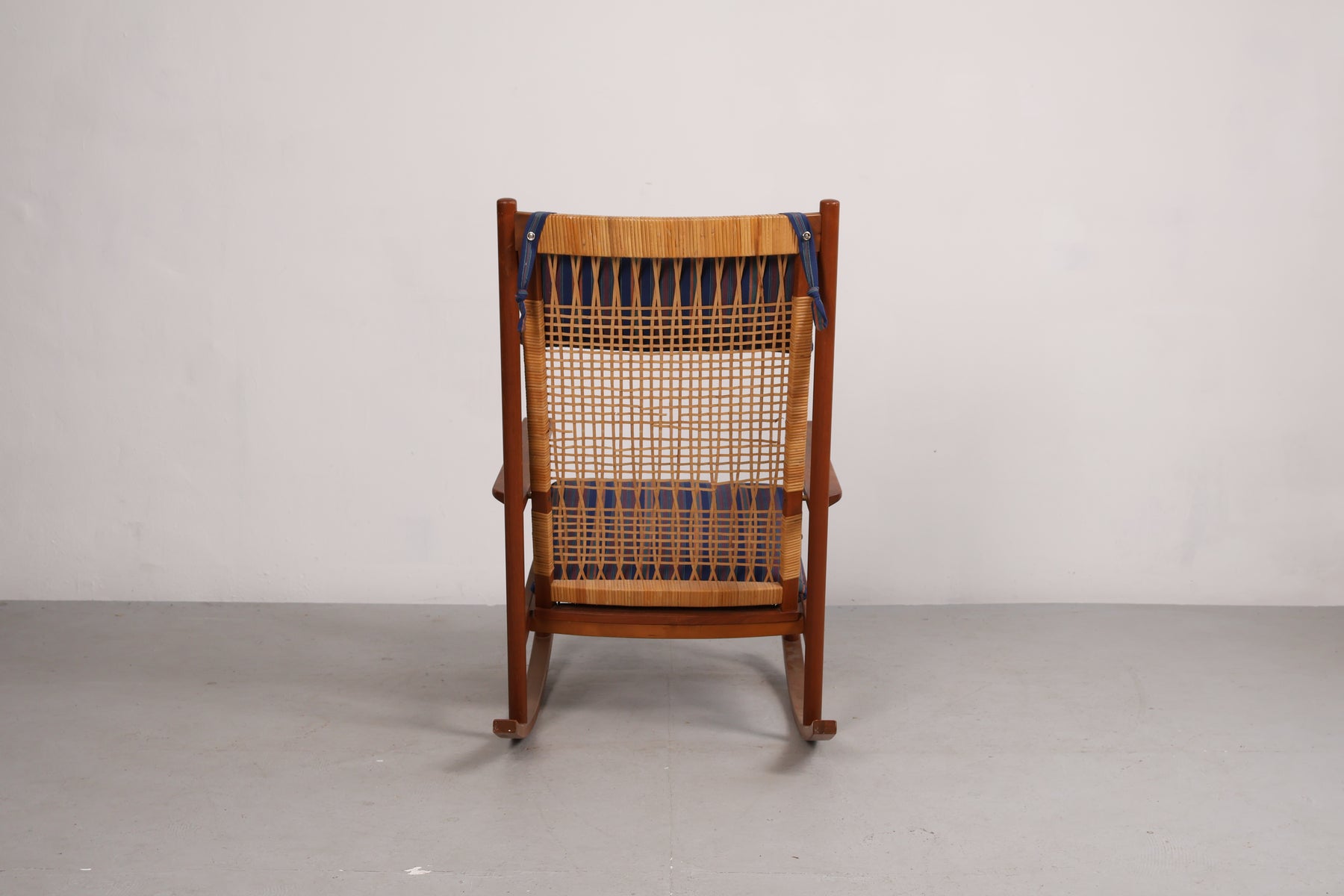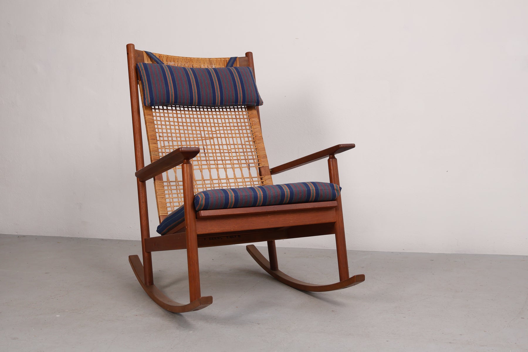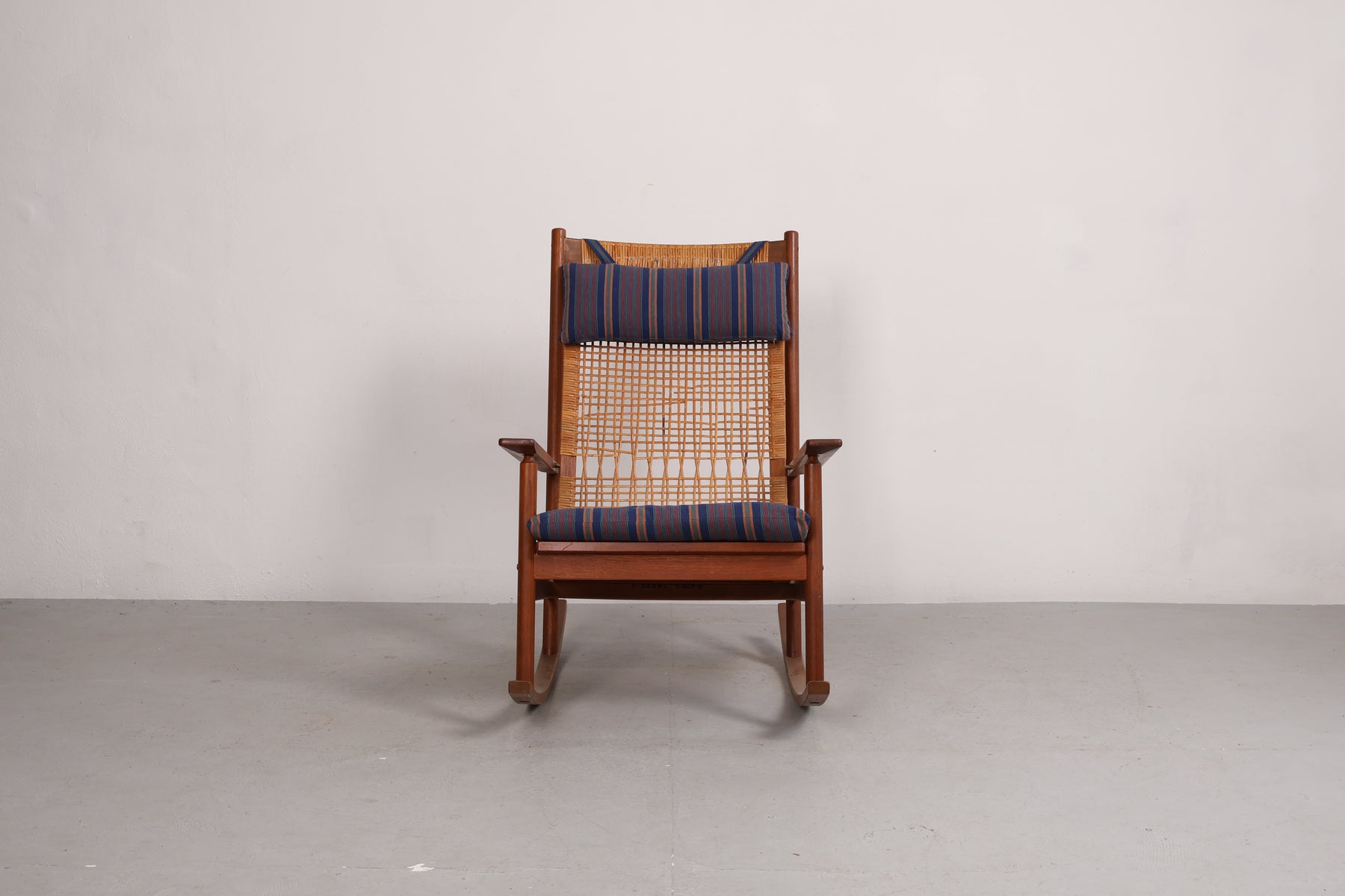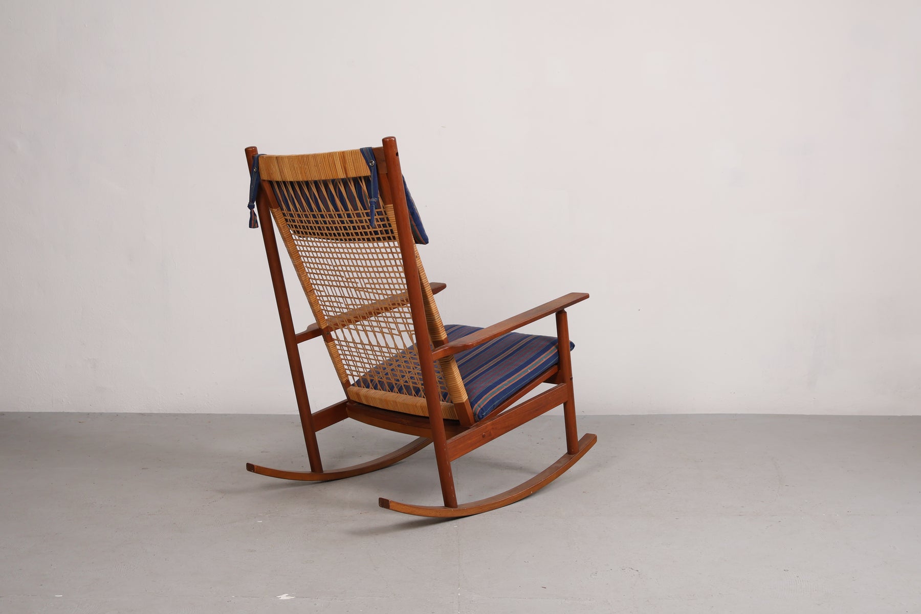 Schommelstoel uit de jaren 60 van Jul Kristensen voor Hans Olsen. Gemaakt in Denemarken. Vervaardigd uit teak en papkoord. Hoogte 102 cm, breedte 66 cm, diepte 89 cm.