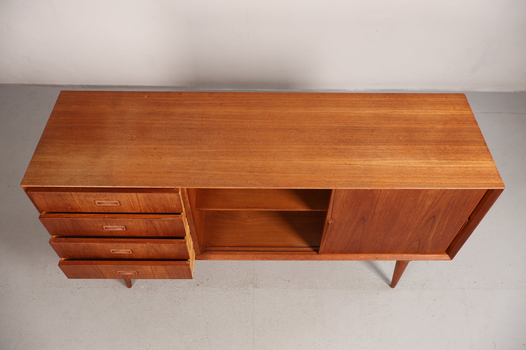 Dressoir uit de jaren 60 van Omann Jun. Gemaakt in Denemarken. Vervaardigd uit teak. Hoogte 35 cm, breedte 160 cm, diepte 48 cm.