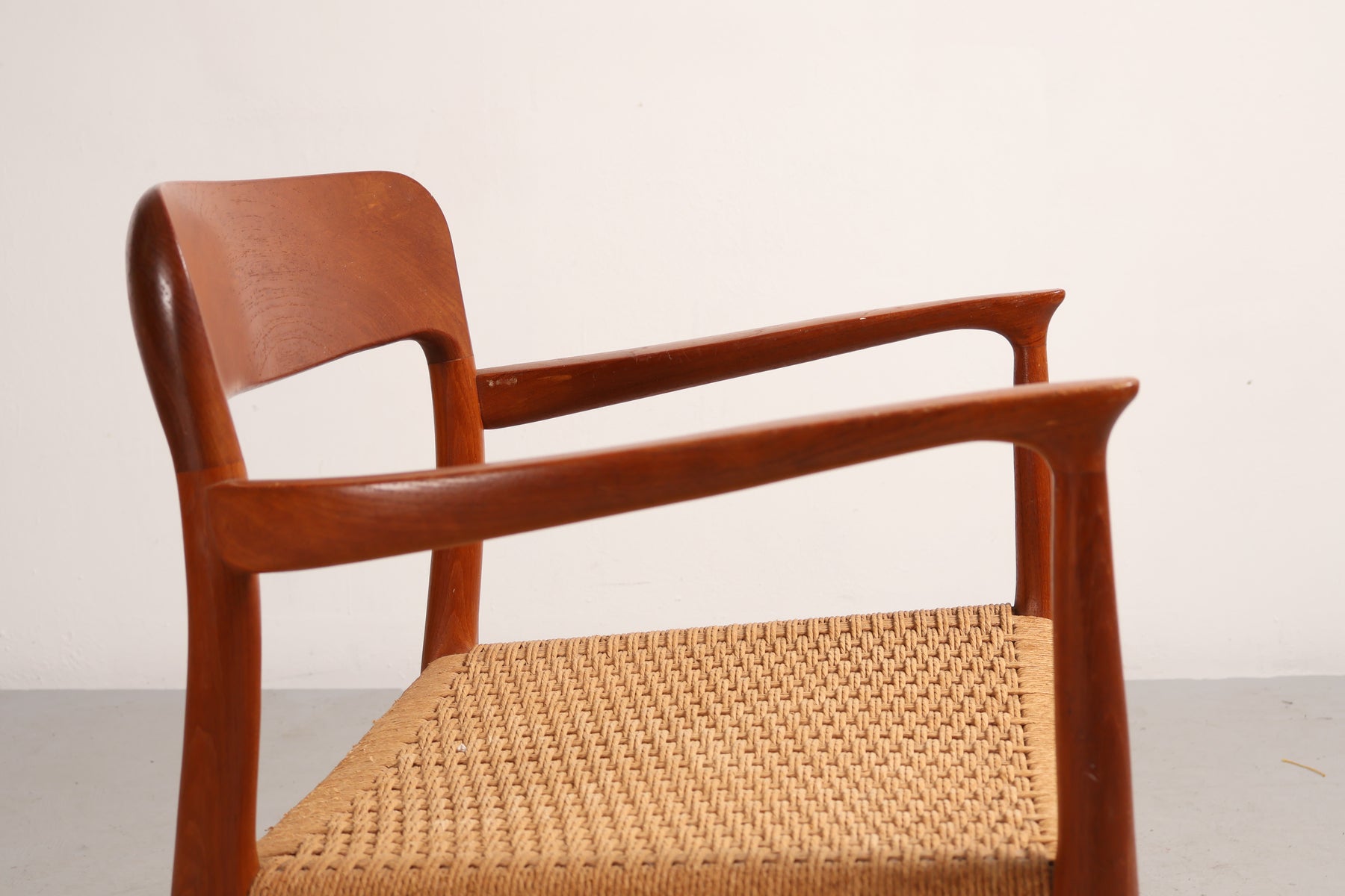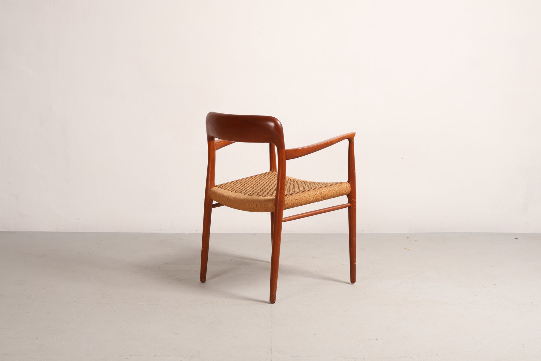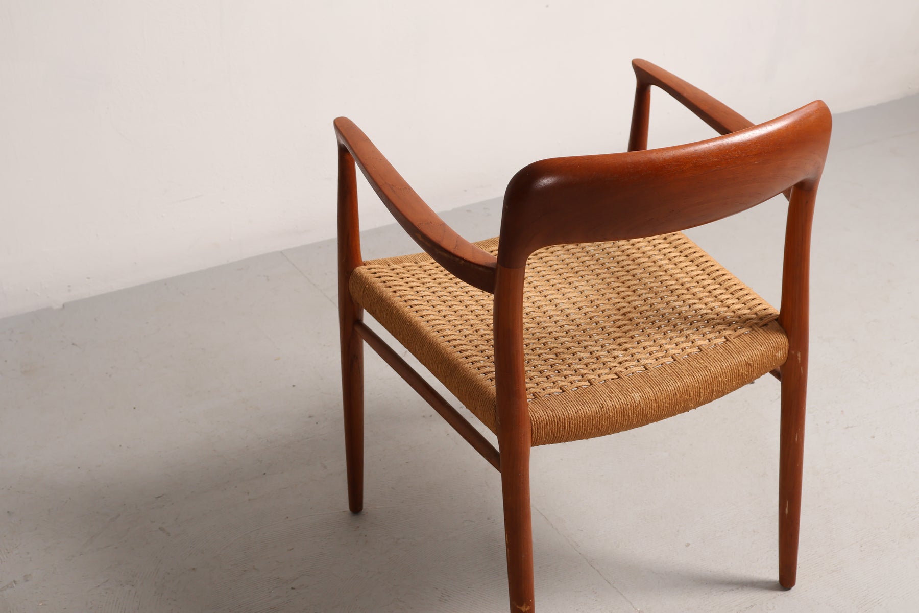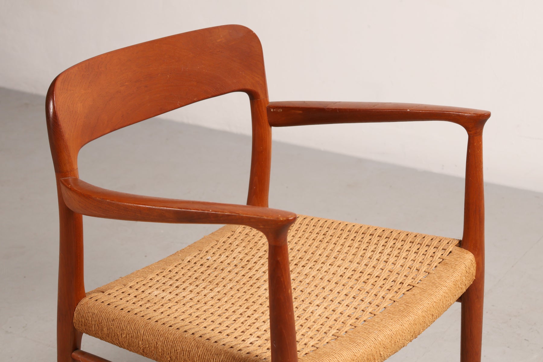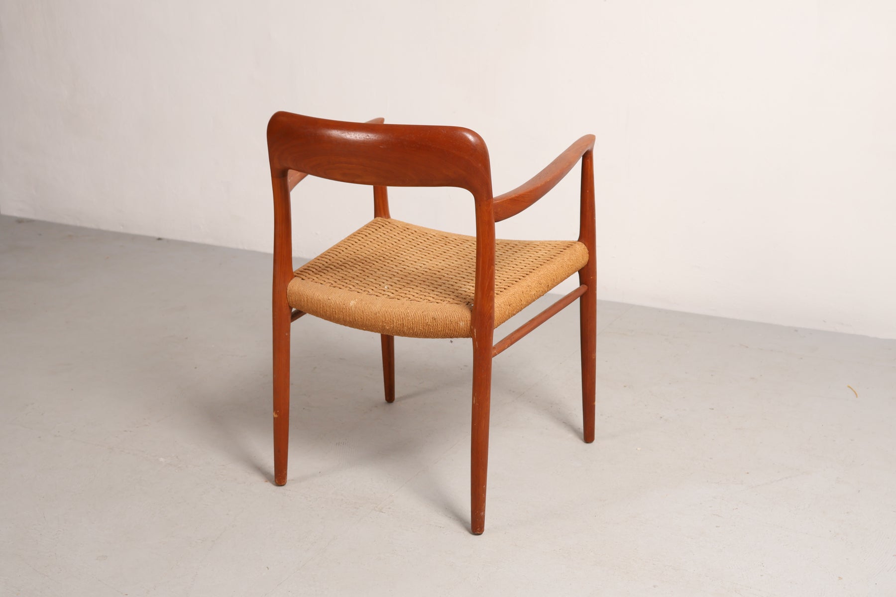 Stoel “Model 56” uit de jaren 60 van Niels Otto Møller. Gemaakt in Denemarken. Vervaardigd uit teak en papkoord. Hoogte 77 cm, breedte 58 cm, diepte 52 cm.