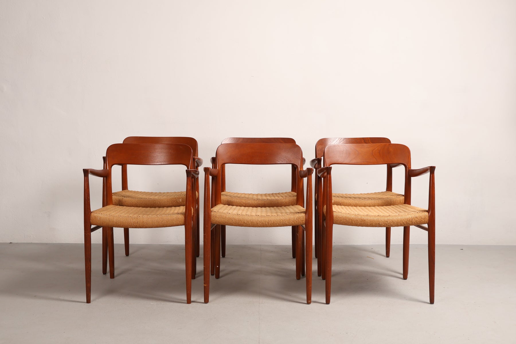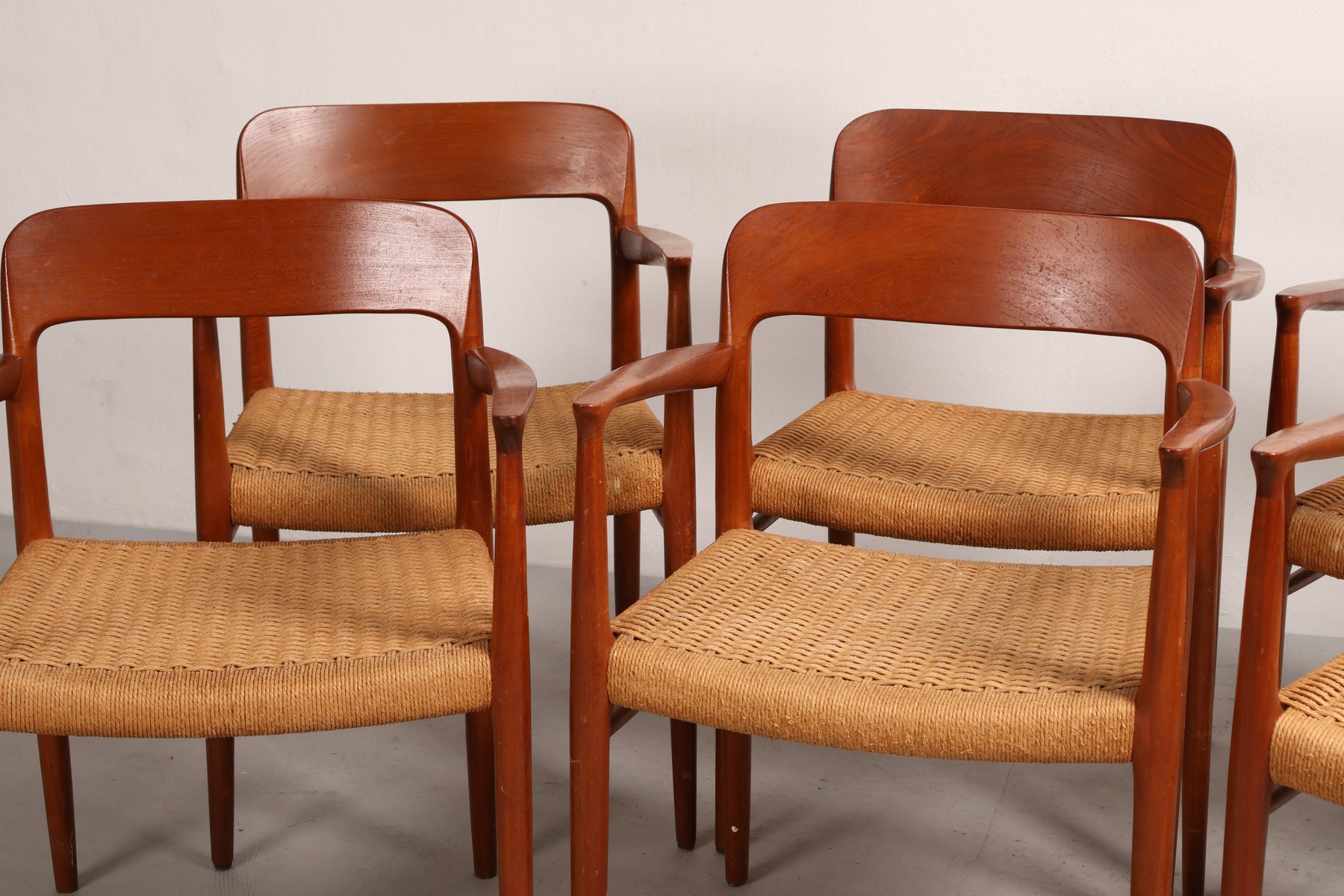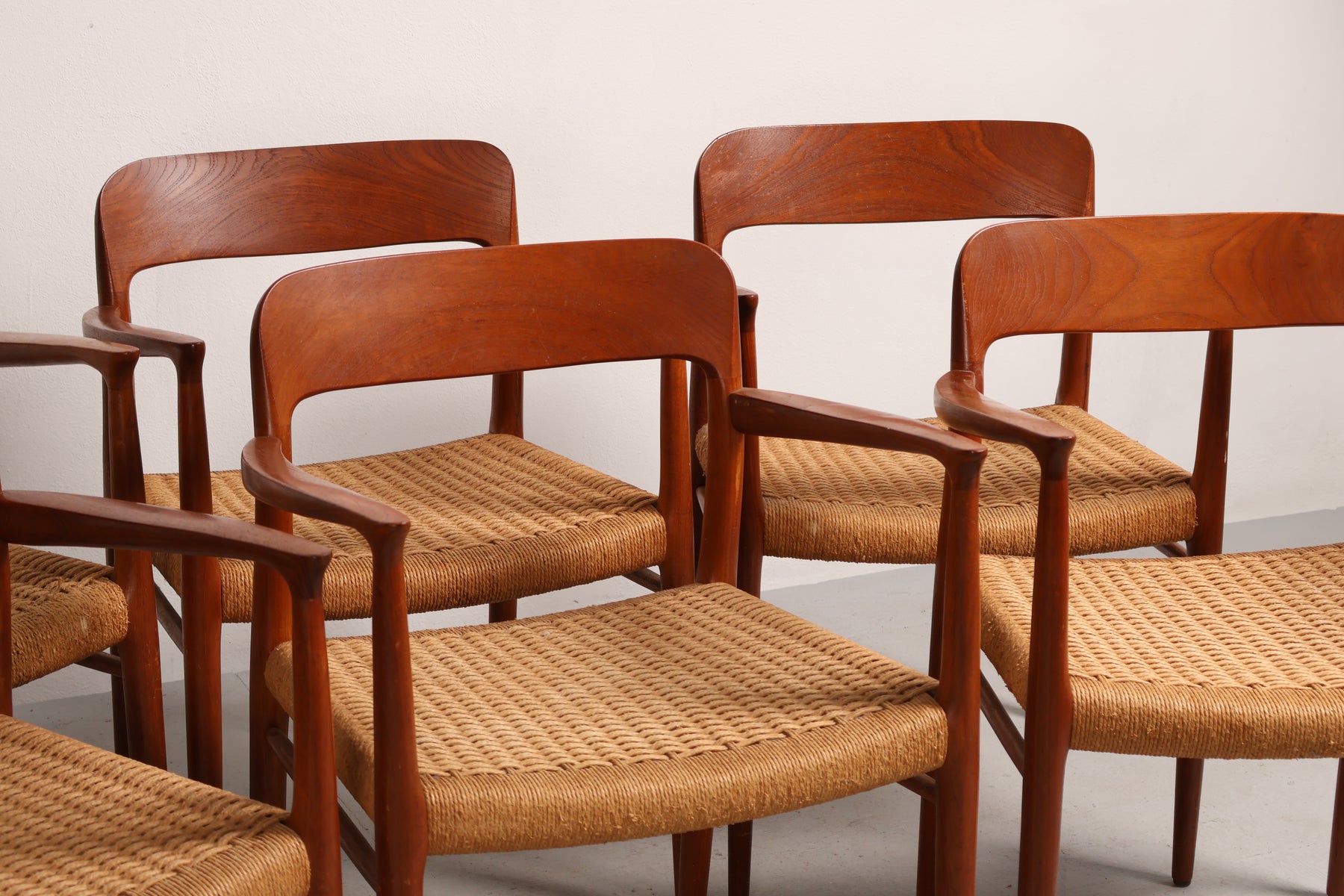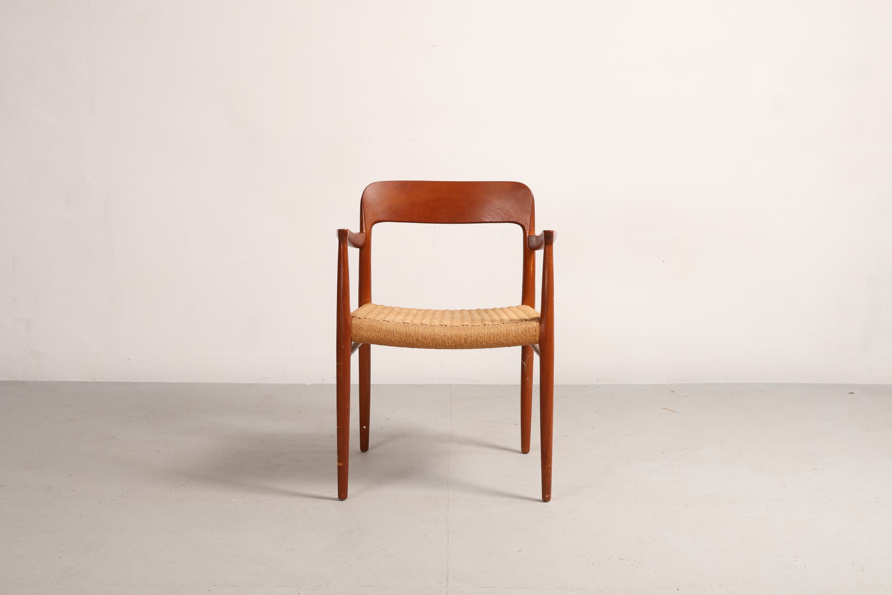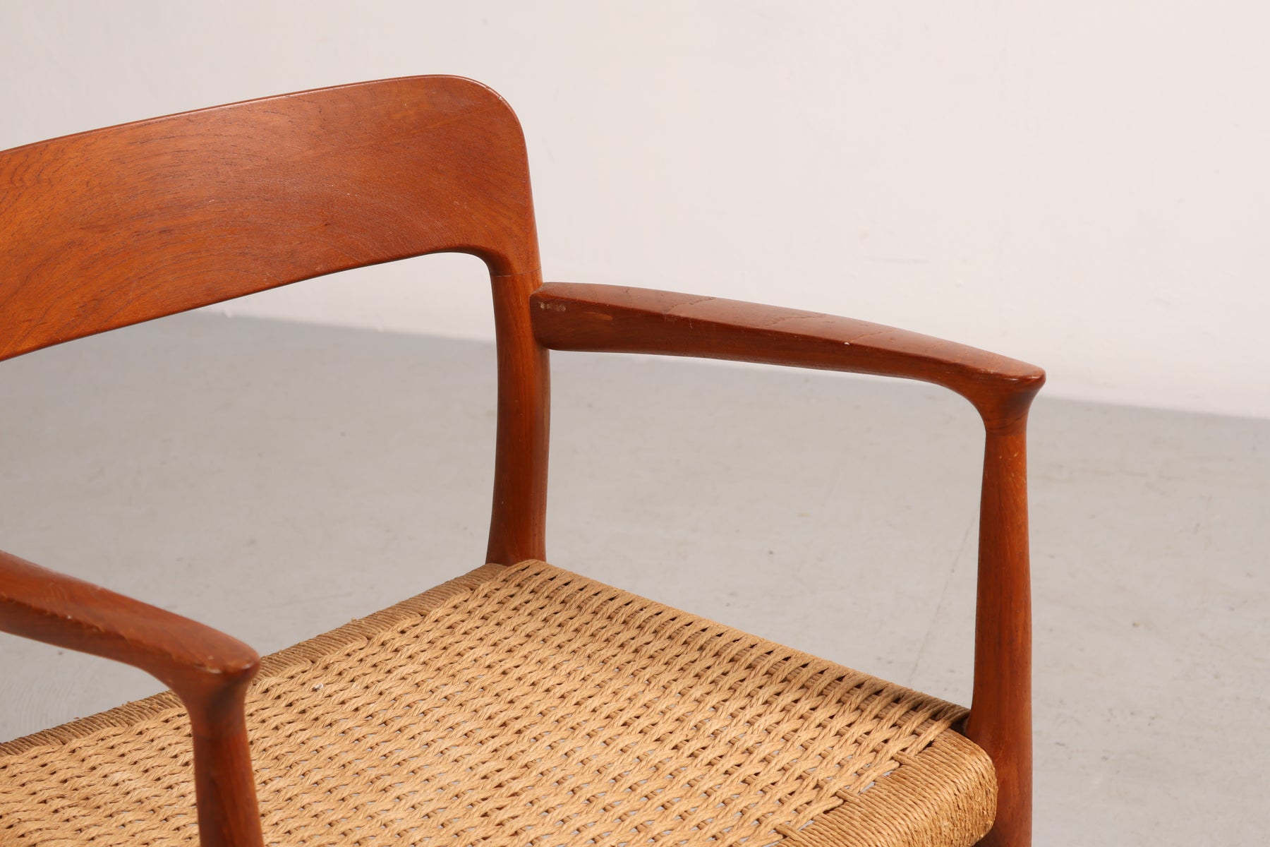 Stoel “Model 56” uit de jaren 60 van Niels Otto Møller. Gemaakt in Denemarken. Vervaardigd uit teak en papkoord. Hoogte 77 cm, breedte 58 cm, diepte 52 cm.