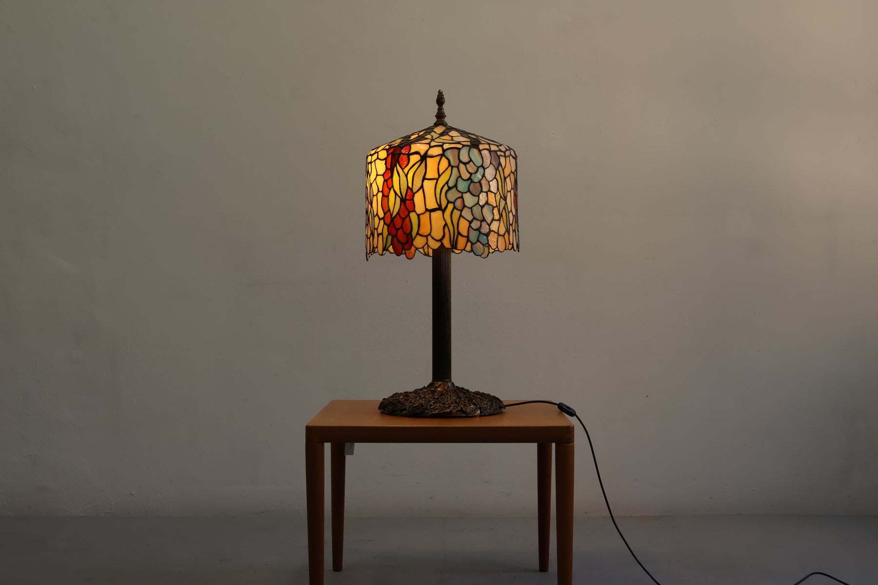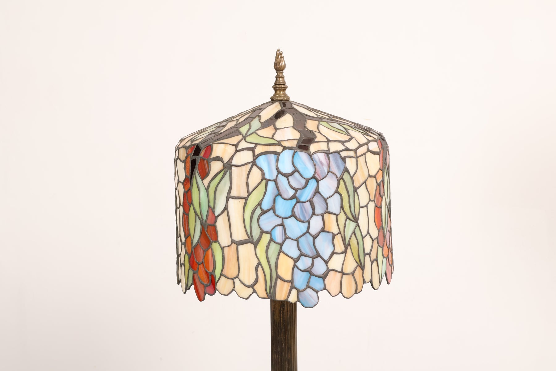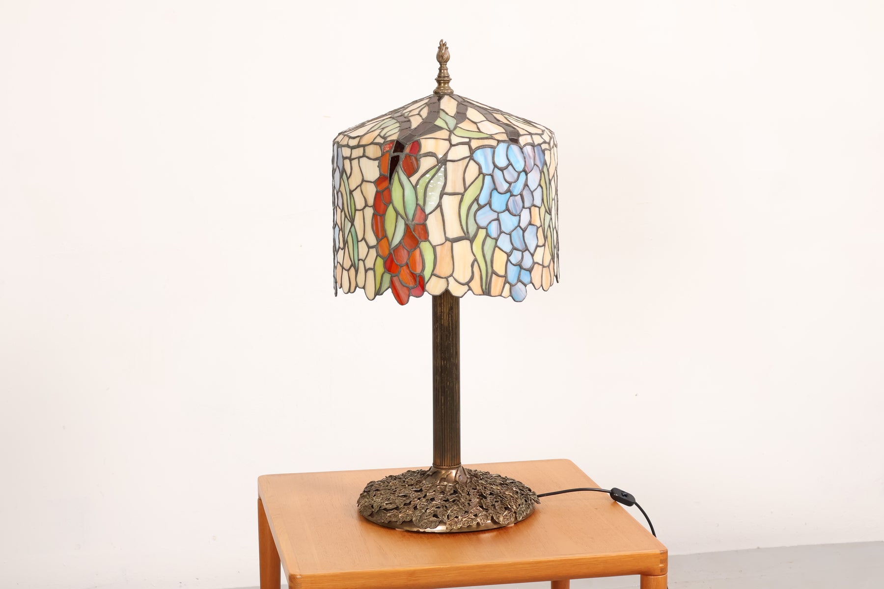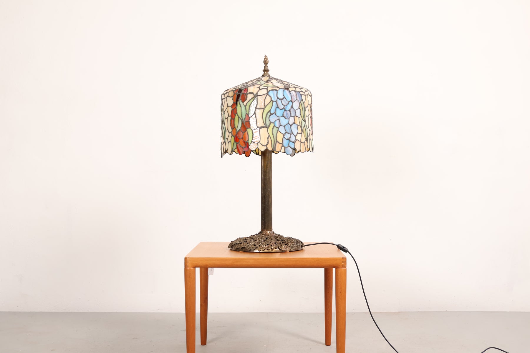 Tischlampe aus den 60er-Jahren von Tiffany-Stil. Hergestellt in USA. Gefertigt aus Glas, Messing. Höhe 87 cm, Breite 41 cm, Tiefe 41 cm.